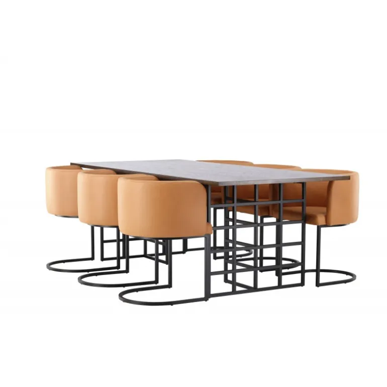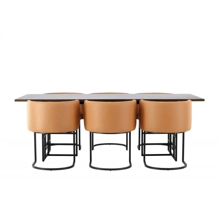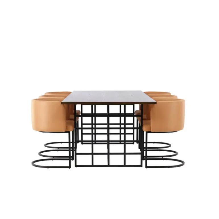 Skab en luksuriøs atmosfære i dit hjem og lad dette modebevidste spisestuesæt sætte tonen i din indretning! Vores rektangulære spisebord i industrielt design fra Ystad-serien imponerer hurtigt både dig og dine gæster. Med en smuk mørkebrun rektangulær bordplade lavet af MDF med egetræsfiner passer dette bord perfekt ind i enhver moderne indretningsstil. Bordets to dekorative baser i sort metal med industrielt design er prikken over i’et. Bordets dimensioner: 100x220cm. Her parret med vores komfortable spisebordsstole i moderne stil fra Simrishamn-serien. Denne stol er en kombination af stil og komfort og vil være en luksuriøs detalje omkring dit spisebord. Stolens fuldt polstrede sæde, beklædt med en elegant brun TC-stof, tilbyder en blød og behagelig siddeplads under lange måltider fyldt med latter og samtale. Ryglænet har en afrundet form, der giver ekstra støtte og komplementerer perfekt spisebordets moderne æstetik. Med sin minimalistiske sorte stålramme er Simrishamn-stolen et kunstværk i sig selv og giver en elegant kontrast til spisebordets design. Hvad mere kan man ønske sig? Dette spisestuesæt har det hele!