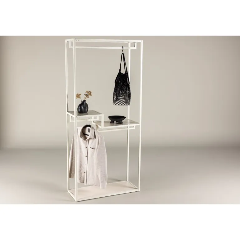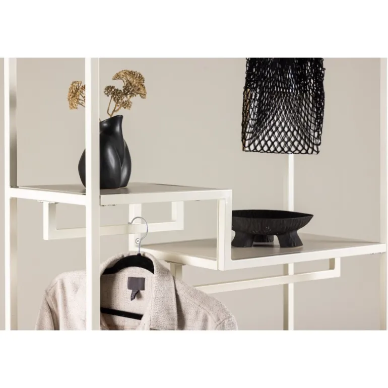 Omfavn en ny æra af stil og orden med vores tøjstativ Staal. Fremstillet i robust stål og klædt i en blød beige nuance, er Staal ikke kun en funktionel løsning, men også et moderne interiørdetalje, der løfter atmosfæren i dit hjem. Staals elegante og moderne design giver det en tidløs æstetik, der passer ind i forskellige rum. Den bløde beige farve skaber en rolig og harmonisk atmosfære, hvilket gør Staal til en perfekt tilføjelse både i soveværelset og i entréen. Placer det, hvor du har brug for både stil og organisation. Hvad der gør Staal unikt er de smarte hylder. To mindre hylder giver dig mulighed for at arrangere smykker, foldet tøj eller andre små accessories, mens den større hylde giver plads til større genstande eller måske et dekorativt element. Og som om det ikke var nok – Staal tilbyder også plads til bøjler, hvilket gør det til en komplet løsning for dine tøjopbevaringsbehov. Placer og organiser dine tøj og accessories med lethed ved hjælp af Staal. Det er ikke kun et praktisk tøjstativ, men også et stilfuldt møbel, der sætter tonen i rummet. Staal giver dig mulighed for at kombinere funktion og æstetik på en moderne og imponerende måde. Vælg Staal – din pålidelige ledsager til at skabe orden og moderne stil i hver del af dit hjem!