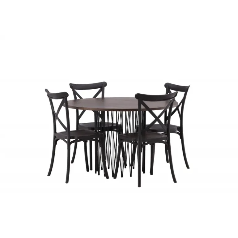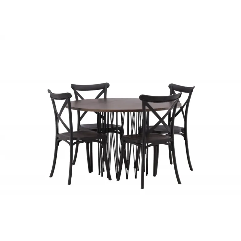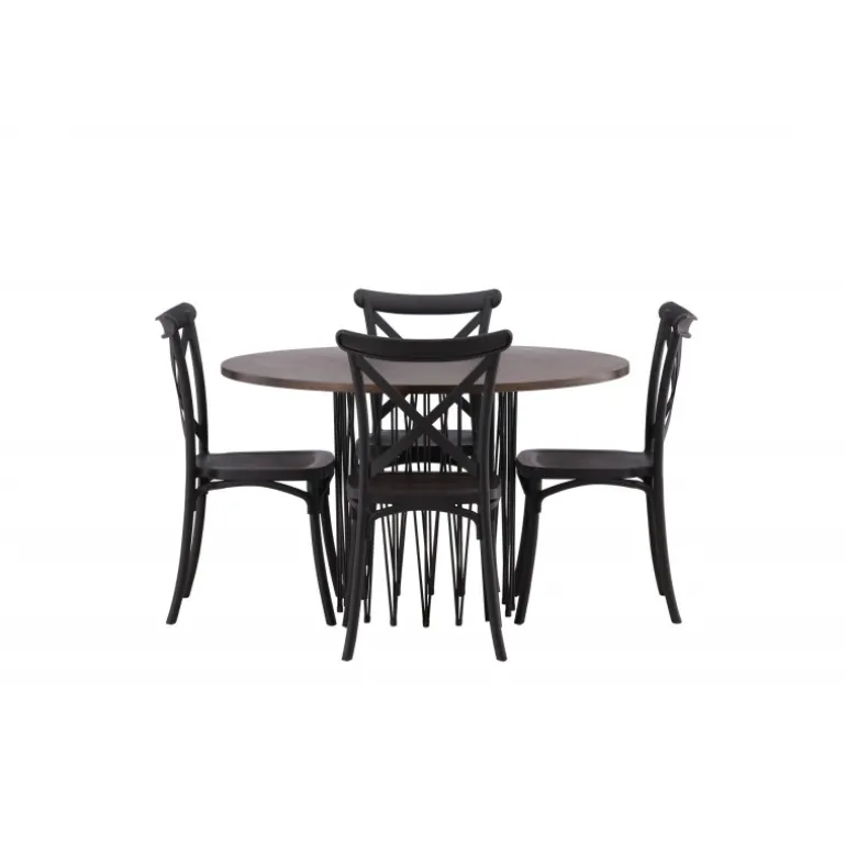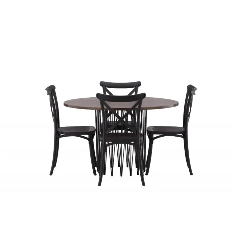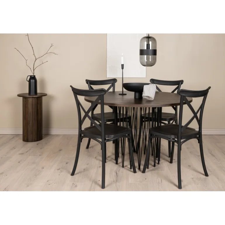 En Spisebordssæt, der kombinerer klassisk design og moderne former! Vores runde spisebord Sten har et dejligt skandinavisk design, der passer til enhver samling. Bordet har en smuk brun bordplade i MDF med finer og en dekorativ cylinderformet ramme i sort metal. Her sammen med spisebordsstole fra Crosett-serien. Stolene har et nostalgisk design med krydset ryg og lige linjer, konsekvent lavet af sort plastik. Her får du en stilfuld Spisebordssæt til at møblere dit hjem med!