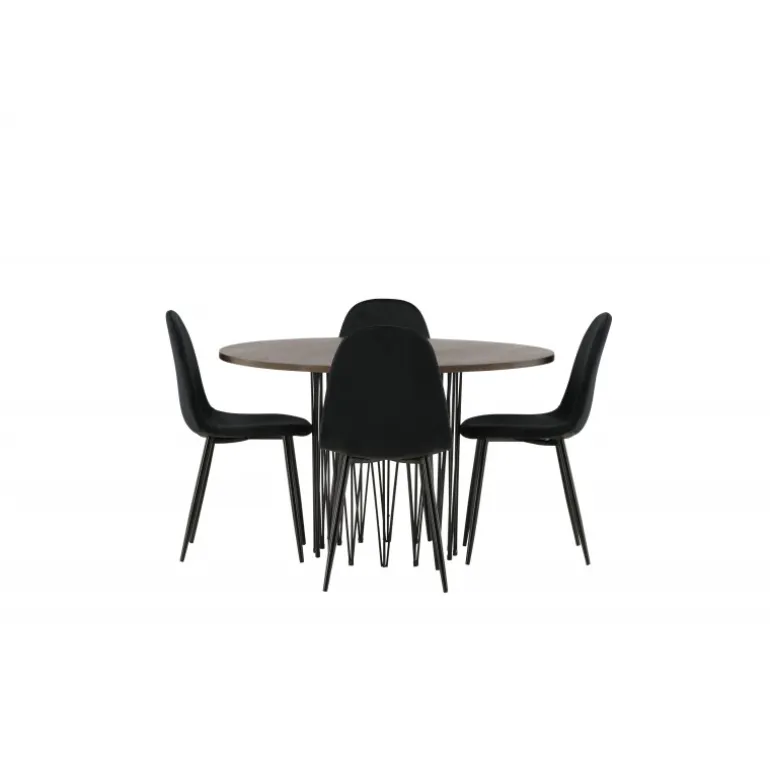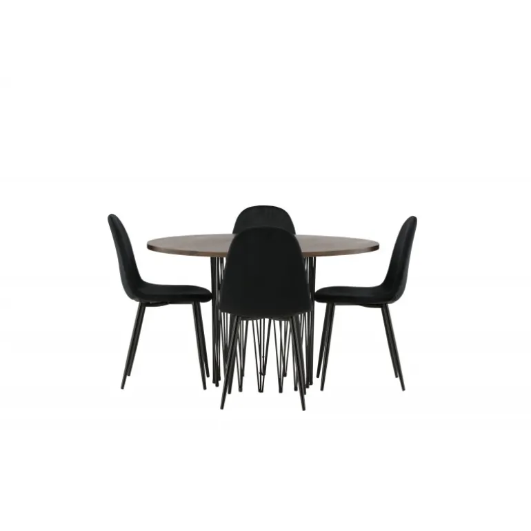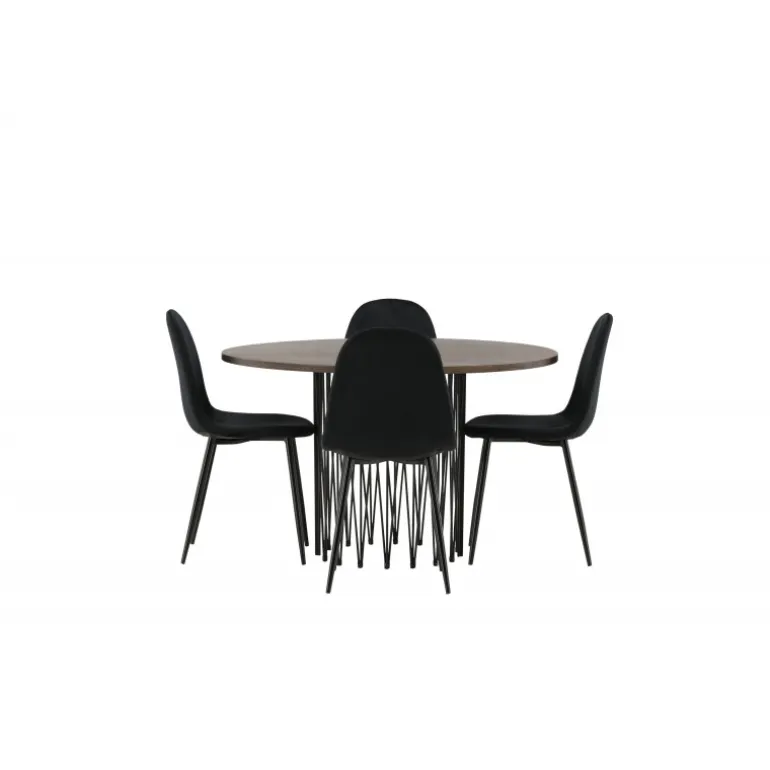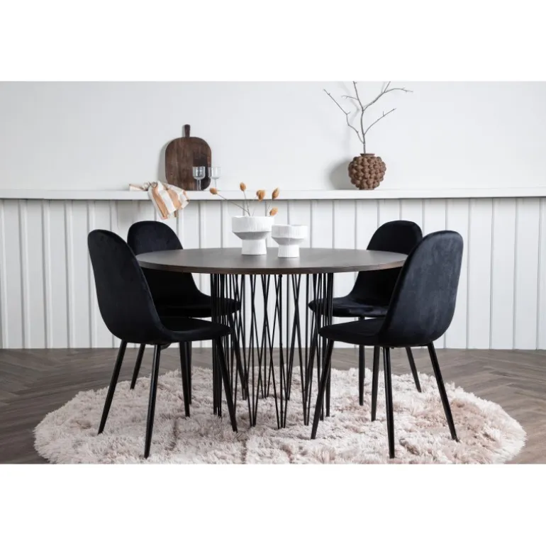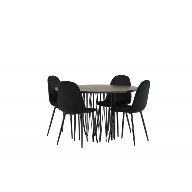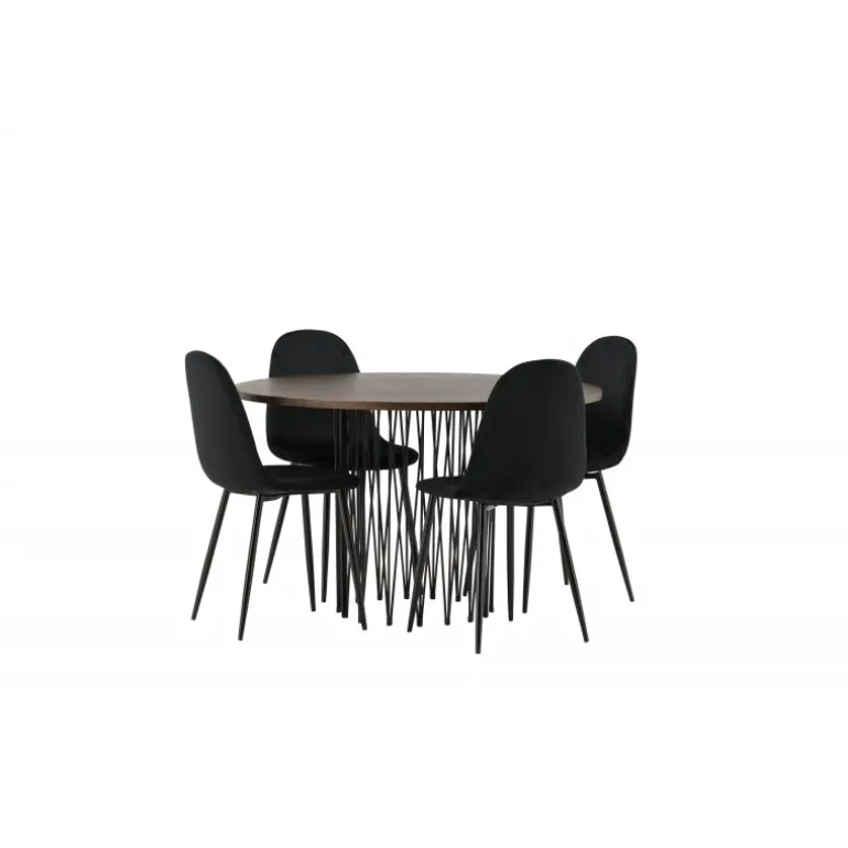 Et Spisebordssæt, der hurtigt skaber en indbydende og moderne atmosfære i din stue! Vores runde spisebord Sten har et fantastisk, skandinavisk design, der udstråler charme. Bordet har en smuk brunfarvet bordplade i MDF med finer og en dekorativ cylinderformet ramme i sort metal. Her sammen med komfortable stole fra Polar-serien. Stolen har et fuldt polstret design med rundet ryg og sæde i sort velourstof med blød polstring og ben i sort pulverlakeret metal. Undgå at gå på kompromis mellem komfort og stilfuldt design!