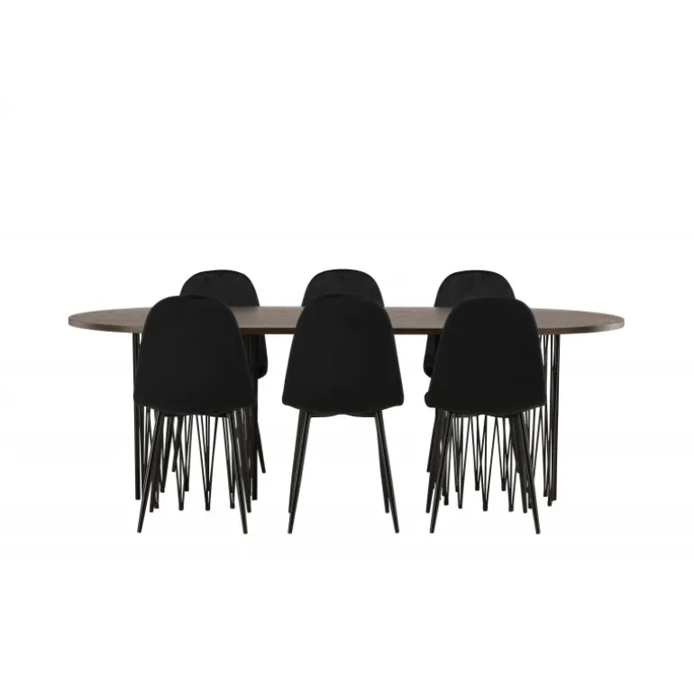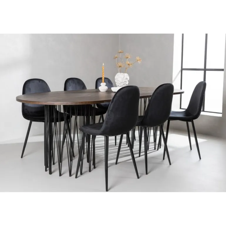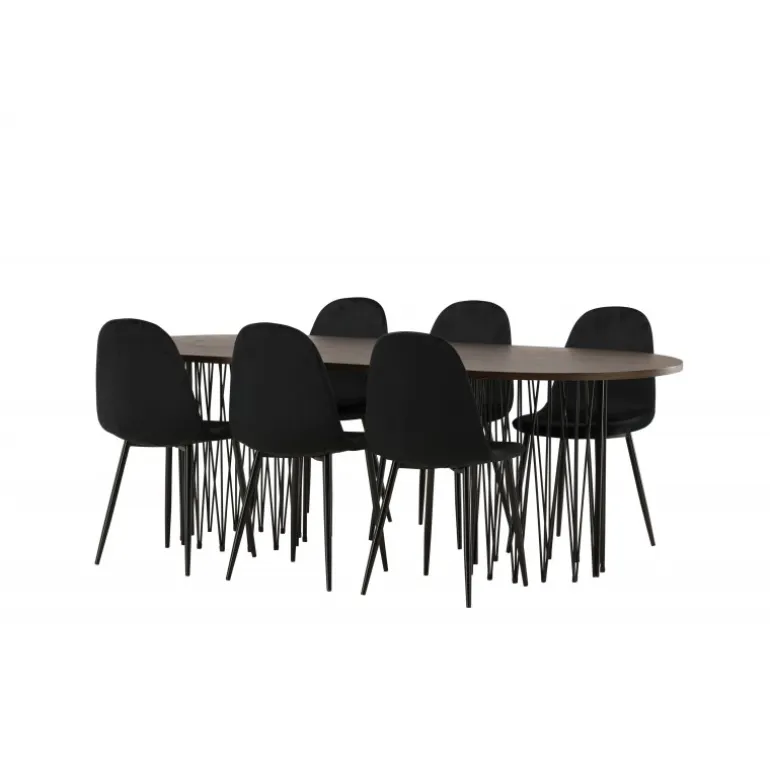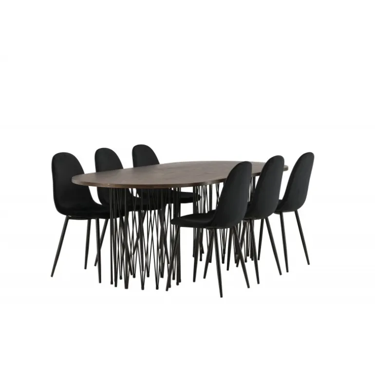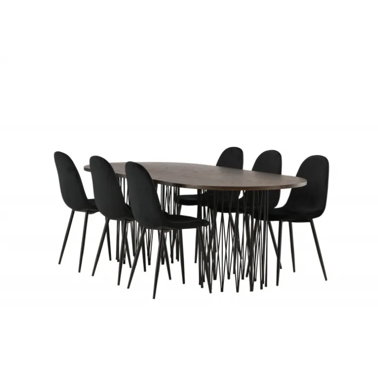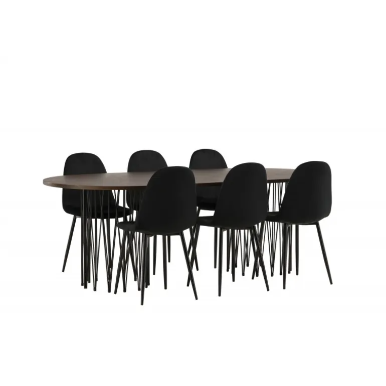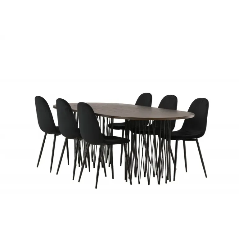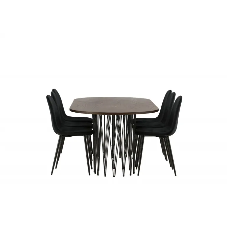En matchende spisestuegruppe, der hurtigt skaber en indbydende og moderne atmosfære! Stone spisebordet imponerer med sit modebevidste design. Det tilhører Furniture Fashion-kollektionen og har en smuk brunfarvet bordplade i MDF med finer og to dekorative cylinderformede stel i sort metal. Her sammen med komfortable stole fra Polar-serien. Stolen har et fuldt polstret design med en afrundet ryg og sæde i sort fløjlsstof med blød polstring og ben i sort pulverlakeret metal. Undgå kompromis mellem komfort og design!