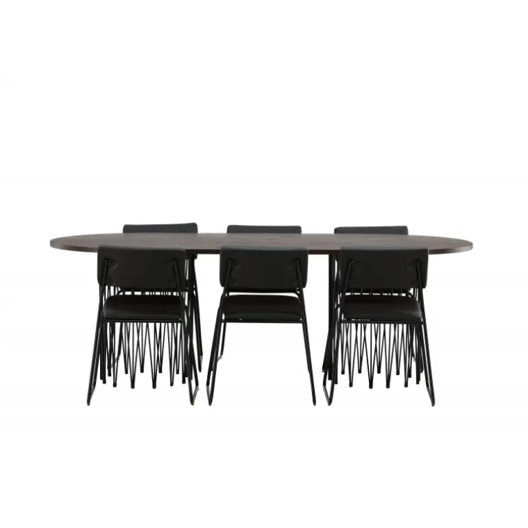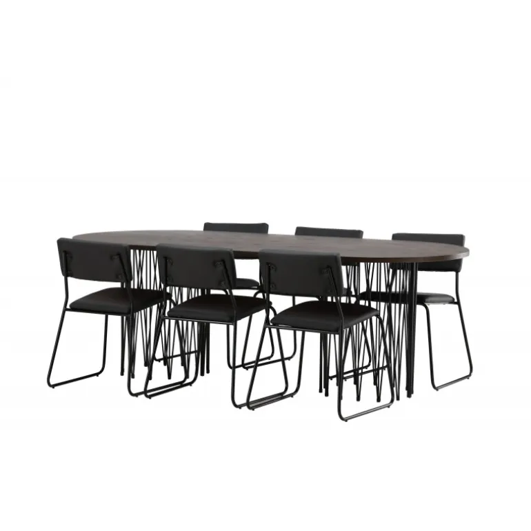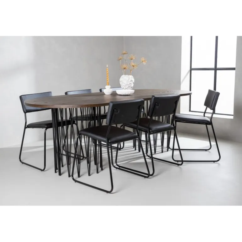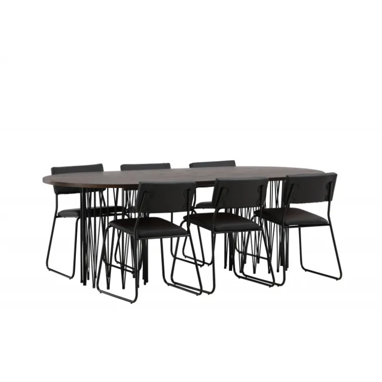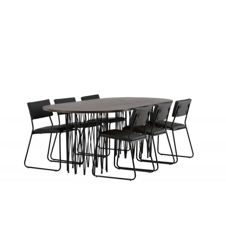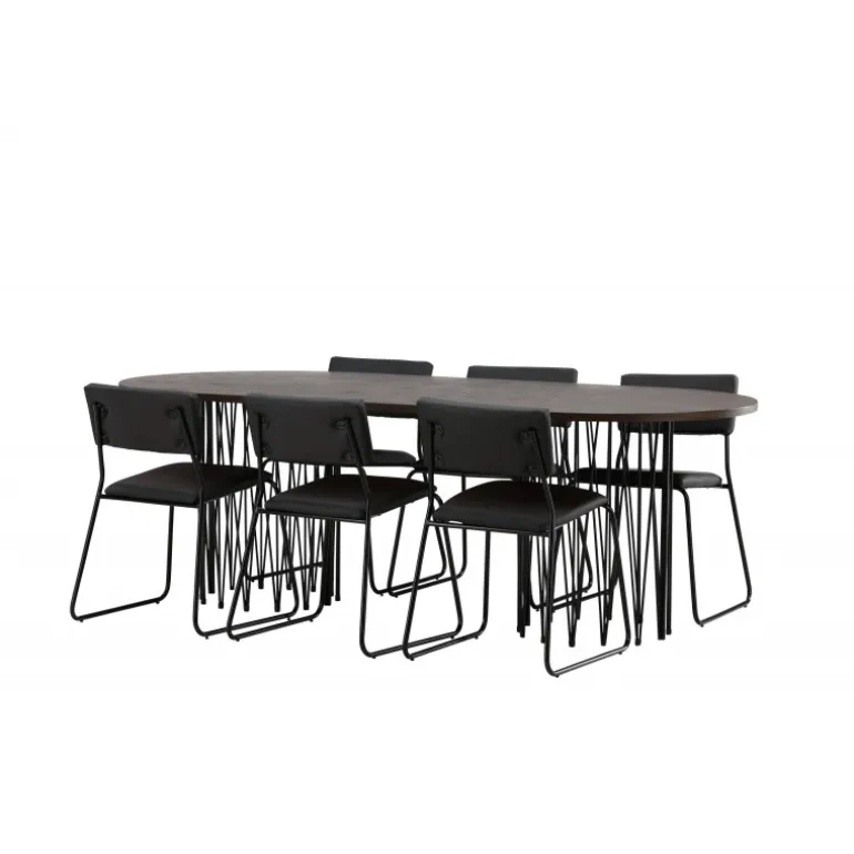 Et ovalt spisebord er perfekt, hvis du ønsker at skabe en social og indbydende atmosfære i dit hjem! Stone spisebord imponerer med sit modebevidste design. Det tilhører Furniture Fashion-kollektionen og har en smuk brun bordplade i MDF med finer og to dekorative cylinderformede rammer i sort metal. Her sammen med vores minimalistiske spisebordsstole fra Kenth-serien. Stolen har et minimalistisk, moderne design, der skaber en luftig følelse i rummet. Ryg og sæde er i sort polyurethanlæder og polyester, og de smalle ben er i jern. Sid komfortabelt og nyd et familievenligt Spisebordssæt!