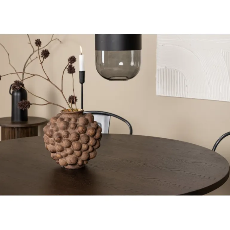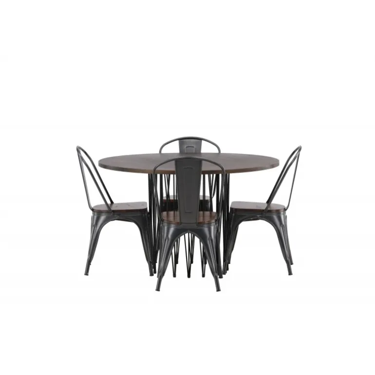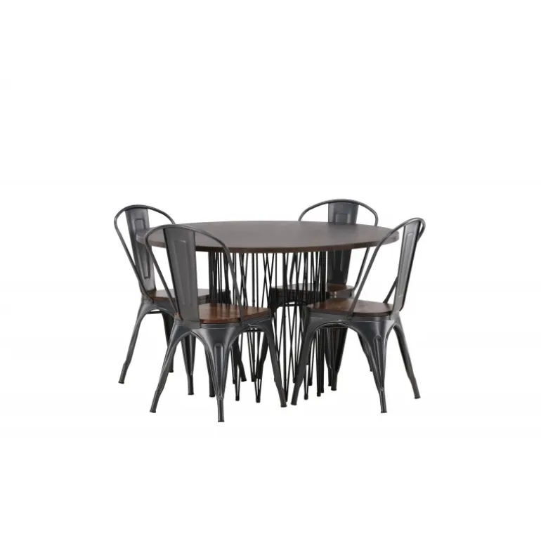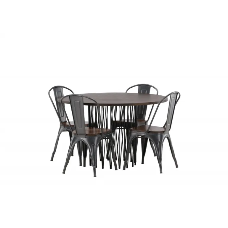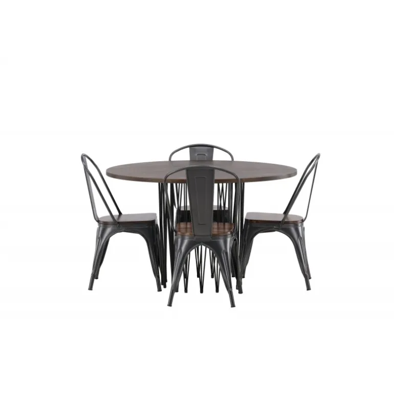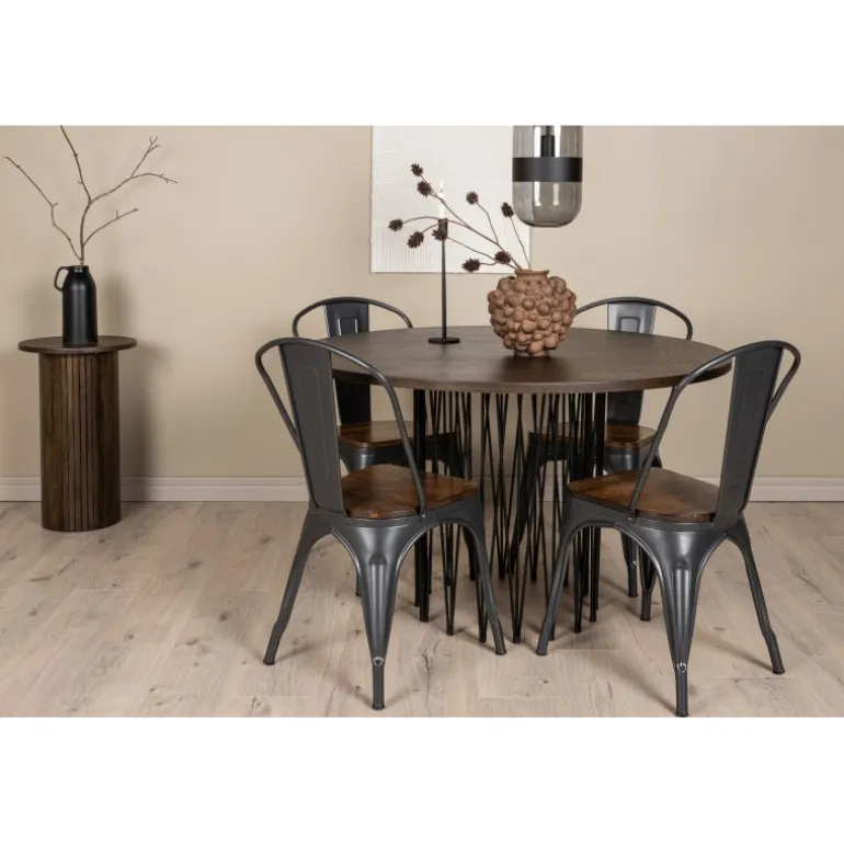 Skab et iøjnefaldende match i det moderne køkken! Vores runde spisebord Stone har et fantastisk, skandinavisk design, der passer til enhver smag. Bordet har en smuk brun bordplade i MDF med finer og en dekorativ cylinderformet ramme i sort metal. Her sammen med spisebordsstole fra Tempe-serien. Stolen tilhører Venture Home-kollektionen og har et klassisk design af en rustik stol med let udsvajede ben i mørkegråt stål og et sæde i mørkt træ. Indret smart og stilfuldt!