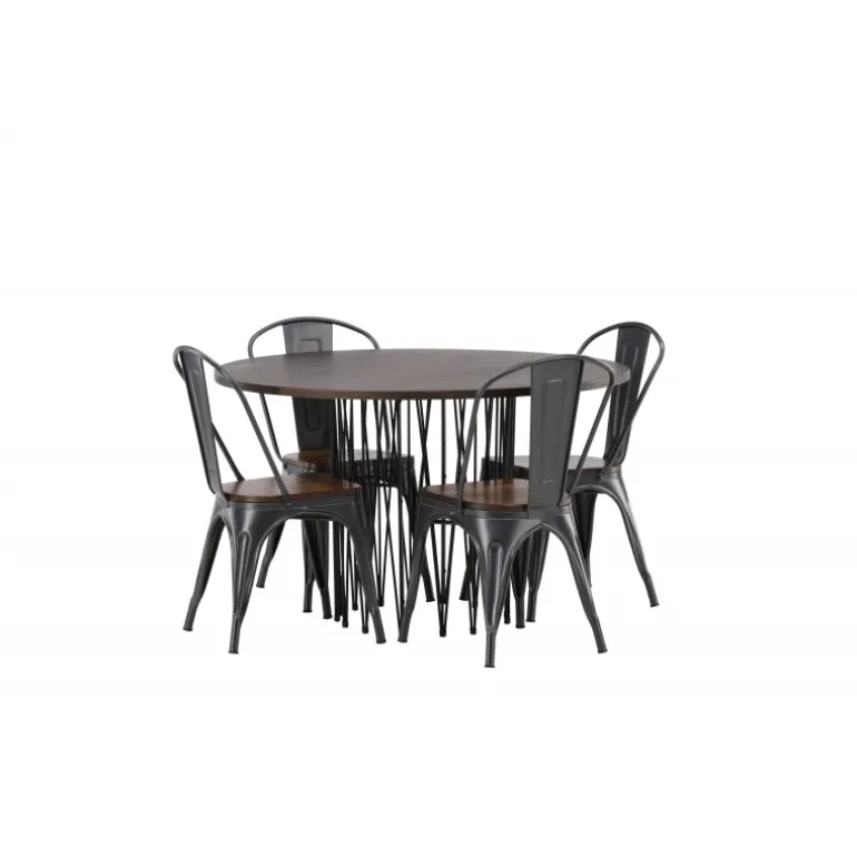 - Rustikke stole: Klassisk design med mørkegrå stålben og sæde i mørkt træ.