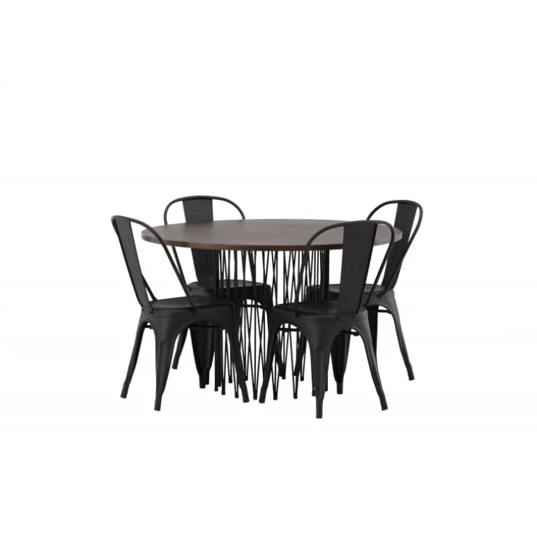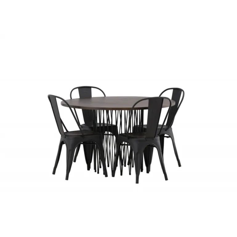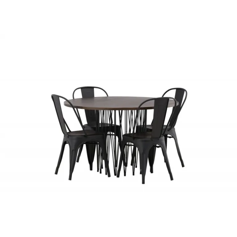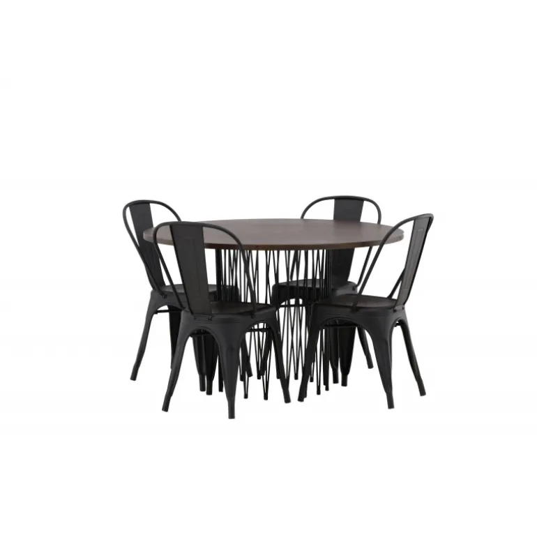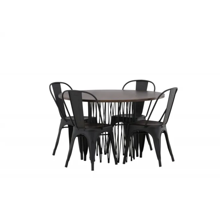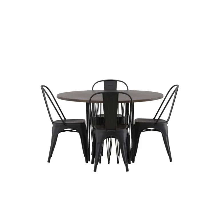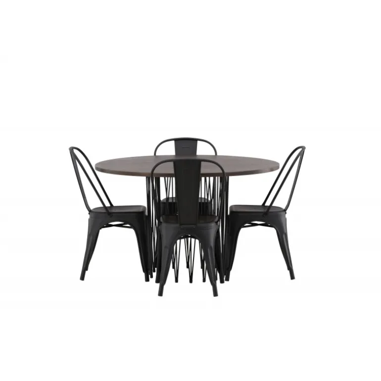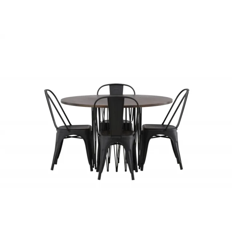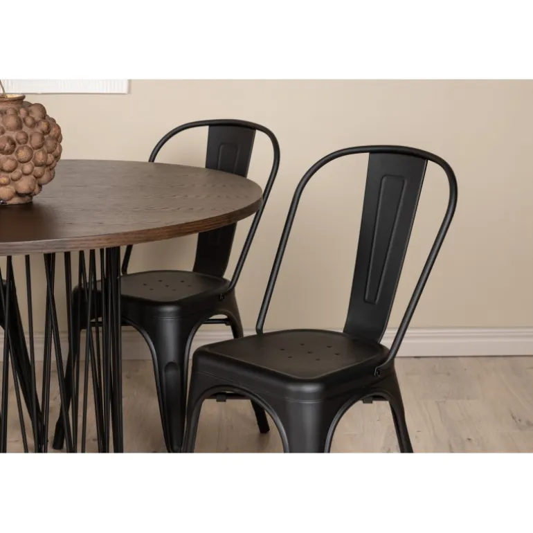 Et robust Spisebordssæt der inviterer til mange sociale øjeblikke! Vores runde spisebord Stone har et fantastisk skandinavisk design, der passer til mange. Bordet har en smuk brunfarvet bordplade i MDF med finér og en dekorativ cylinderformet ramme i sort metal. Her sammen med spisestole fra Tempe-serien. Stolen har let udsvungne ben, der understøtter sædet og ryglænet i et stilfuldt design, alt sammen lavet af sort metal. Indret smart og stilfuldt!