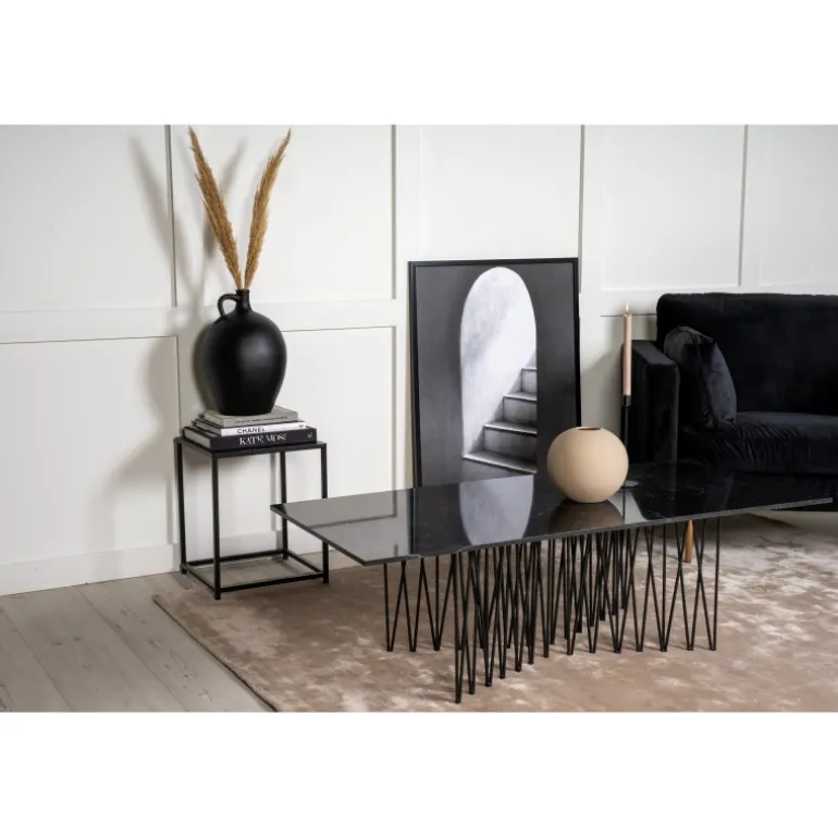Sofabordet Stone er helt i tråd med tidens trends og løfter din stue til næste niveau! Bordet har en sort mønstret bordplade i kunststen, der giver bordet et luksuriøst og stilfuldt indtryk. Det dekorative understel i sort metal imponerer med sit unikke design. Den stilfulde farve gør bordet nemt at matche med andre indretninger og gør det tidløst. Placér det foran sofaen og lad bordet sætte tonen for hele rummet! Sofabordet tilhører Furniture Fashion.