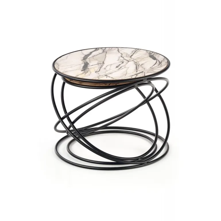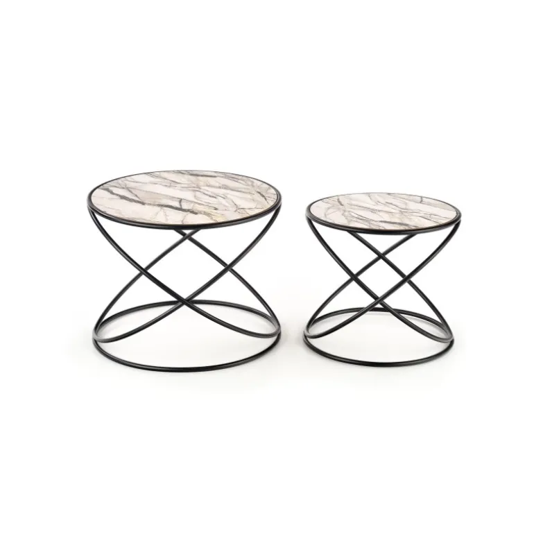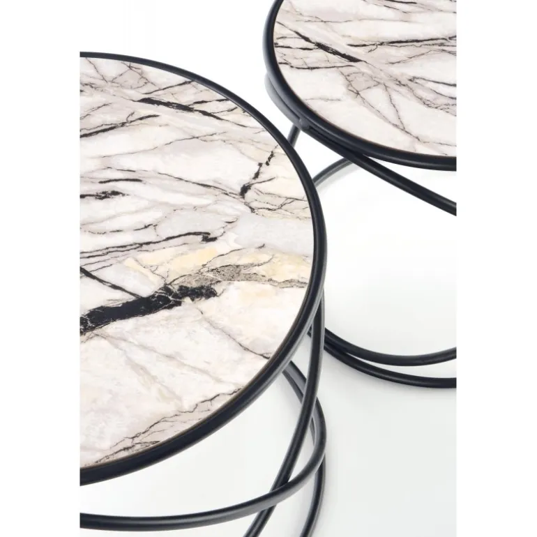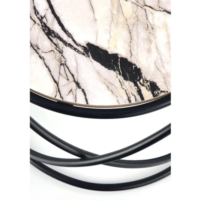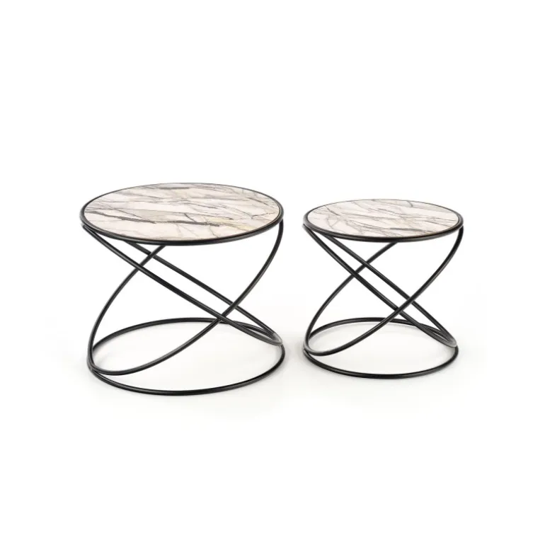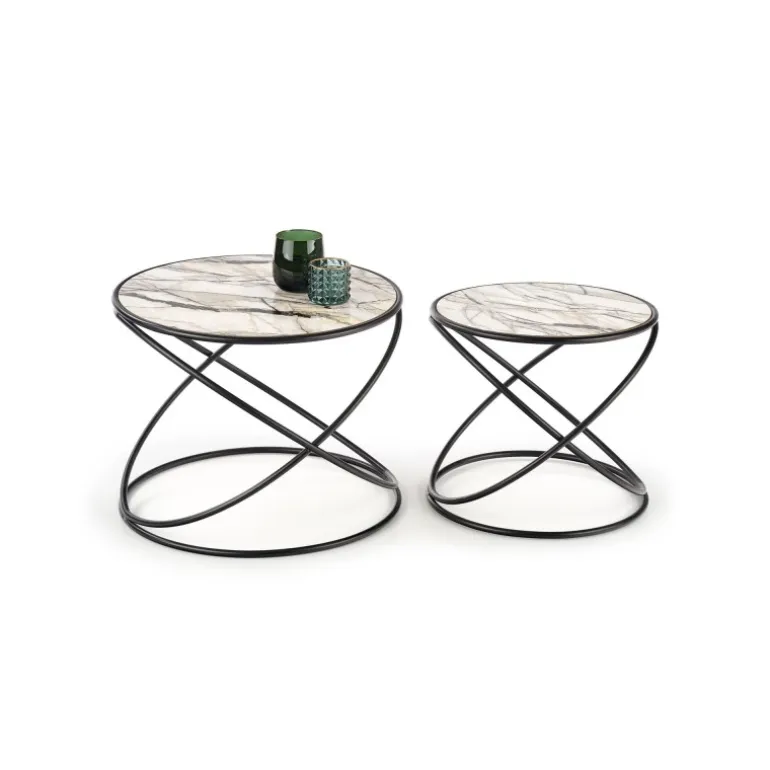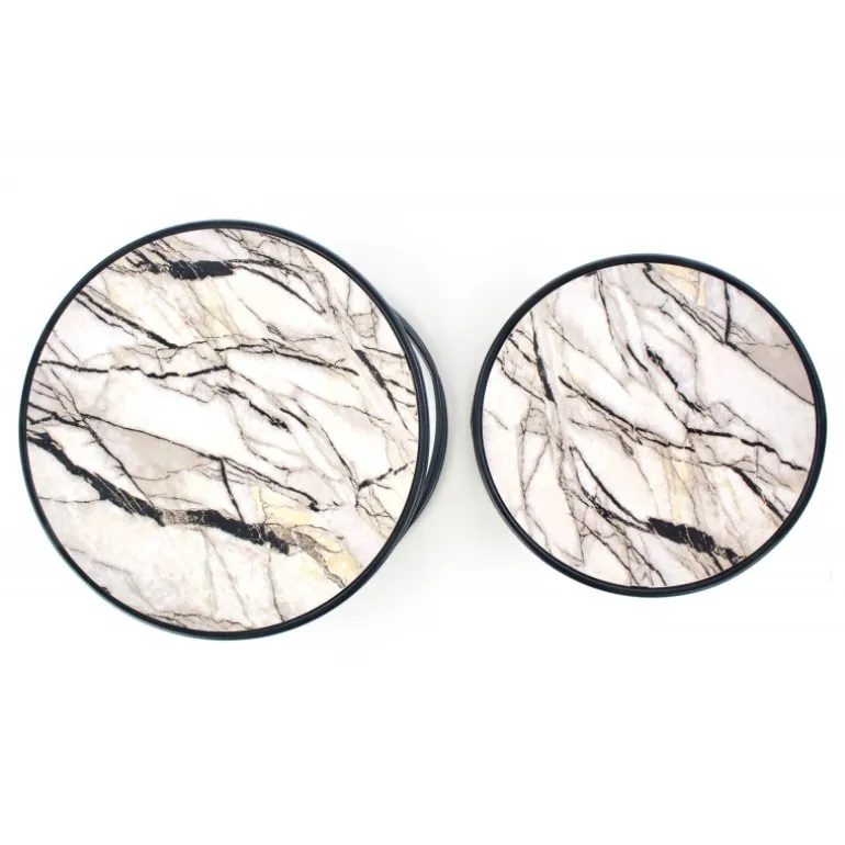 Oplev elegance og funktionalitet med SUSANNA, et sæt af to stilfulde sofaborde i hvid marmor og Sort. Disse borde er designet til at tilføje et moderne touch til din stue. Med dimensionerne fi 40/35 cm og fi 50/39 cm passer de perfekt til både små og store rum. De er fremstillet af lamineret MDF og pulverlakeret stål, hvilket sikrer holdbarhed og en flot finish. Dette sæt vil ikke kun være en praktisk tilføjelse, men også en samtalestarter i dit hjem.