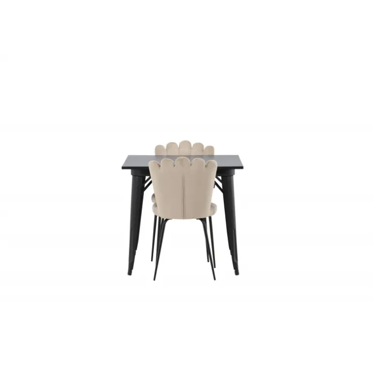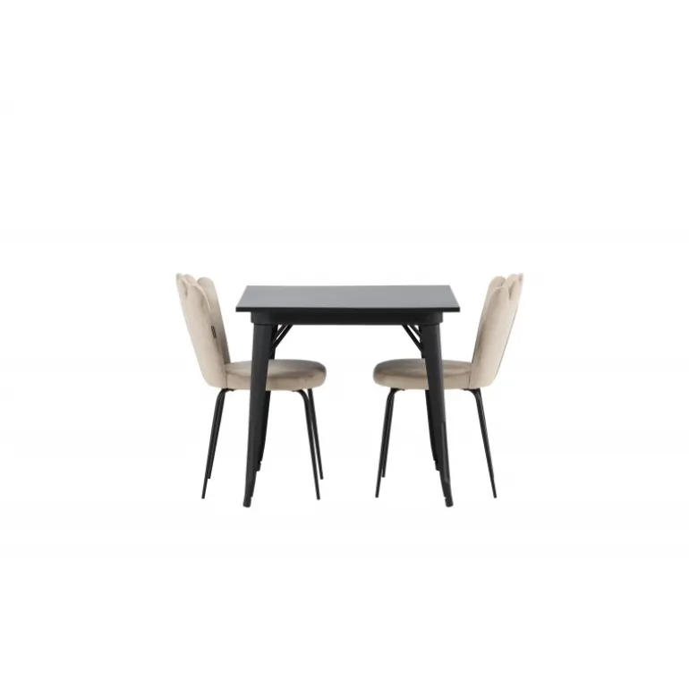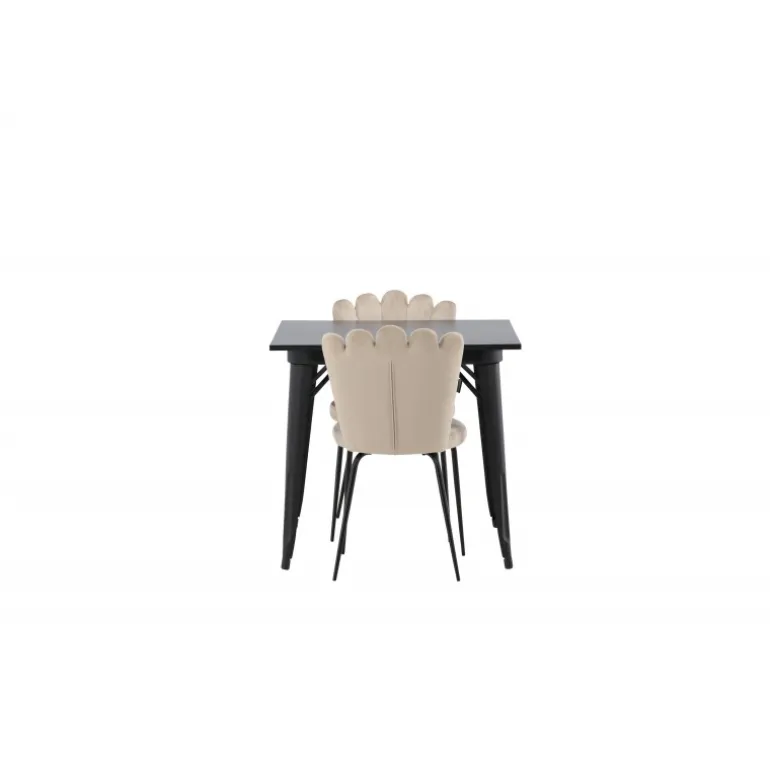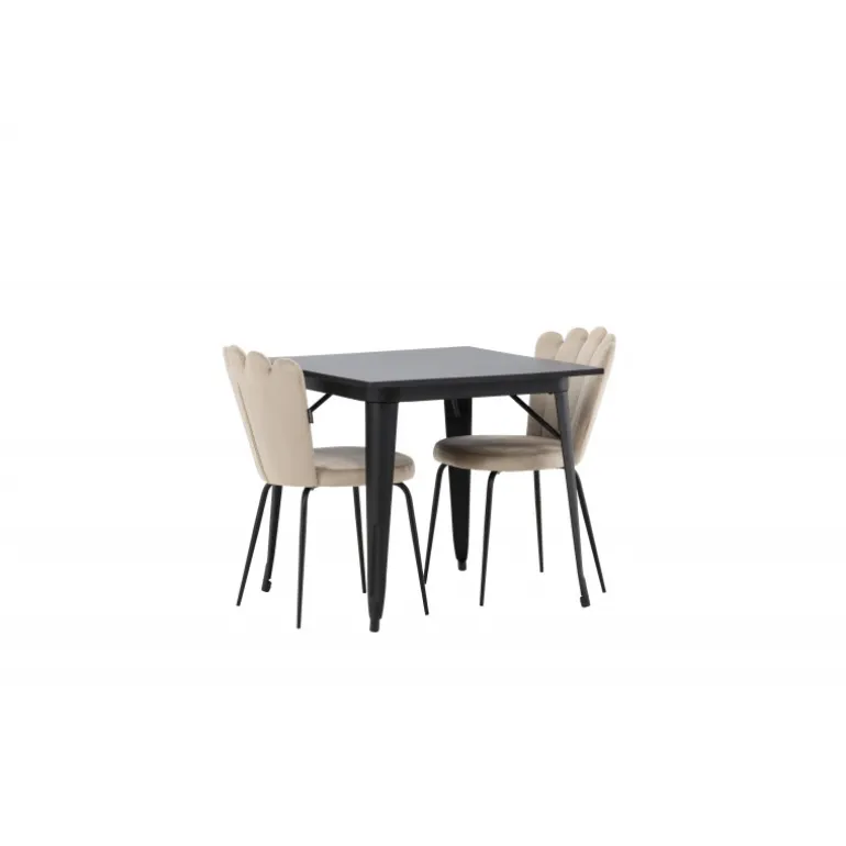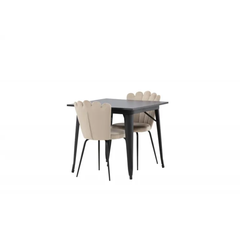 En elegant og luksuriøs Spisebordssæt! Dette spisebord fra Tempe-serien har et klassisk og tidløst design i sort. Bordpladen er lavet af sort MDF, og bordbenene er i sort metal. Kombineret med to komfortable spisebordsstole fra Limhamn-serien, som har et moderne design med en dekorativ, muslingeformet ryg og en rund sæde i beige velourstof. Stolens ben er i sort pulverlakeret metal. Sid komfortabelt og storslået!