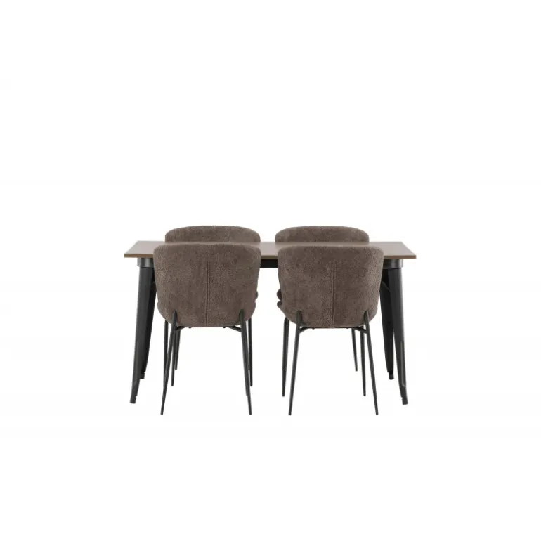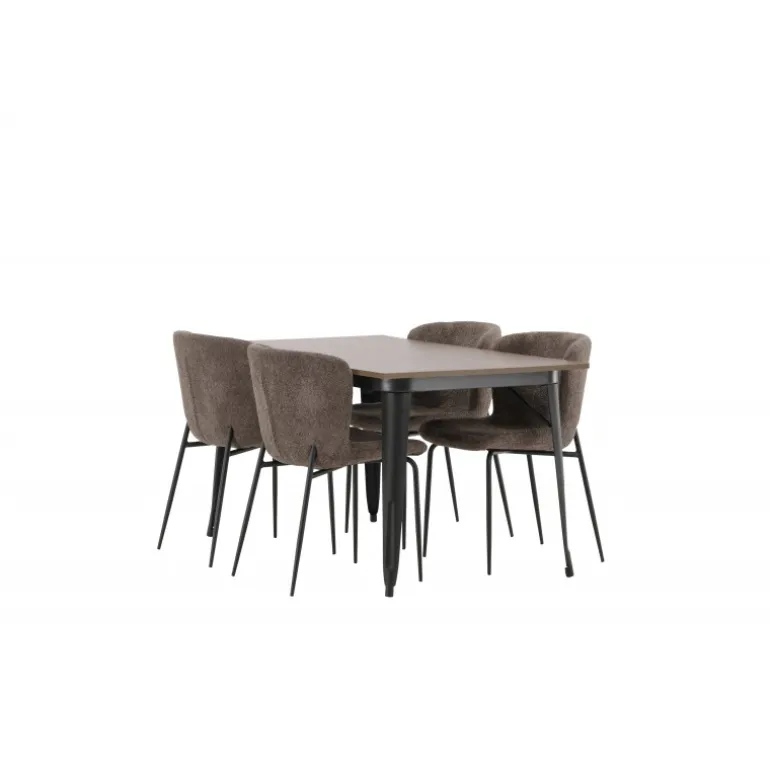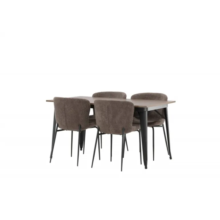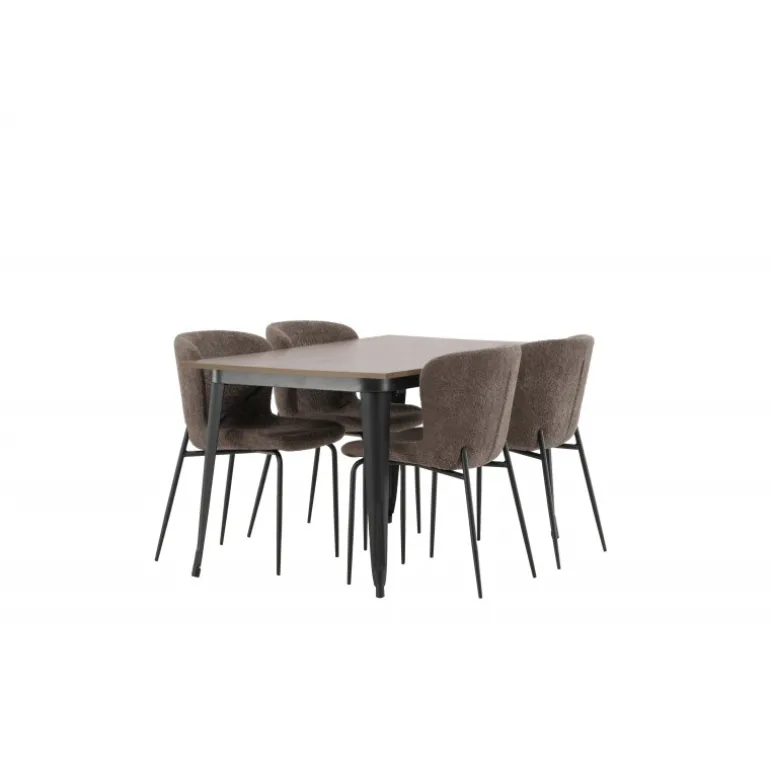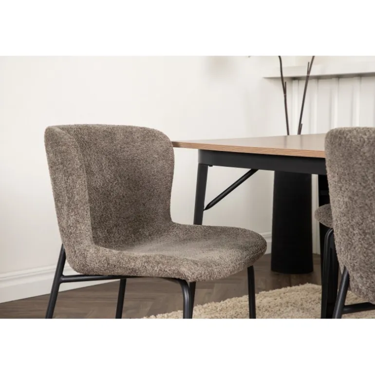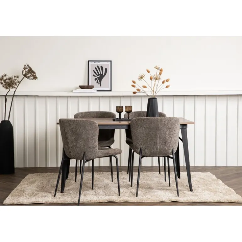 Stilfuldt, moderne og holdbart – et Spisebordssæt, der står tidens prøve! Spisebordet fra Tempe-serien tilhører Venture Home-kollektionen og har et iøjnefaldende, skandinavisk design. Lavet med en kvadratisk bordplade i sort MDF og ben i sort metal. Her i perfekt kombination med vores komfortable spisebordsstole fra Modesto-serien. Stolen er fuldt polstret i beige bouclé-stof med stilfulde smalle ben i sort metal. Den let afrundede ryg og polstrede sædepude giver ekstra komfort og forlænger hyggelige måltider omkring spisebordet. Det skal føles godt at sætte sig ned til et dejligt måltid!