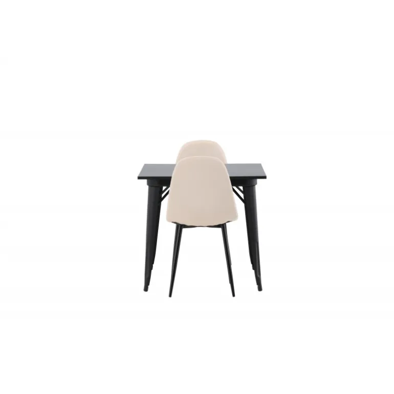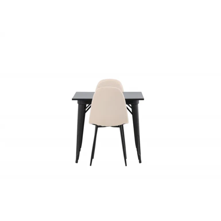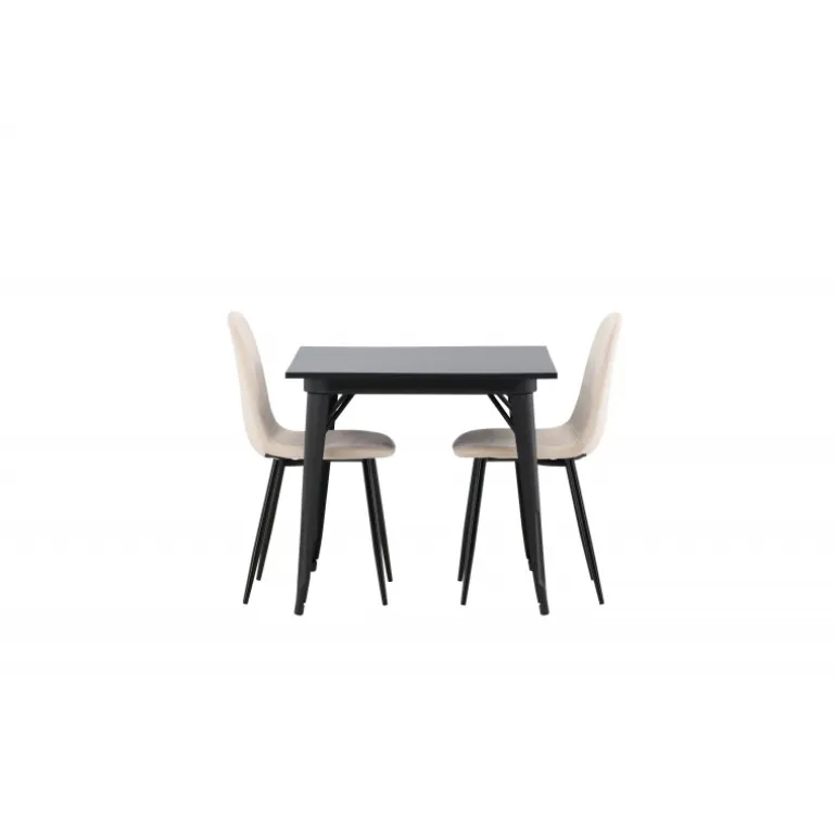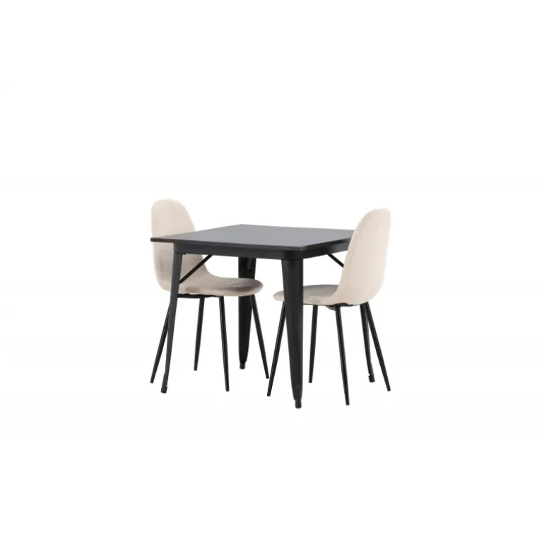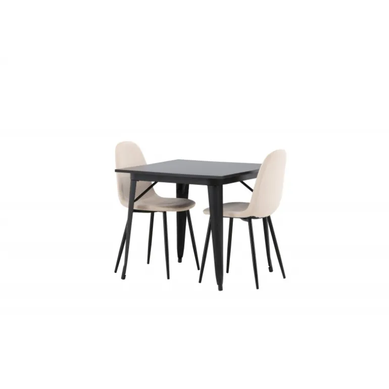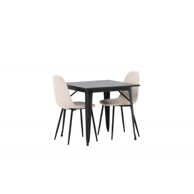 Et charmerende Spisebordssæt til to – perfekt til det lille køkken! Dette spisebord fra Tempe-serien har et klassisk, firkantet design og en tidløs sort farve. Bordpladen er i sort MDF, og bordbenene er i sort metal. Her i en smagfuld kombination med to spiseborde fra Polar-serien i en champagnefarvet nuance. Stolene har et fuldt polstret design med en rund ryg og sæde i beige velourstof med blød polstring og ben i sort pulverlakeret metal. Undgå at gå på kompromis mellem komfort og design!
