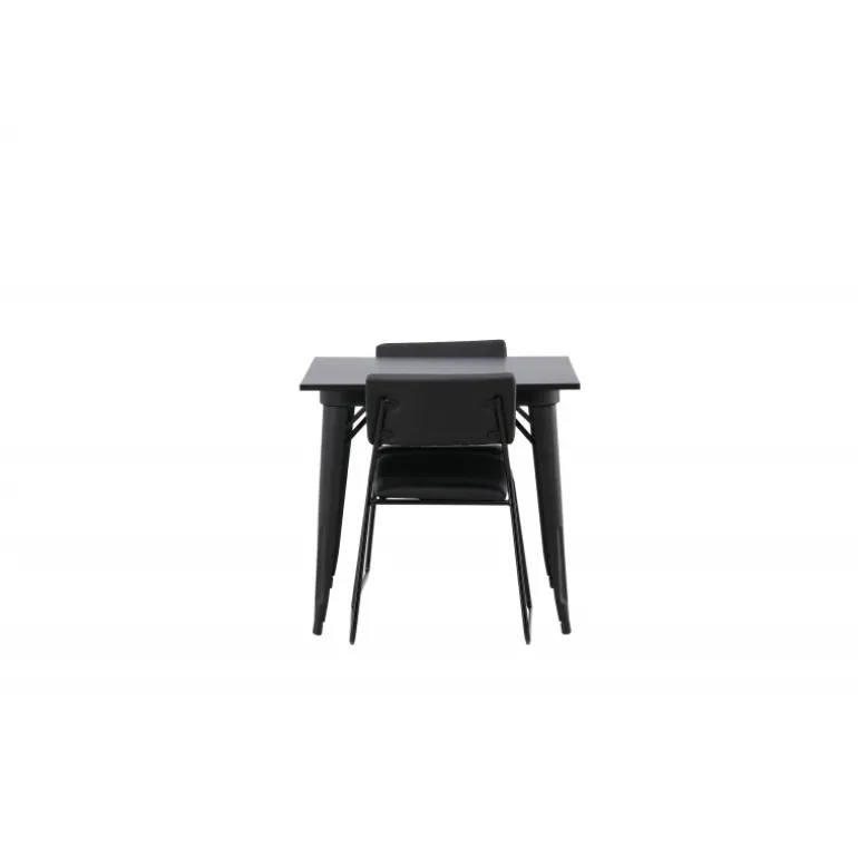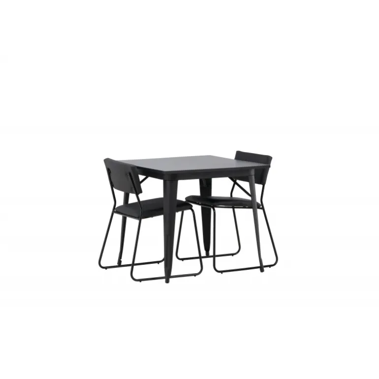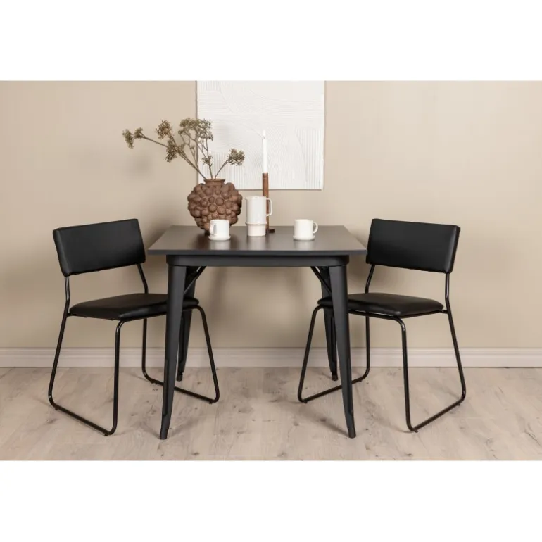 Et pænt Spisebordssæt, der passer perfekt i det mindre køkken! Dette spisebord fra Tempe-serien har et klassisk, firkantet design og en tidløs sort farve. Bordpladen er i sort MDF og benene i sort metal. Her i en smagfuld kombination med to spiseborde fra Kenth-serien. Stolene har et minimalistisk, moderne design, der skaber en luftig følelse i rummet. Ryg og sæde er i sort PU-læder og polyester, og de smalle stoleben er i jern. Skab en charmerende og moderne blikfanger i din stue!