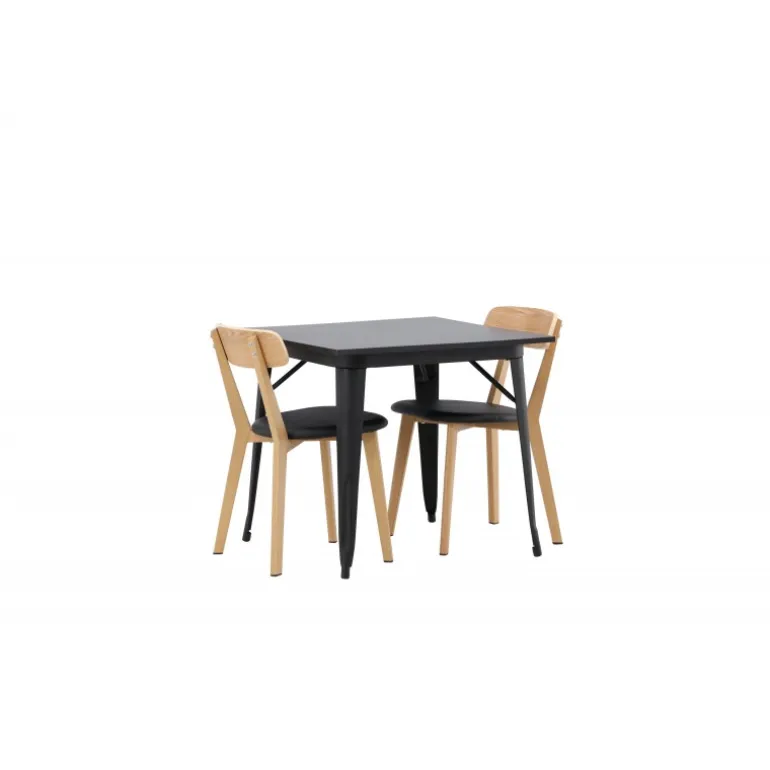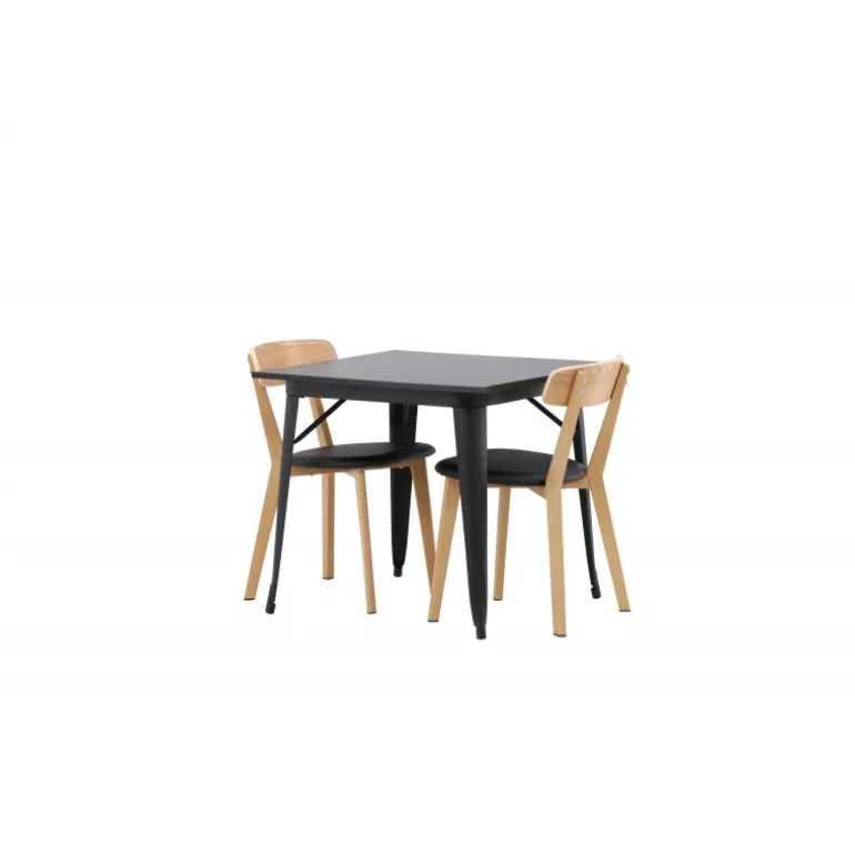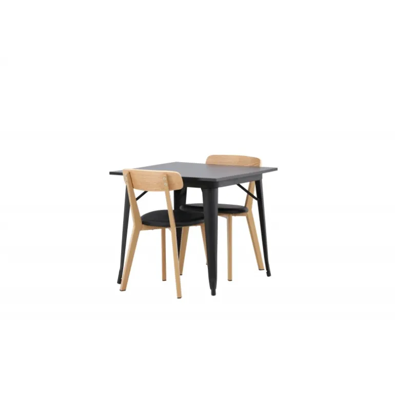 Indret dit hjem smart og stilfuldt! Dette spisebord fra Tempe-serien har et klassisk, firkantet design og en tidløs sort farve. Bordpladen er i sort MDF og bordbenene i sort metal. Her i perfekt kombination med vores smagfulde spisestole fra Sanjos-serien. Stolen tilhører Venture Home-kollektionen og har et dejligt design i farverne sort og naturtræ. Det bløde sæde er skum polstret for ekstra komfort og har et lækkert PU-læder i sort. Ryggen og benene er lavet af lyst træ og giver indtryk af et klassisk design. Sid komfortabelt!