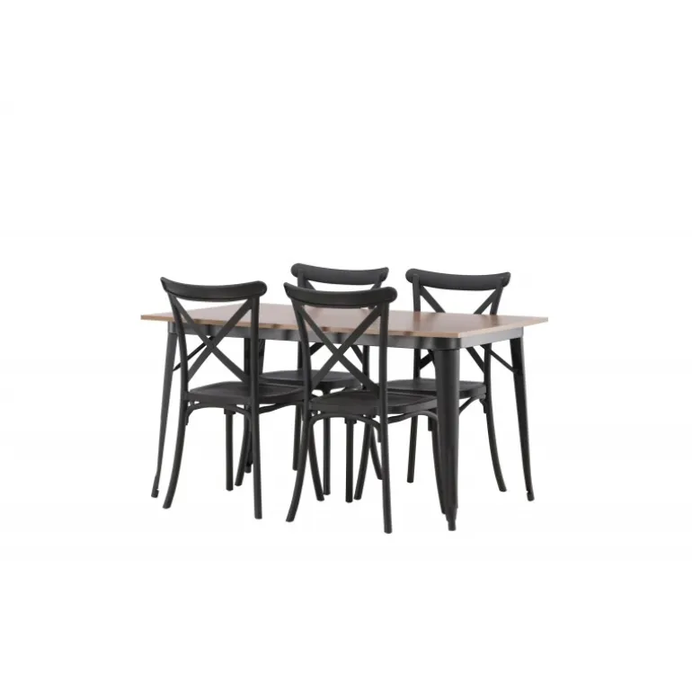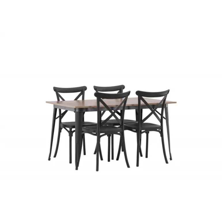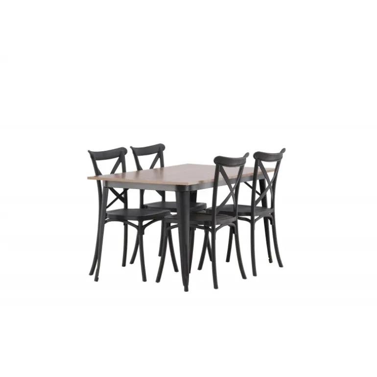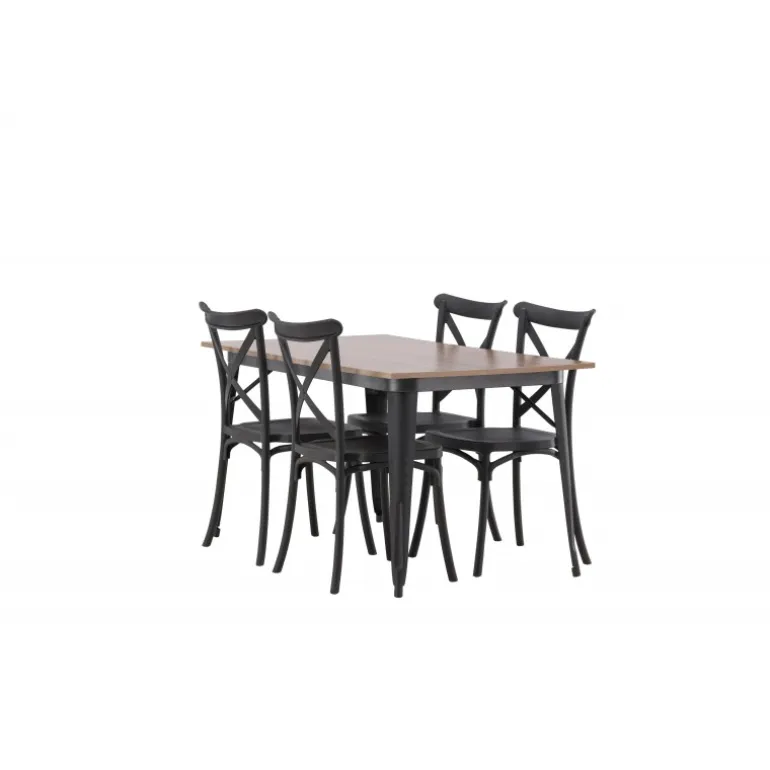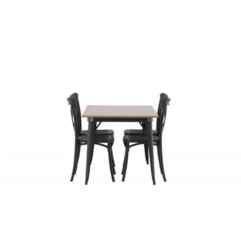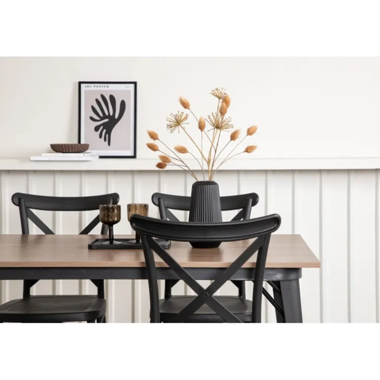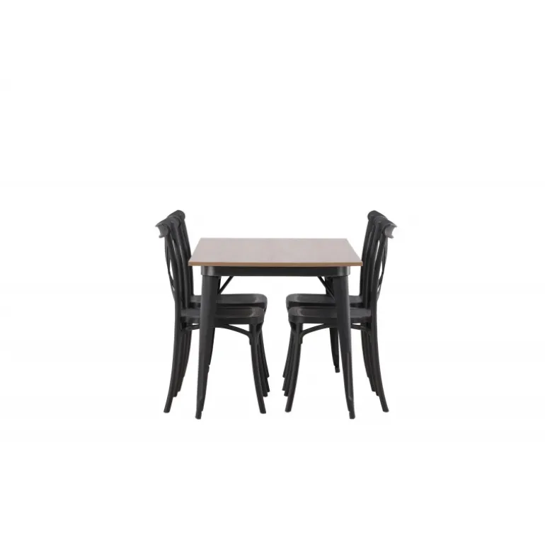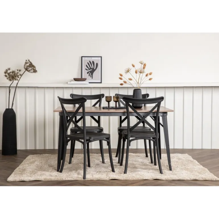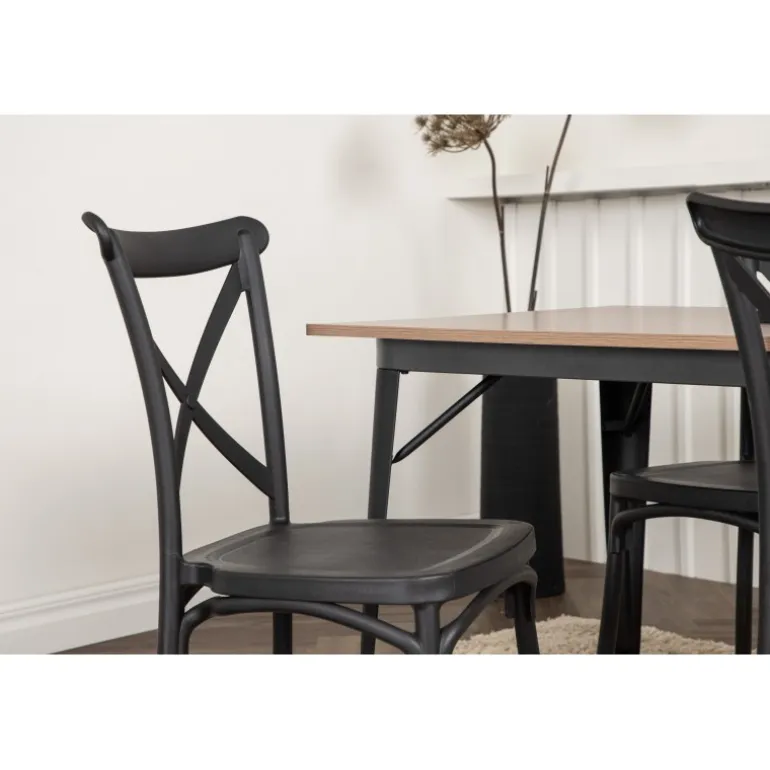 En Spisebordssæt, der kombinerer klassisk design og moderne former! Spisebordet fra Tempe-serien tilhører Venture Home kollektionen og har et iøjnefaldende, skandinavisk design. Lavet med en firkantet bordplade i sort MDF og bordben i sort metal. Sammen med spisebordsstole fra Crosett-serien. Stolene har et nostalgisk design med krydset ryg og lige linjer, konsekvent lavet af sort plastik. Her får du en stilfuld Spisebordssæt til at indrette dit hjem med!