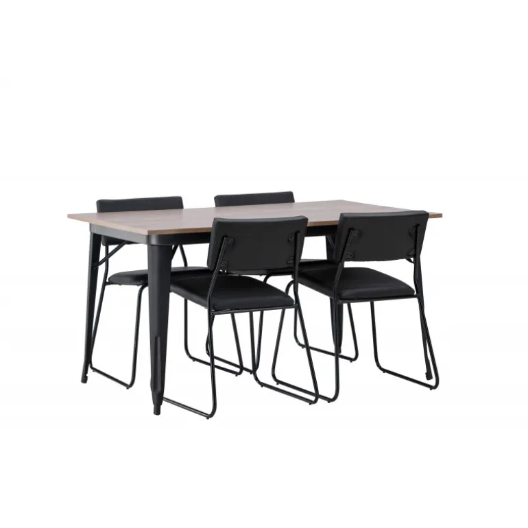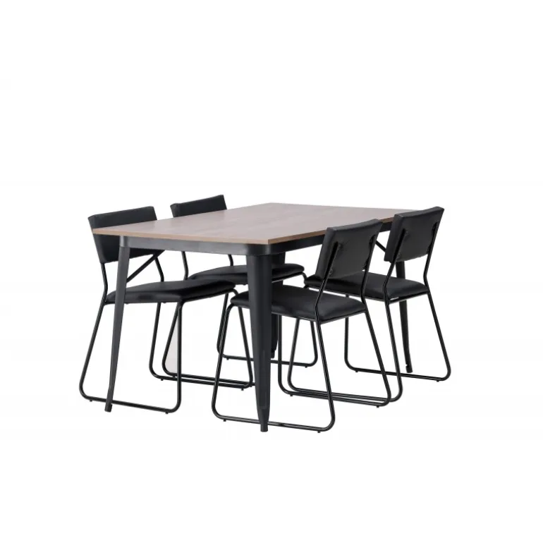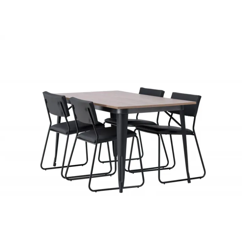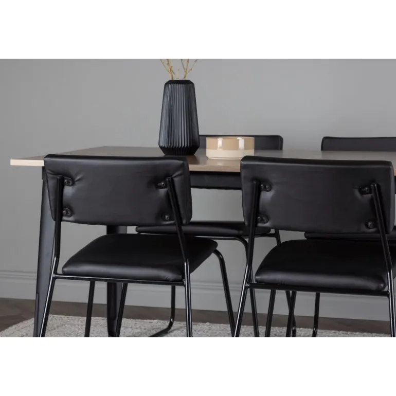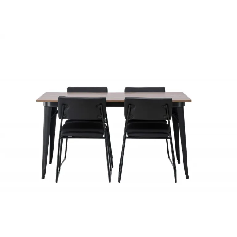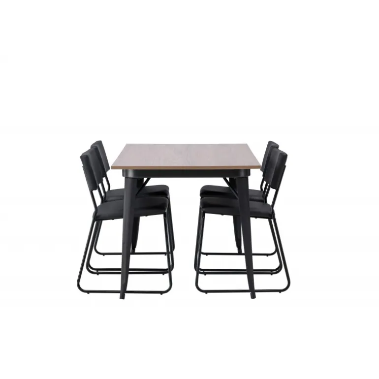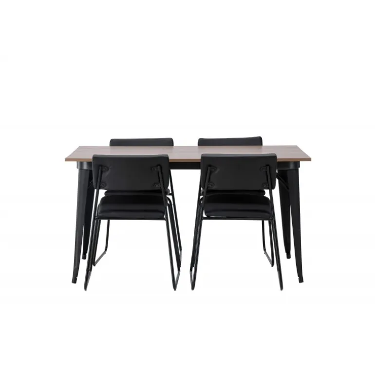 En charmerende kombination af minimalistiske former og skandinavisk design! Spisebordet fra Tempe-serien har et stilfuldt, skandinavisk design. Lavet med en kvadratisk bordplade i valnød-farvet MDF og bordben i sort metal. Her sammen med vores sorte spisebordsstole fra Kenth-serien. Det minimalistiske, moderne design skaber en luftig følelse. Stolen har ryg og sæde i sort polyurethanlæder og polyester samt dekorative smalle ben i jern. Inviter dine kære til mange sociale stunder fremover! Bordmål: 140×80 cm.