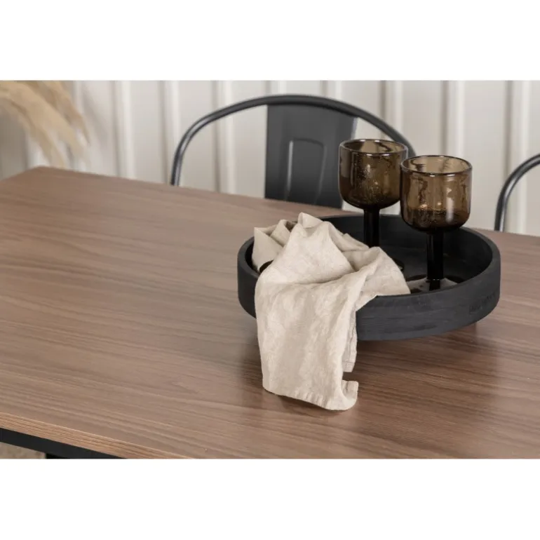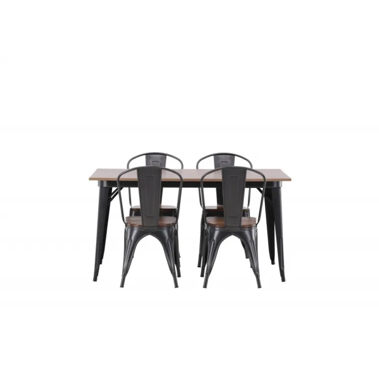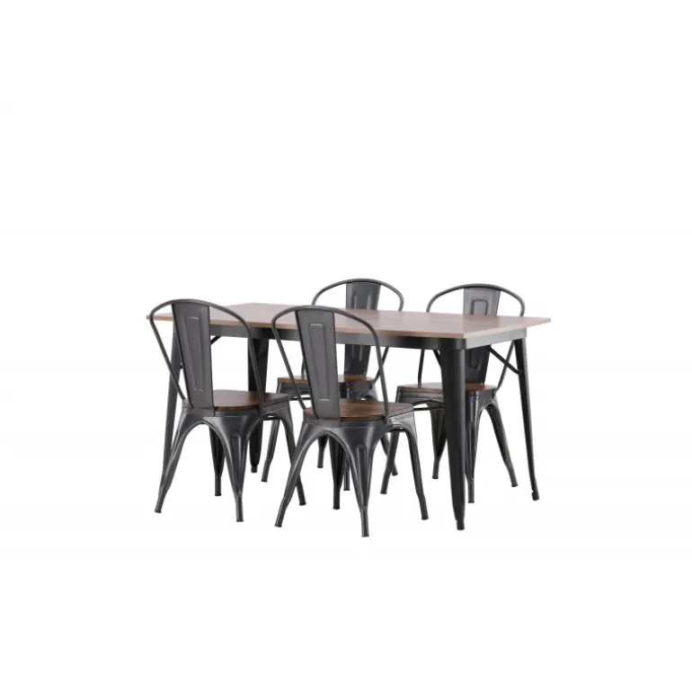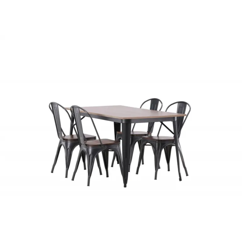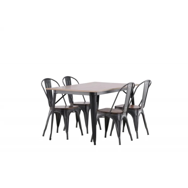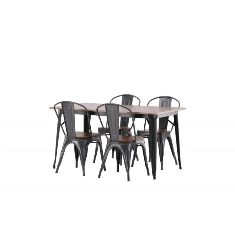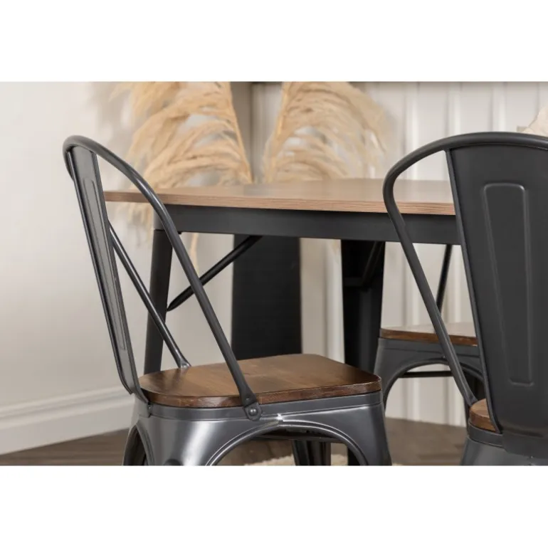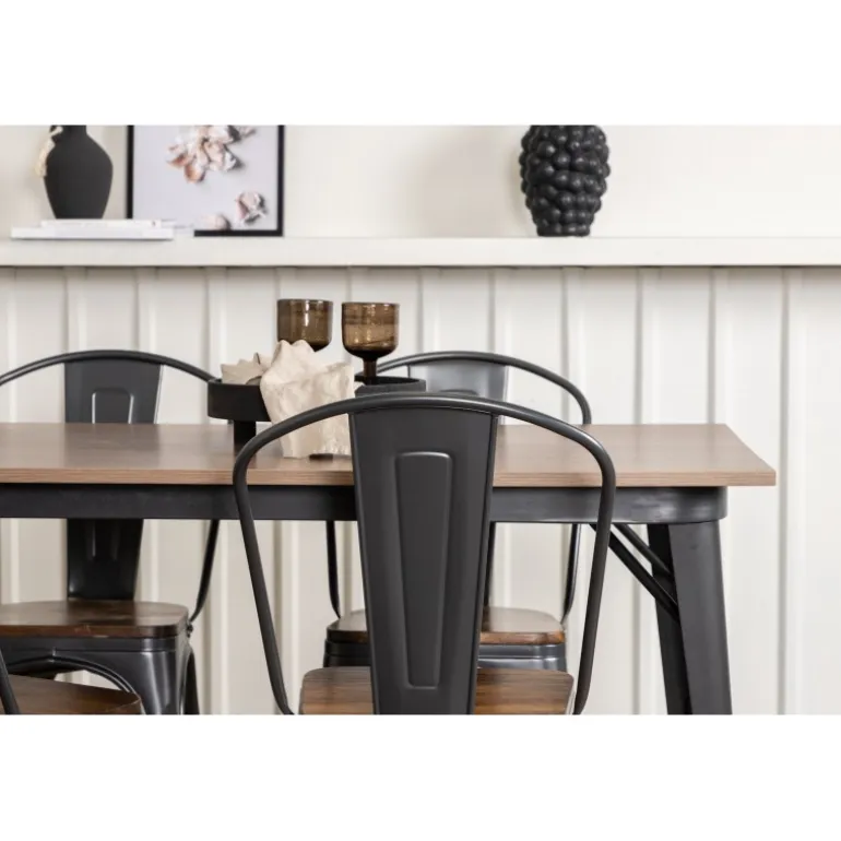 Skab et matchende blikfang i det moderne køkken med et Spisebordssæt fra Tempe-serien! Spisebordet fra Tempe-serien tilhører Venture Home-kollektionen og har et iøjnefaldende, skandinavisk design. Lavet med en kvadratisk bordplade i sort MDF og bordben i sort metal. Her sammen med spiseborde fra samme serie. Stolen tilhører Venture Home-kollektionen og har et klassisk design af en rustik stol med let udadrettede ben i mørkegråt stål og et sæde i mørkt træ. Indret smart og stilfuldt!
