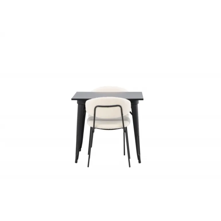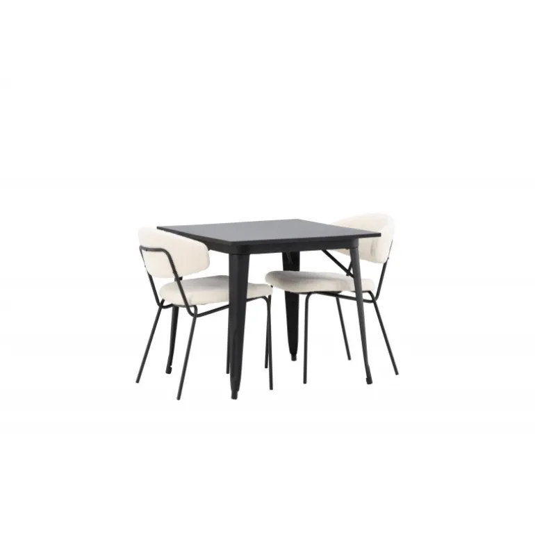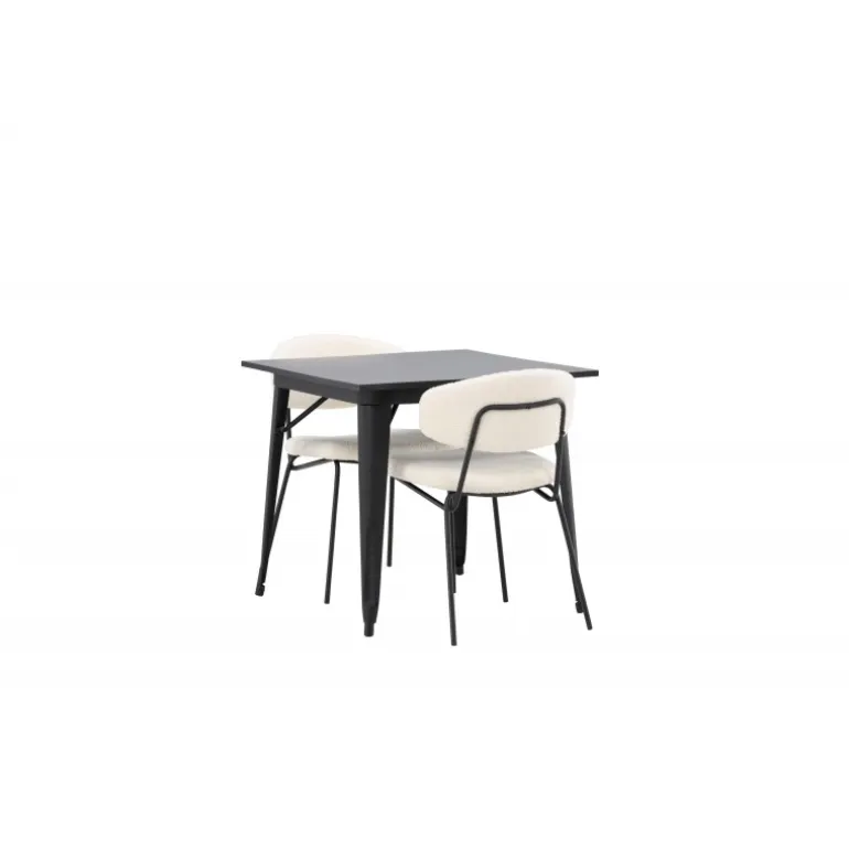Et charmerende Spisebordssæt til to – perfekt til det lille køkken! Dette spisebord fra Tempe-serien har et klassisk, kvadratisk design og en tidløs sort farve. Bordpladen er i sort MDF, og bordbenene er i sort metal. Her i smagfuld kombination med to spisebordsstole fra Chico-serien. Stolene har et minimalistisk og komfortabelt design med ryg og sæde i hvid boucle-stof og en smal ramme i sort stål. Her får du en øjenfanger, der imponerer dine gæster!