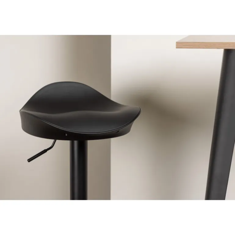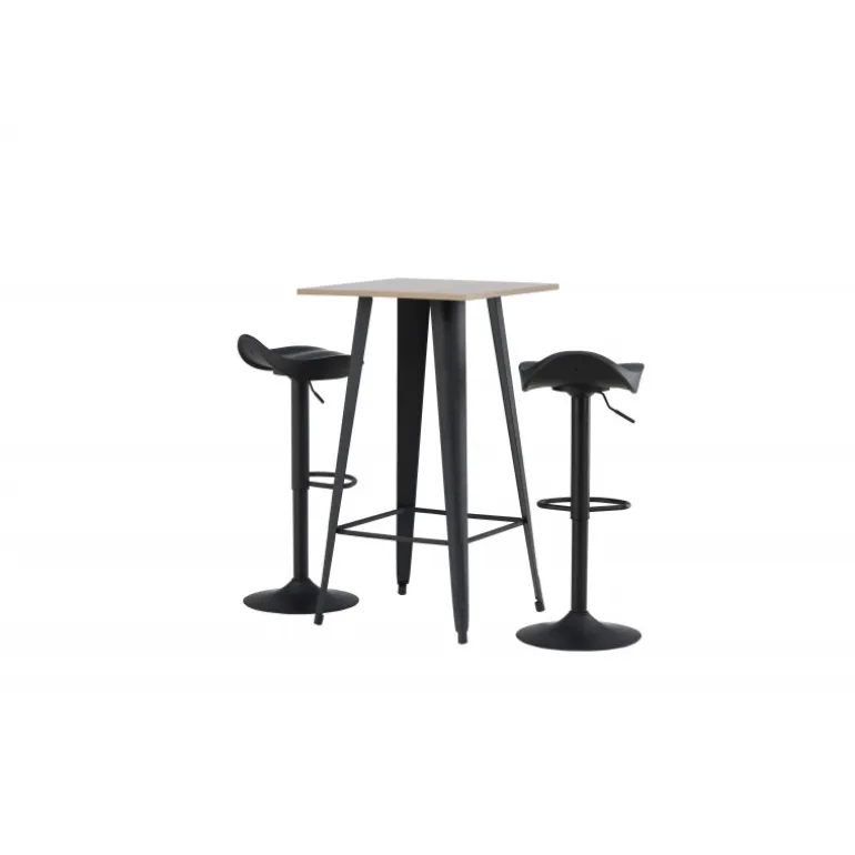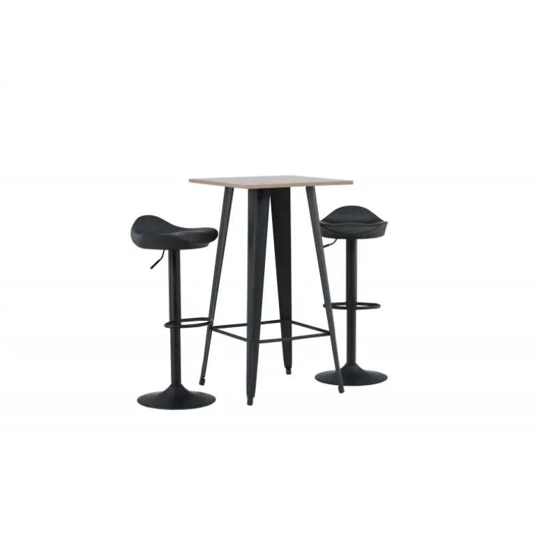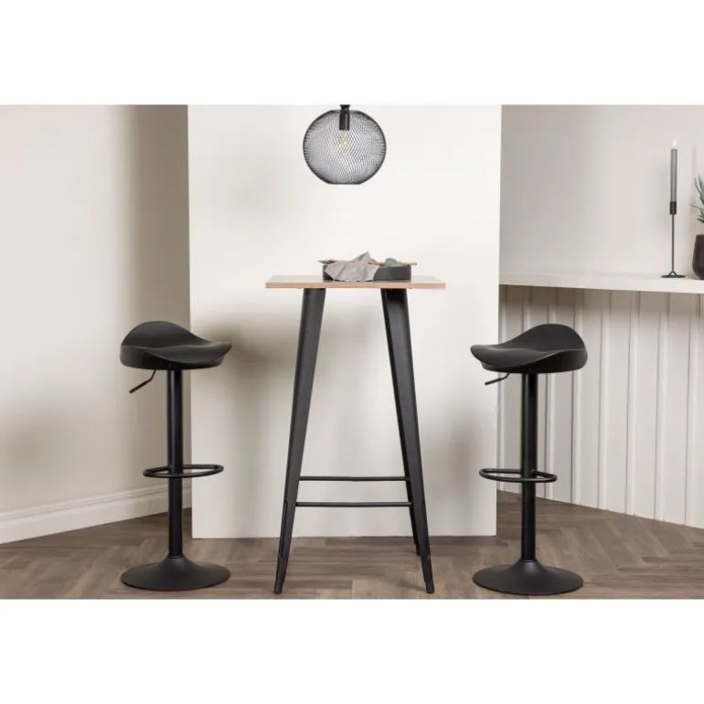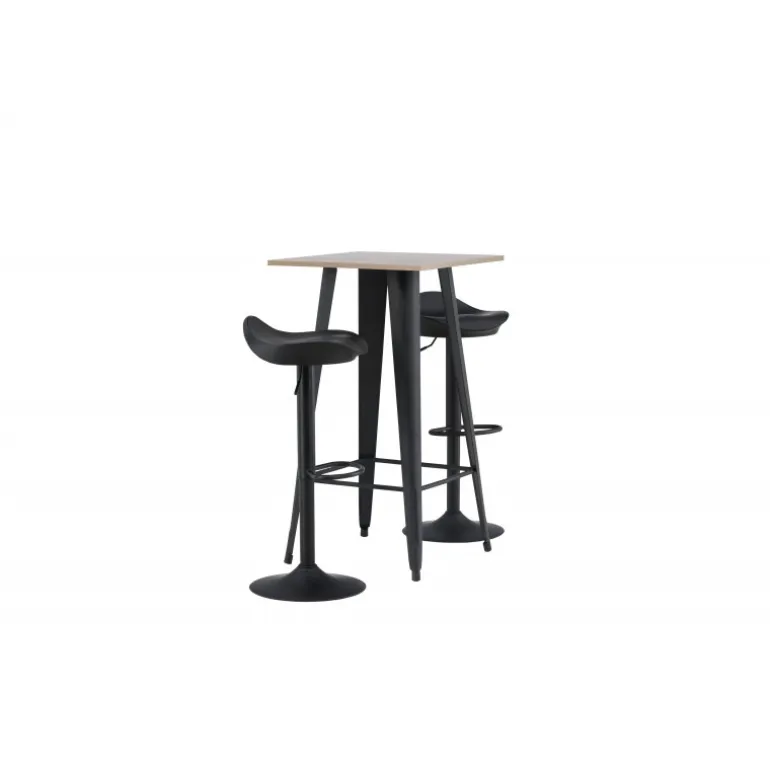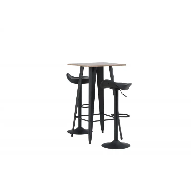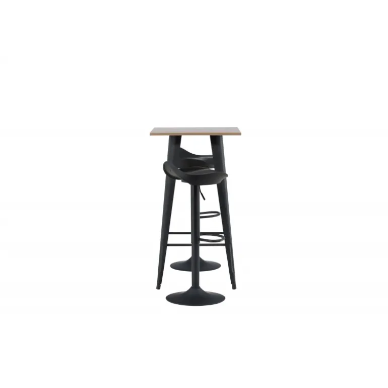 Et moderne spisestue sæt bestående af 2 barstole fra Adesto-serien og et dejligt barbord fra Tempe-serien. Dette barsæt passer perfekt i den mindre køkken. Adesto barstolene har et stilfuldt design, der aldrig går af mode, med en trompetfod i sort stål og en enkel sæde i sort plastik. Her er stolen kombineret med Tempe barbord i minimalistisk størrelse med kvadratisk bordplade i valnøddefarvet MDF og let skrånende bordben i sort metal. Dette barsæt er både nyttigt og praktisk og forlænger de fælles øjeblikke i hjemmets hjerte!