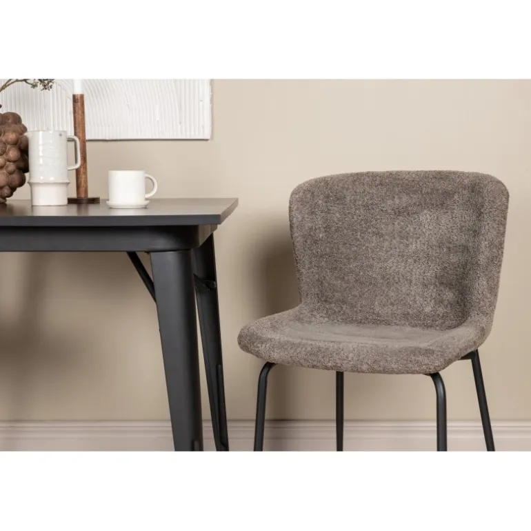 - Komfortable stole: Polstret i gråt bouclé stof med sort metalben.