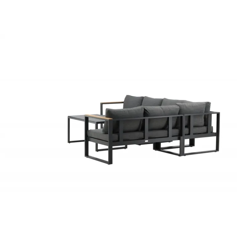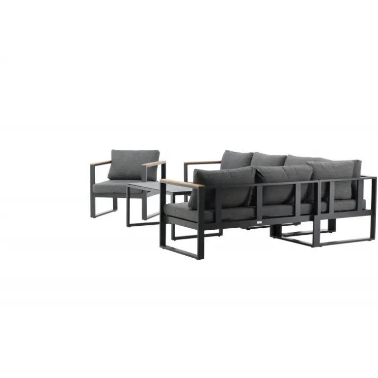 Modern stilfuldt sofasæt, der passer perfekt på din terrasse. Sofasættet består af en tre-personers sofa, inklusive mordpuder, samt et lavt sofabord med en sprayfarvet glasplade. Køb matchende lænestole i samme serie. Lavet af sort pulverlakeret metal med stilfulde detaljer i teak.