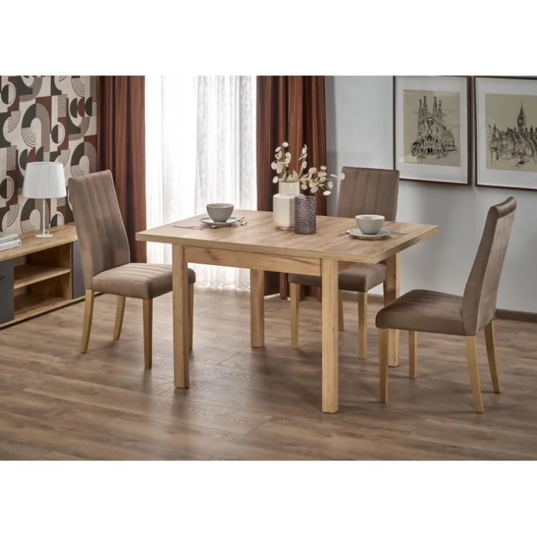 TIAGO SQUARE forlængelsesbordet i håndværk eg er den perfekte løsning til både små og store rum. Med sin fleksible forlængelse kan bordet nemt justeres fra 90 cm til 125 cm, hvilket gør det ideelt til både daglig brug og specielle anledninger. Bordpladen og benene er lavet af høj kvalitet lamineret spånplade og lamineret MDF, hvilket sikrer en robust og holdbar konstruktion. Det elegante design i håndværk eg giver et tidløst udseende, der passer ind i ethvert hjem.