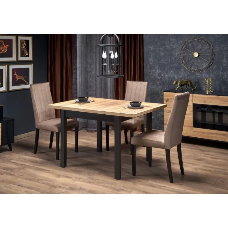 TIAGO SQUARE Spisebord med udtræk er et elegant og funktionelt møbel, der passer perfekt ind i ethvert moderne hjem. Dette Spisebord med udtræk er designet til at give dig maksimal fleksibilitet med dets justerbare dimensioner fra 90 cm til 125 cm i længden, så du nemt kan tilpasse det efter dine behov. Bordpladen er lavet af lamineret spånplade og lamineret MDF, hvilket sikrer holdbarhed og lang levetid. Med en top i craft eg og ben i Sort, bringer dette bord en tidløs æstetik til din spisestue eller køkken.