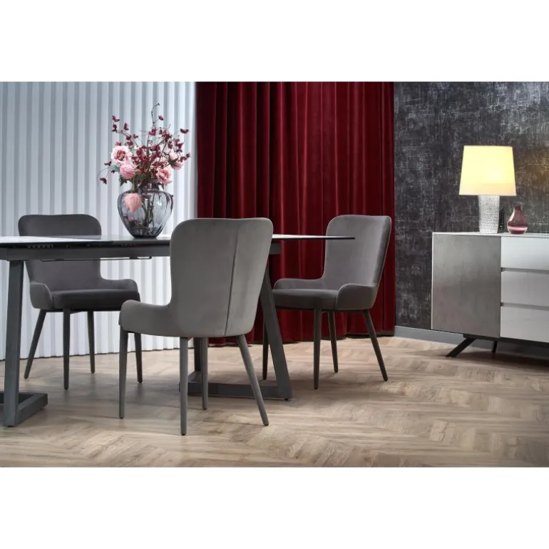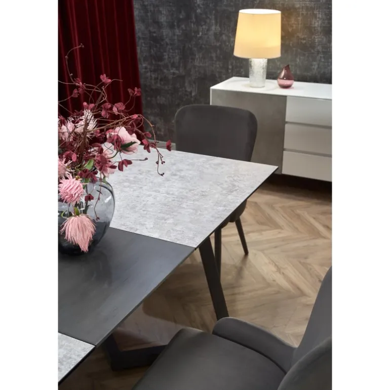 Oplev TIZIANO Spisebord med udtræk – den perfekte løsning til både små og store sammenkomster. Dette elegante bord har en justerbar længde fra 160 cm til 210 cm, hvilket gør det ideelt til enhver spisesituation. Med en overflade i glas og lakeret MDF samt ben i pulverlakeret stål, kombinerer dette bord stil og holdbarhed. Den lyse grå og mørke grå top sammen med de mørke grå ben passer perfekt ind i ethvert moderne hjem.