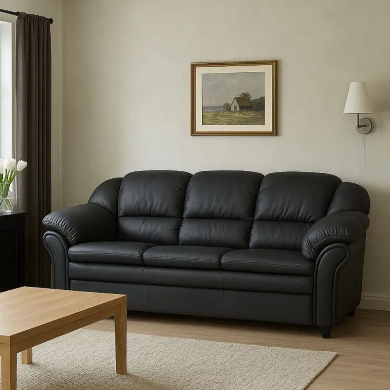 Tønder 3 personers sofa med god plads til hygge og komfort, betrukket med vedligeholdelsesvenligt sort imiteret læder. Tønder er en klassisk serie af sofaer med velpolstrede puder, særligt udformet for optimal støtte og komfort. Sofaerne er bygget i moduler som gør det muligt at udbygge eller mindske sofaen med hjørnedele, chaiselongdele, armlæn og 2 eller 3 pers. sædedele.