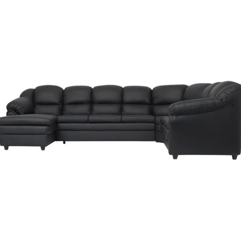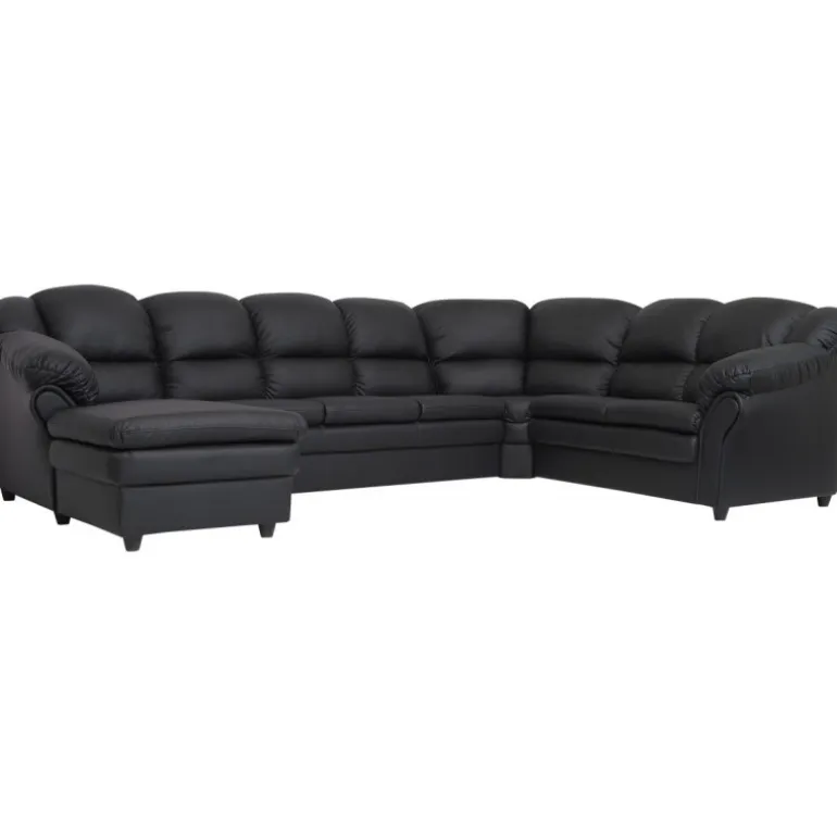Rummelig hjørnesofa med venstrevendt chaiselong og god plads til hele familien, Tønder hjørnesofaen er betrukket med vedligeholdelsesvenligt sort imiteret læder.
