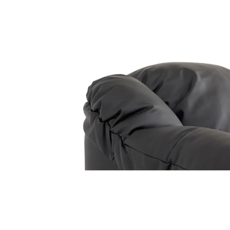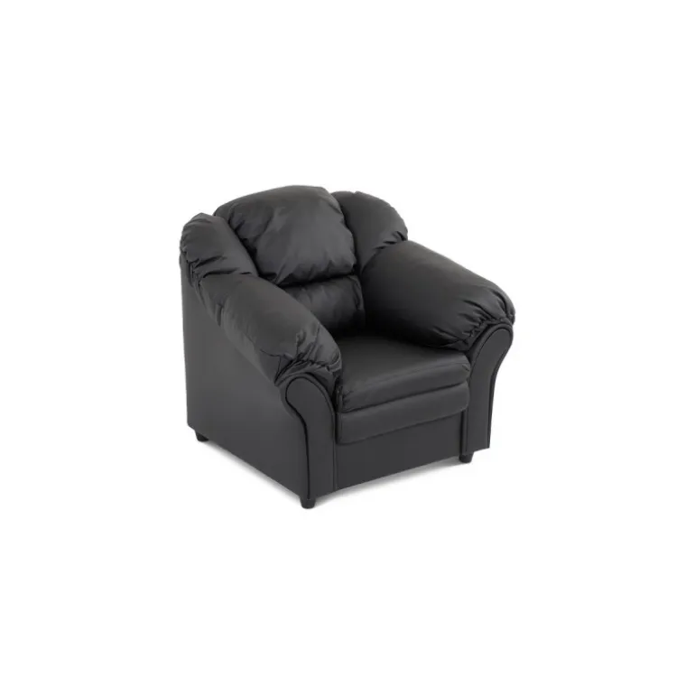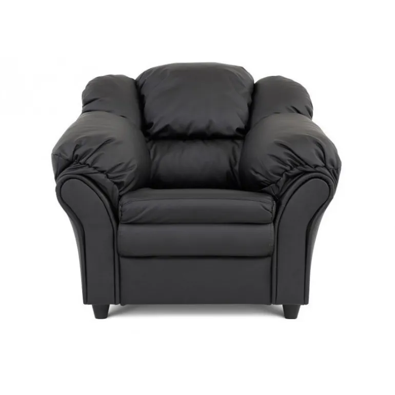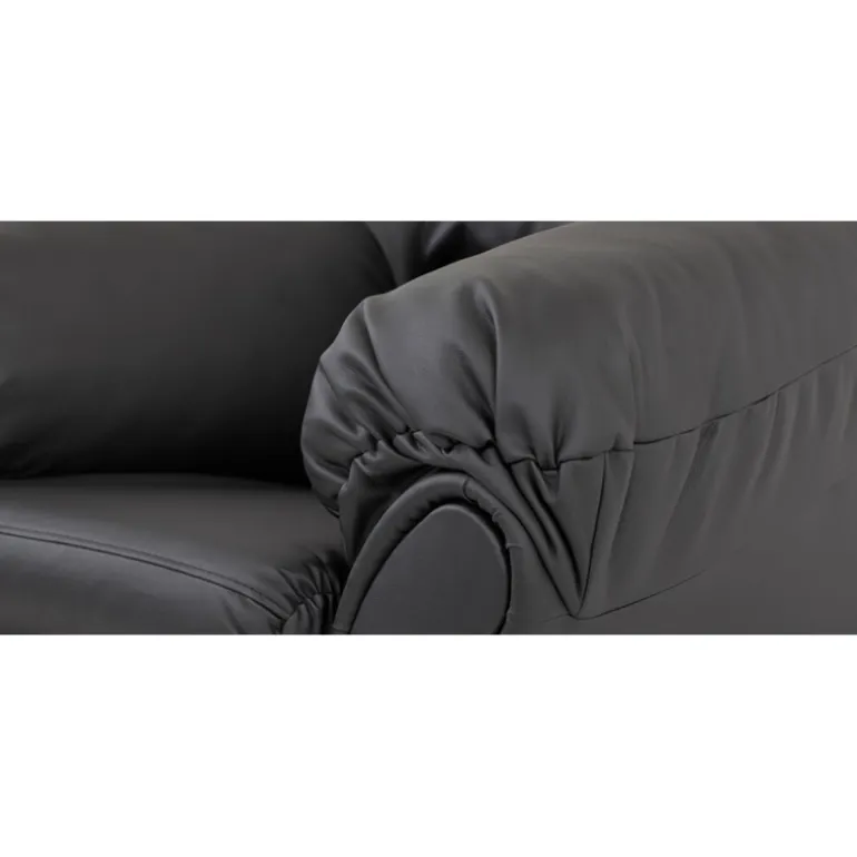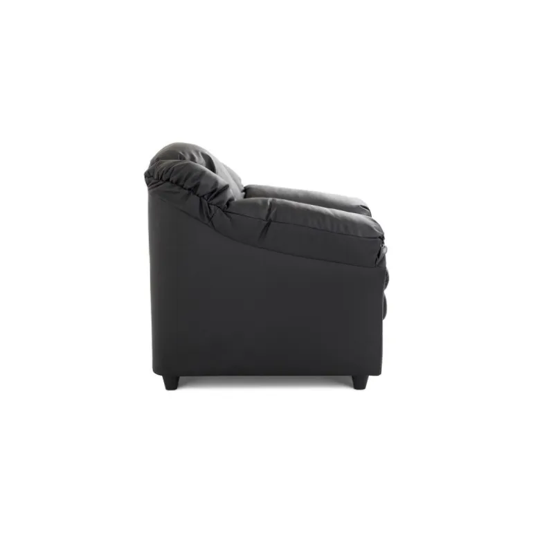 Tønder lænestol, betrukket med vedligeholdelsesvenligt sort imiteret læder. Tønder er en klassisk serie af møbler til dagligstuen med velpolstrede puder, særligt udformet for optimal støtte og komfort. Sofaerne er bygget i moduler som gør det muligt at udbygge eller mindske sofaen med hjørnedele, chaiselongdele, armlæn og 2 eller 3 pers. sædedele.