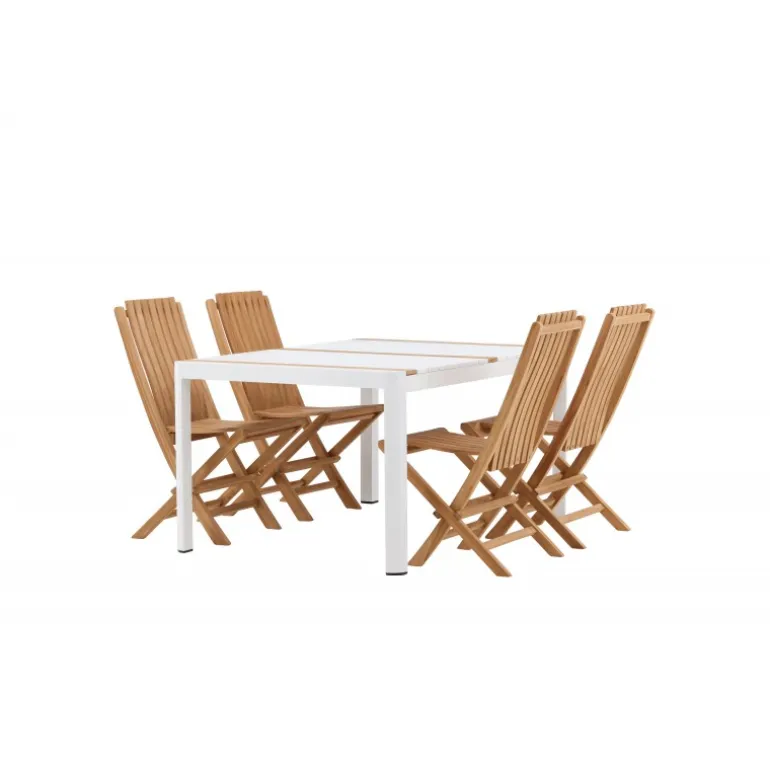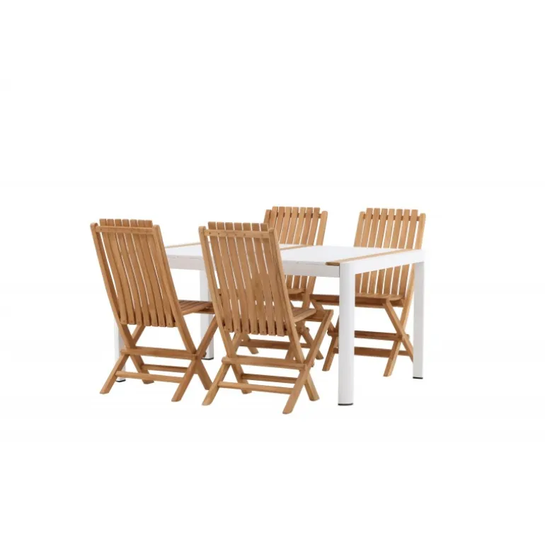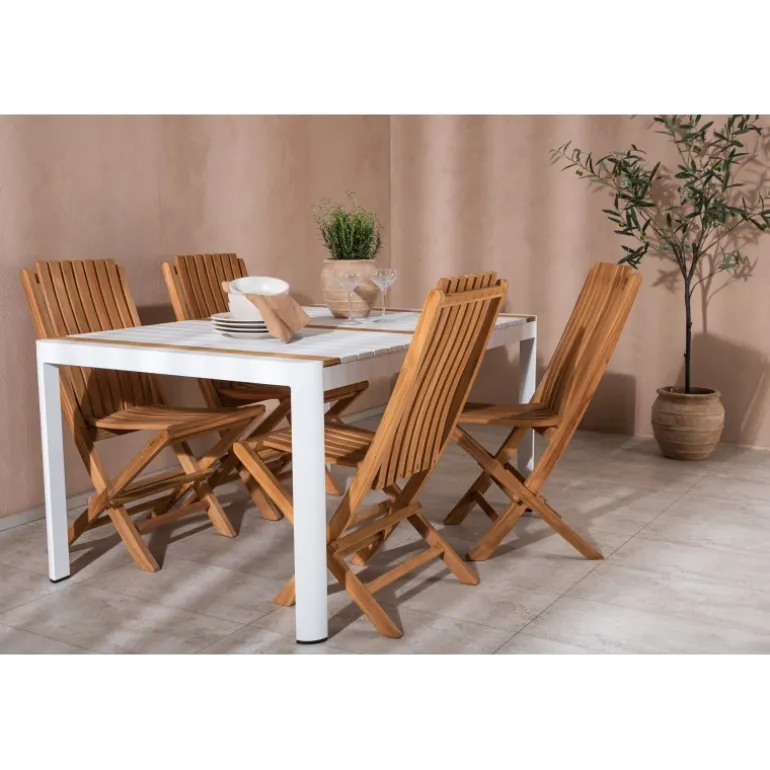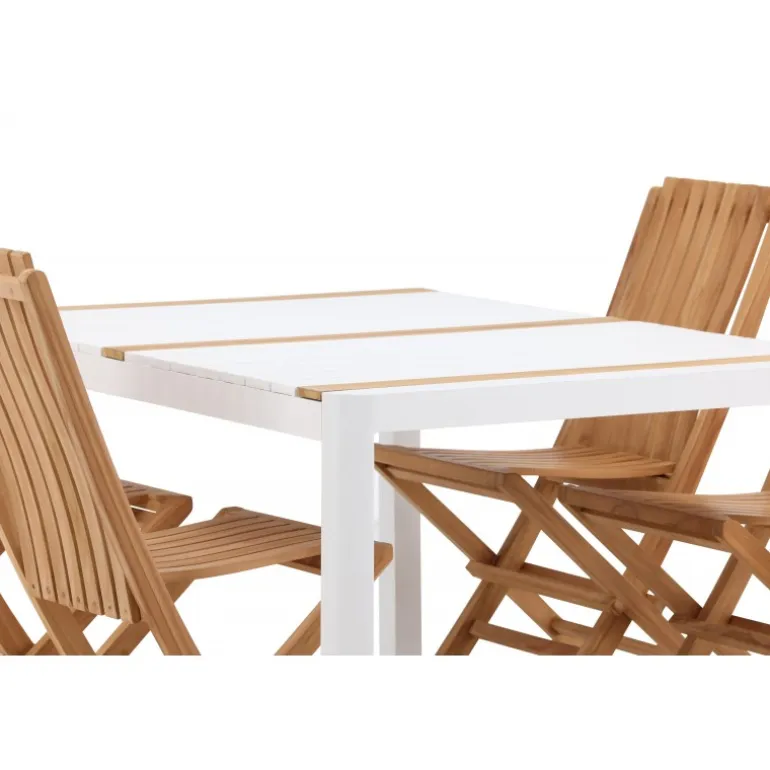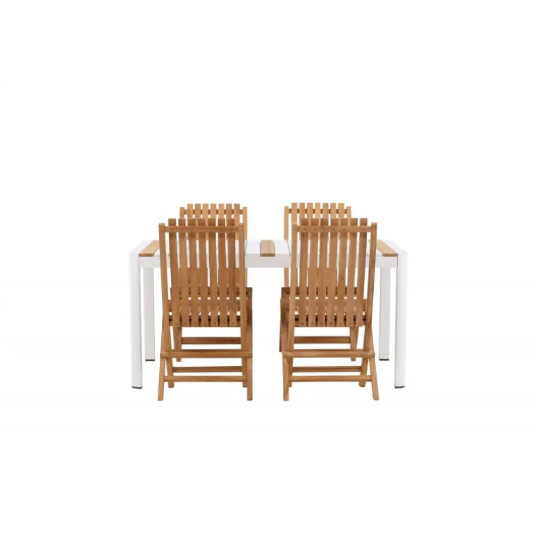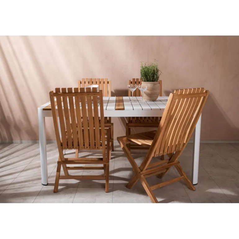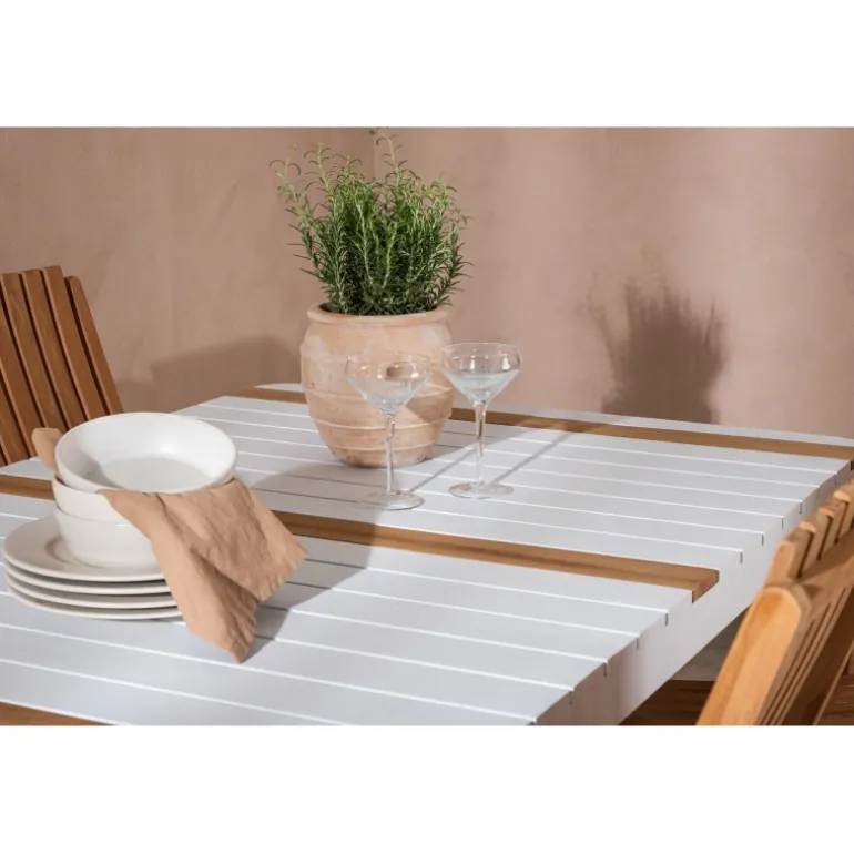 Skab en elegant blikfang, der imponerer – dette Loungesæt – Havemøbelsæt er lige så iøjnefaldende som det er holdbart! Spisebordet Togo har en smagfuld udformning med en rektangulær bordplade i hvid og træfarvet teak og et hvidt aluminiumsstel. De lækre teakdetaljer i bordpladen gør bordet perfekt matchende med spisebænkene fra Ghana-serien. Stolene er sammenklappelige og lavet af smagfuld teak i et ribbet design, der giver et meget moderne indtryk. Lad tiden her være dagens højdepunkt!