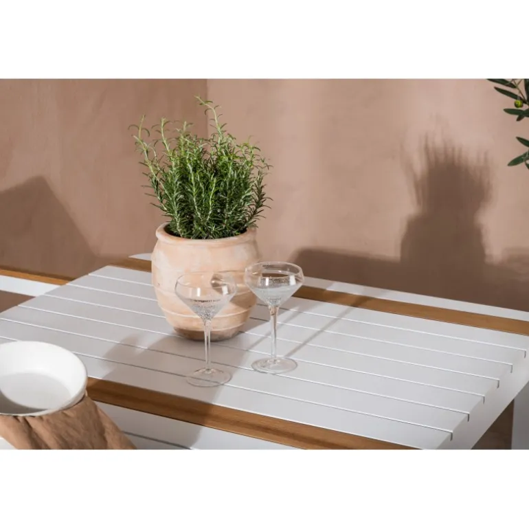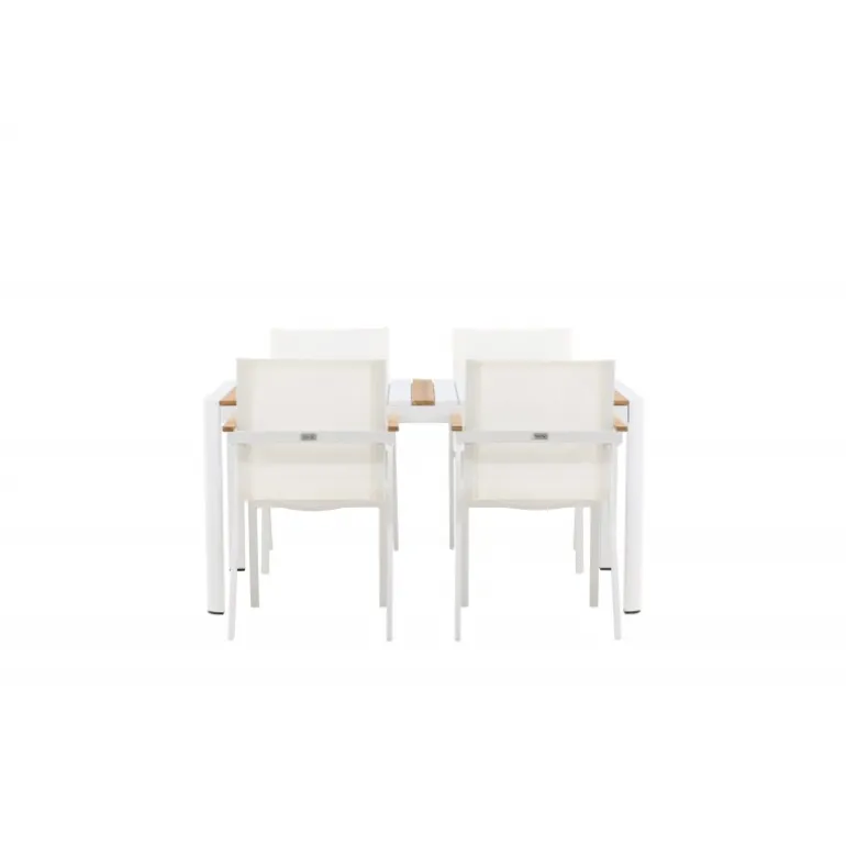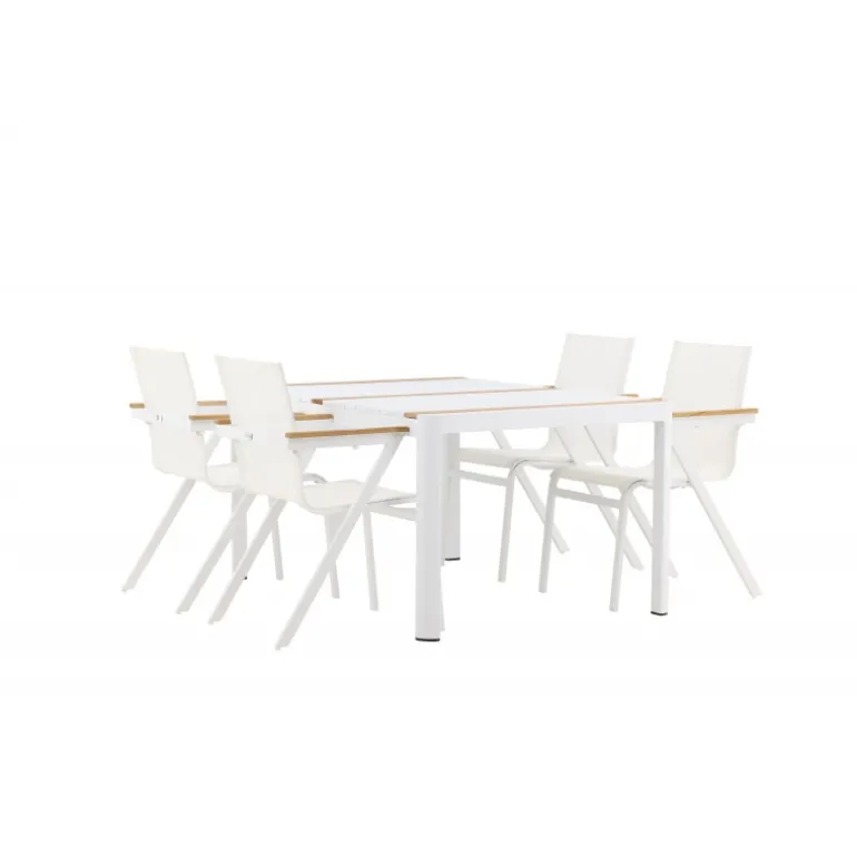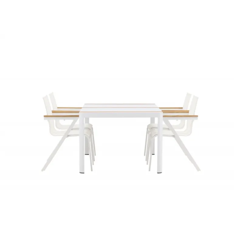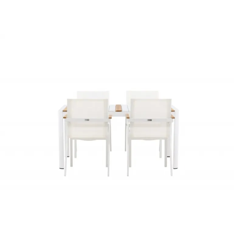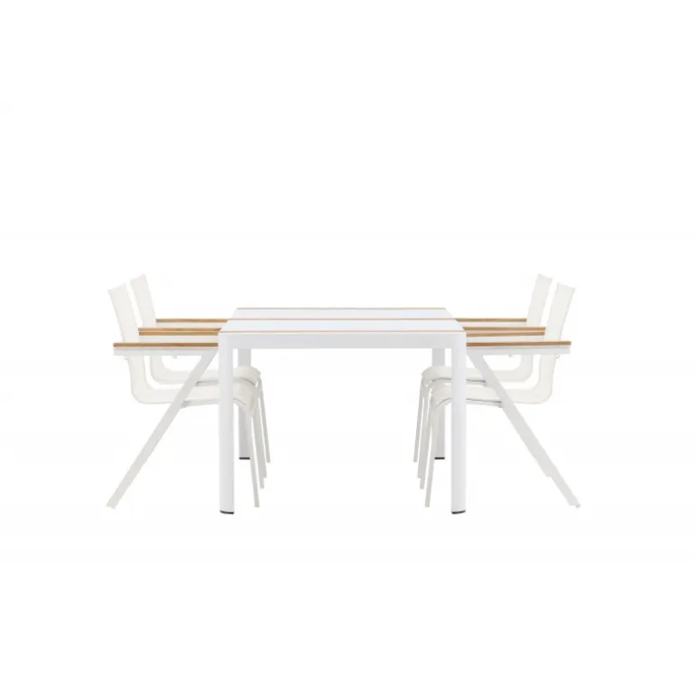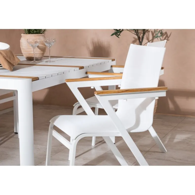 Skab et trendsikkert blikfang, der imponerer – dette Loungesæt – Havemøbelsæt er lige så iøjnefaldende som holdbart! Spisebordet Togo har en smagfuld udformning med en rektangulær bordplade i hvid og træfarvet teak og et hvidt aluminiumstel. Dimensioner: 150x100cm. Her i en smart kombination med spisebordsstolene fra serien Mexico i skandinavisk design. Fremstillet af hvidt aluminium med sæde i tekstil og armlæn i dekorativ teak, som vil være en flot, matchende detalje. Stolen er stabelbar for nem opbevaring. Her kan du sidde længe og nyde sommeraftenerne!