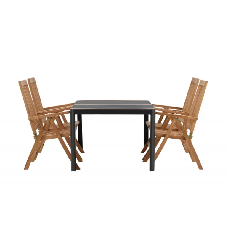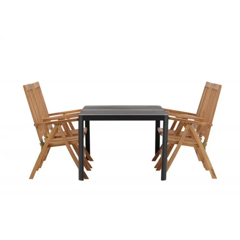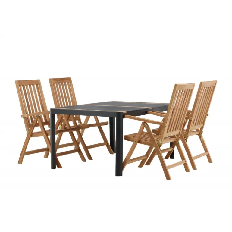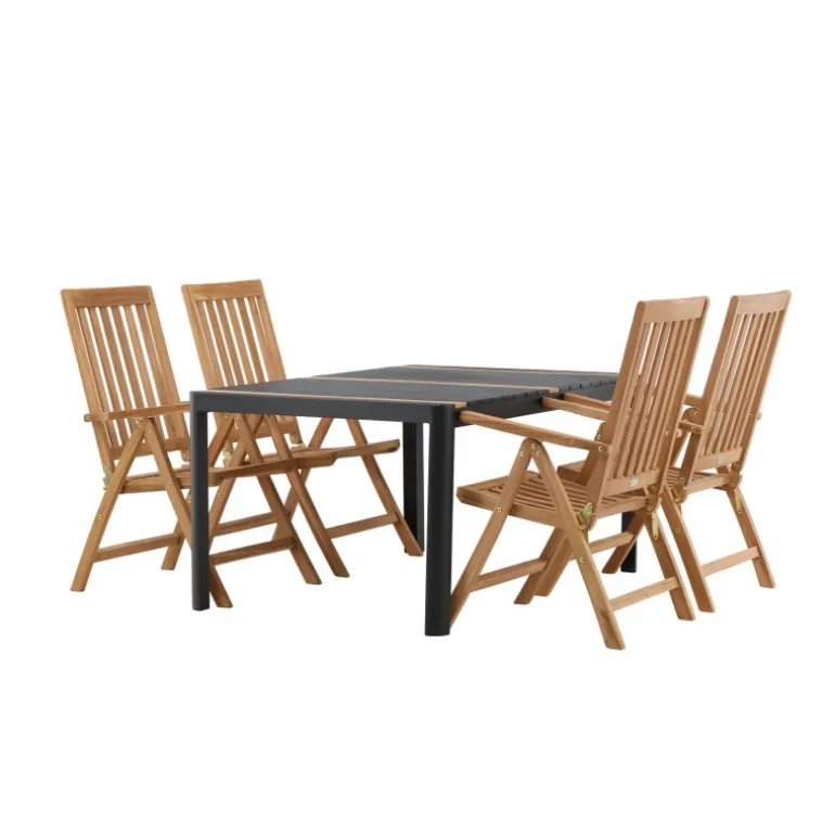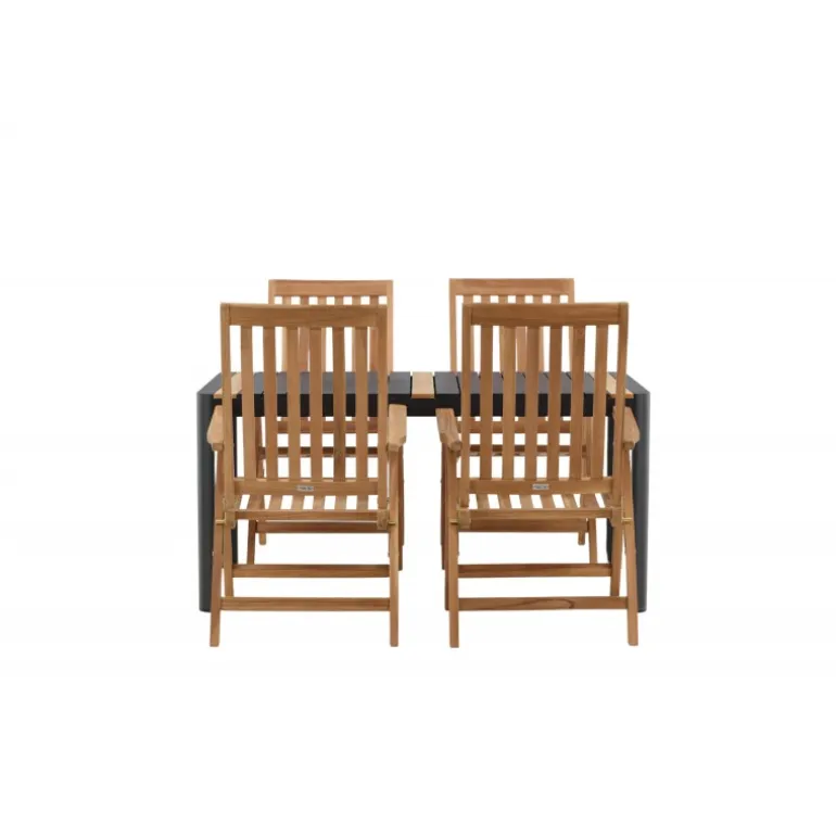 Skab en blikfang, der imponerer – dette Loungesæt – Havemøbelsæt er lige så iøjnefaldende som det er holdbart! Togo spisebord har en elegant udformning med en rektangulær bordplade i sort og teakfarvet træ og et understel i sort aluminium. De lækre teakelementer i bordpladen gør, at bordet passer perfekt sammen med spisestolene fra Kenya-serien. Stolene er foldbare og har armlæn for ekstra komfort. Lavet af smagfuld teak i et ribbet design, der giver et meget moderne indtryk. Lad tiden her være dagens højdepunkt!