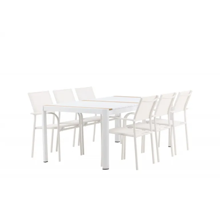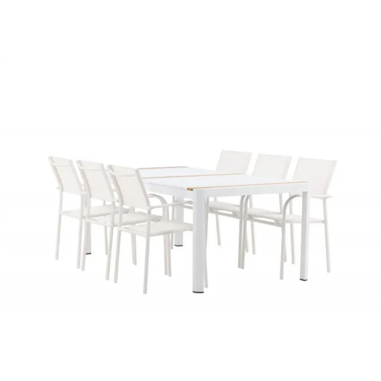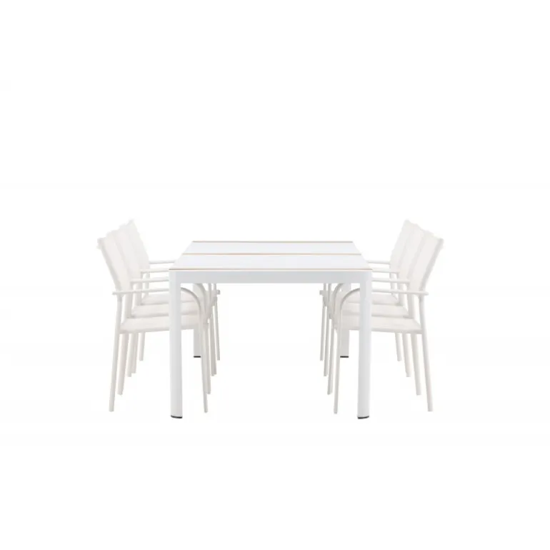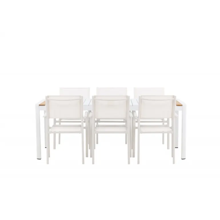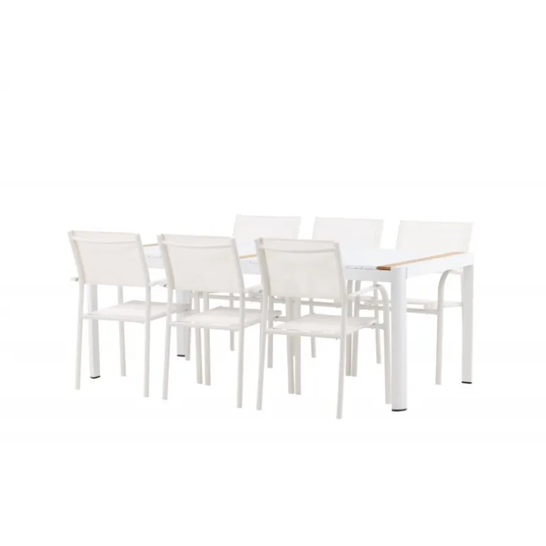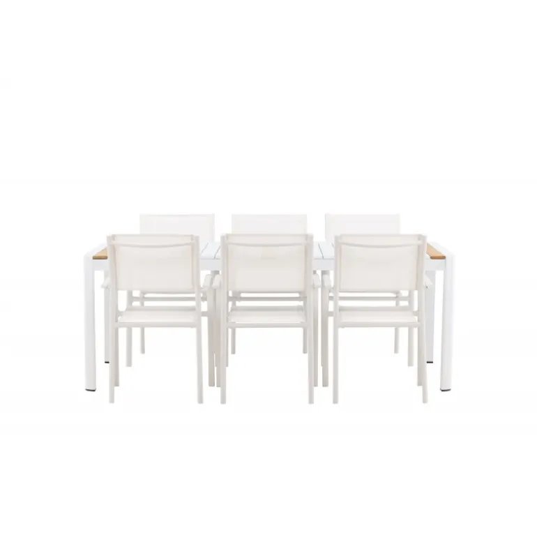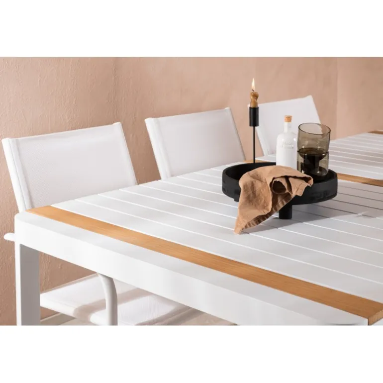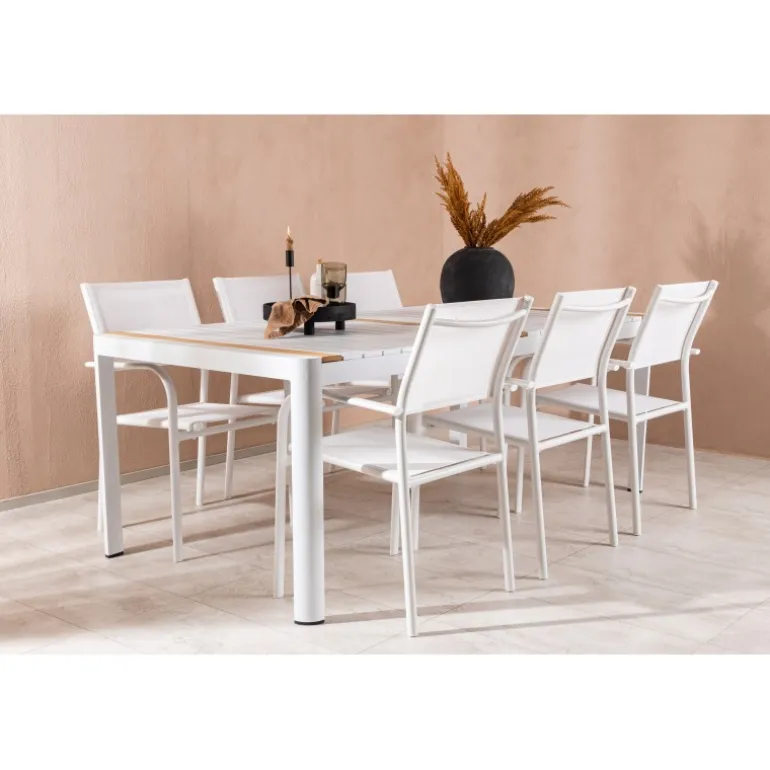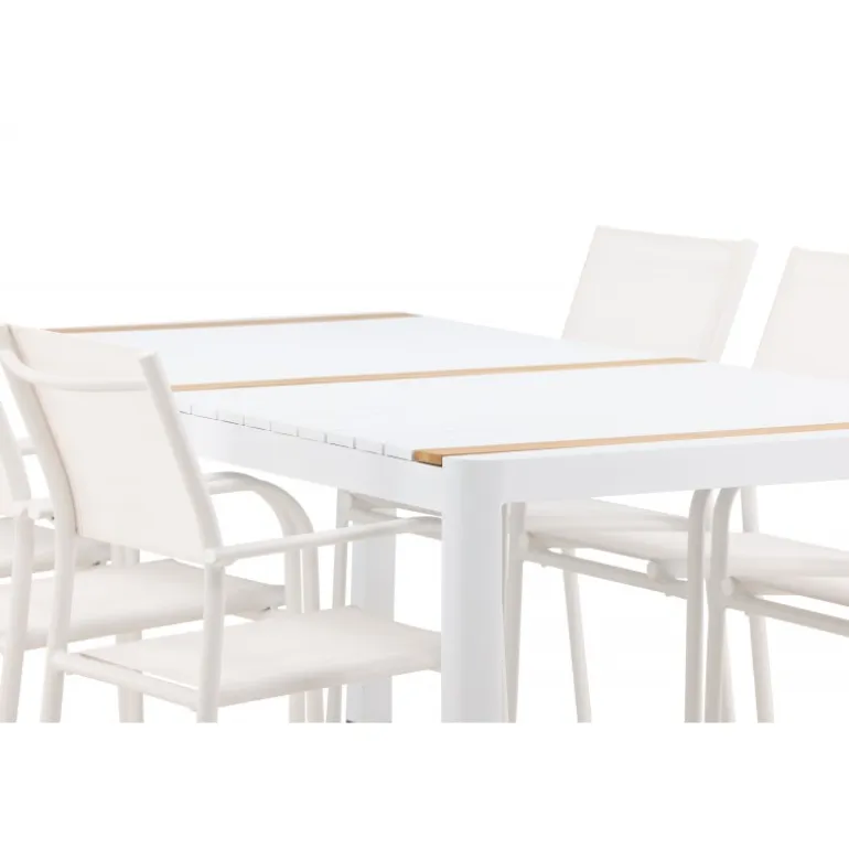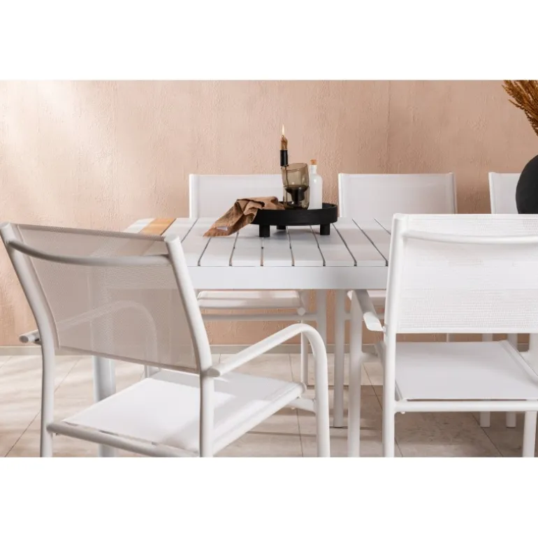 Gør terrassen indbydende og charmerende med et Loungesæt – Havemøbelsæt, der skriger luksus! Spisebordet Togo har et smagfuldt design med en rektangulær bordplade i hvid og teaktræ samt en hvid aluminiumsunderstel. Dimensioner: 200×100 cm. Her i en smart kombination med elegante spisestole fra Santorini-serien. Stolene har lige nordiske former med integrerede armlæn i aluminium og sæde i hvidt tekstil. De er også stabelbare for praktisk opbevaring. Nyd måltider udendørs denne sommer!