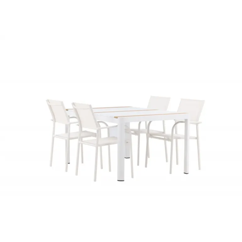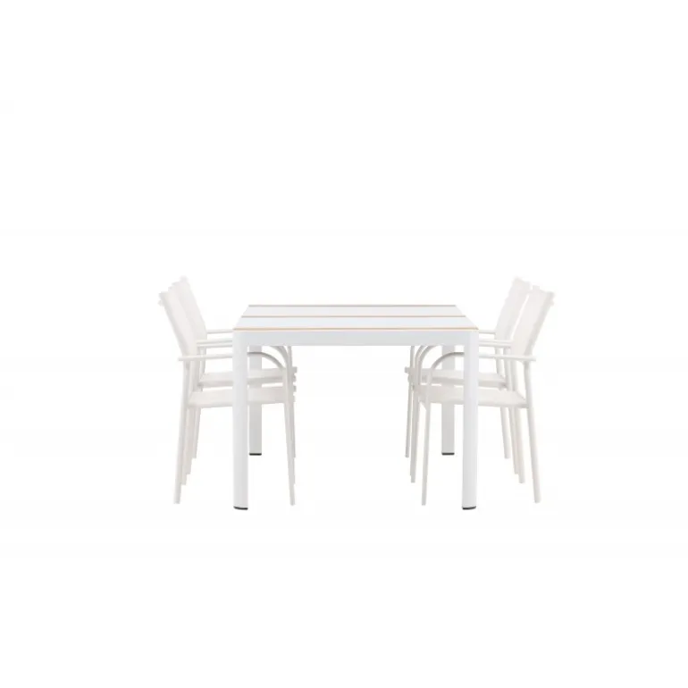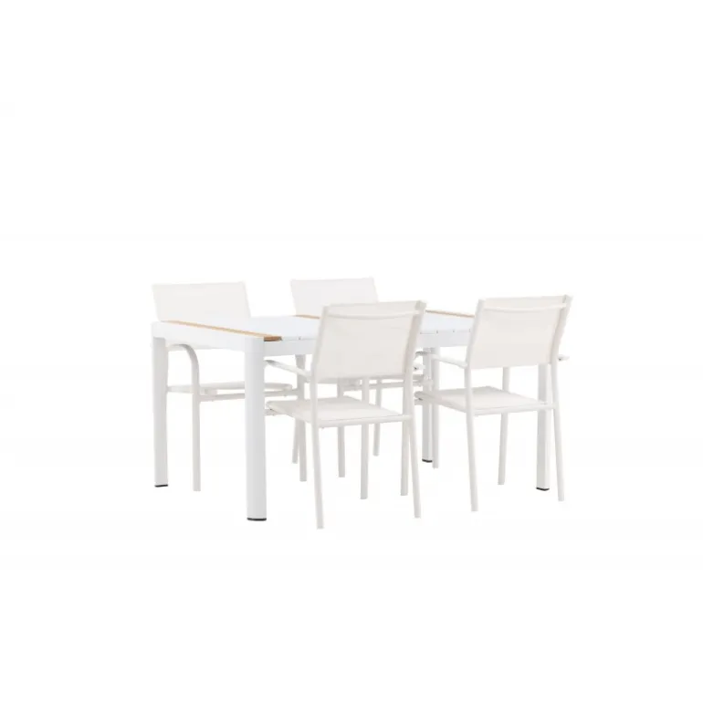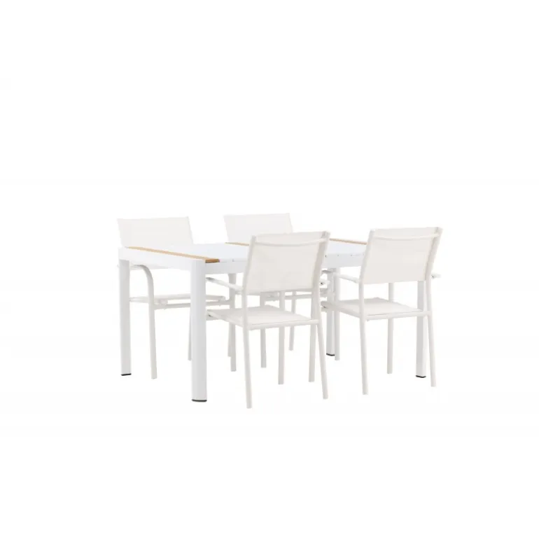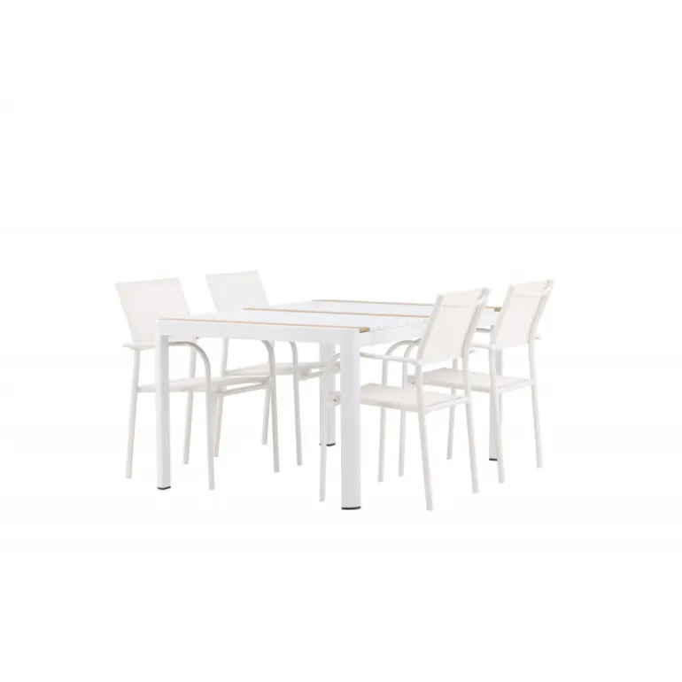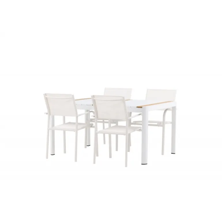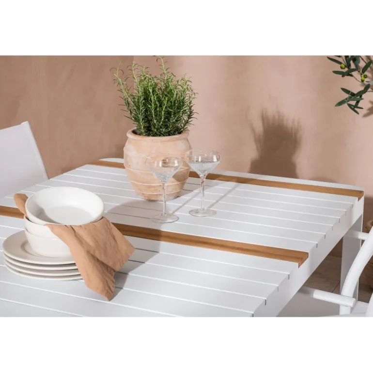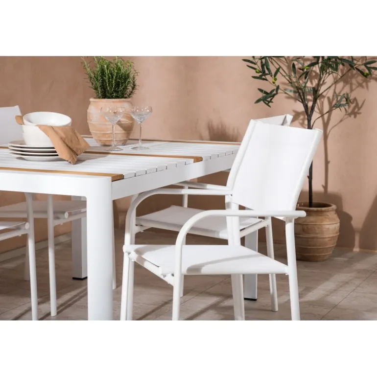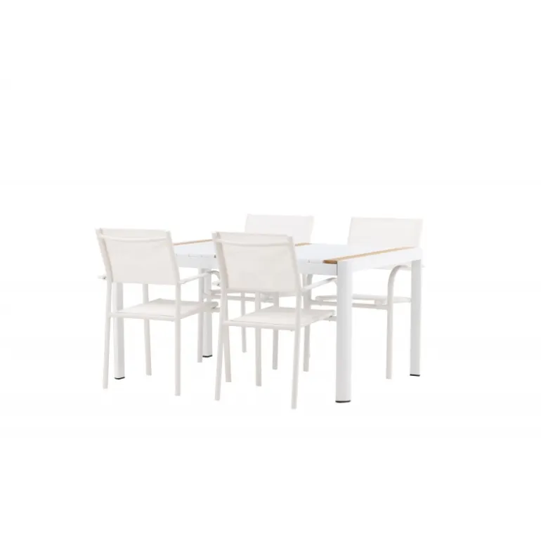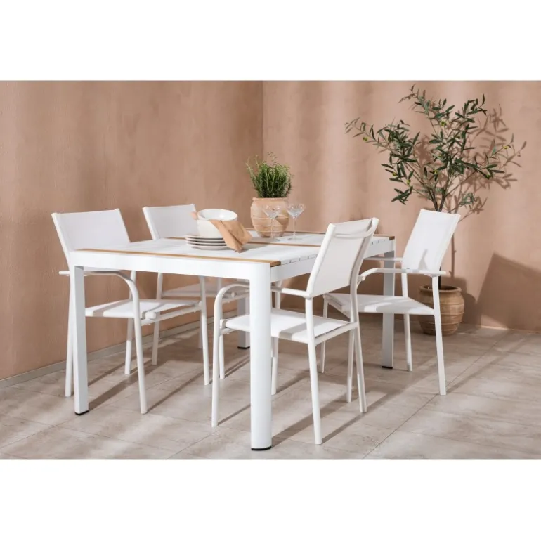 Skab et elegant blikfang, der imponerer – denne Loungesæt – Havemøbelsæt er lige så iøjnefaldende som holdbar! Spisebordet Togo har et smagfuldt design med en rektangulær bordplade i hvid og træfarvet teak og et hvidt aluminiumstel. Dimensioner: 150x100cm. Her i moderne kombination med hvide spisebordsstole fra serien Santorini. Stolene har lige nordiske former med integrerede armlæn i aluminium og et sæde i hvid tekstilen. De er også stabelbare for praktisk opbevaring. Invitér til mange hyggelige måltider fremover!