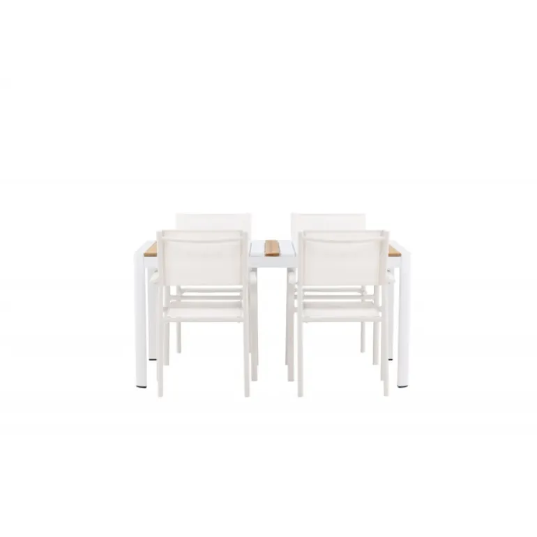 - Holdbart materiale: Bord i aluminium og teak, stole i aluminium og tekstilen.