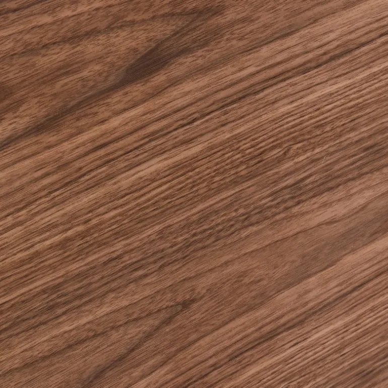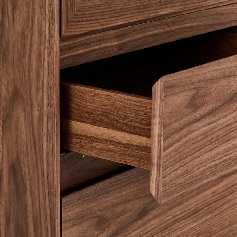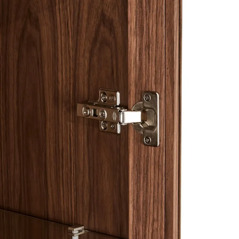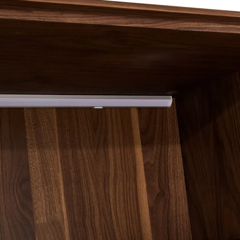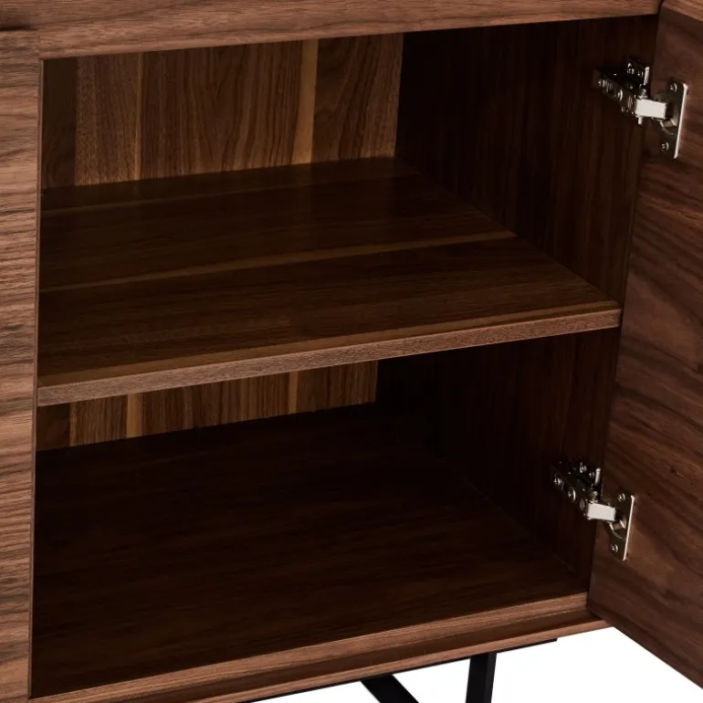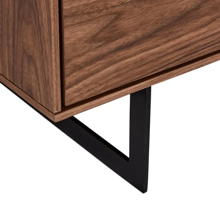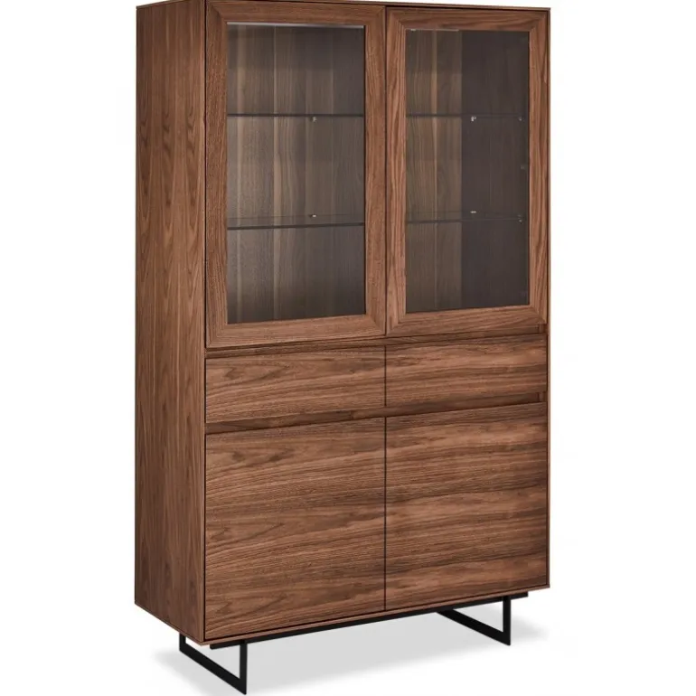 Elegant og funktionelt vitrineskab med korpus i MDF beklædt med amerikansk valnødfiner og sort metalstel. Skabet er udstyret med 2 låger, 2 skuffer samt 3 justerbare hylder (18 mm tykke). Alle låger og skuffer har soft-close system, og det integrerede LED-lys fremhæver indholdet på en smuk og stemningsfuld måde. En moderne og tidløs løsning til stuen eller spisestuen.