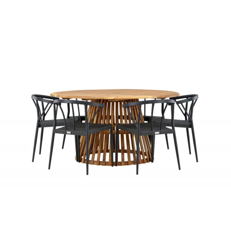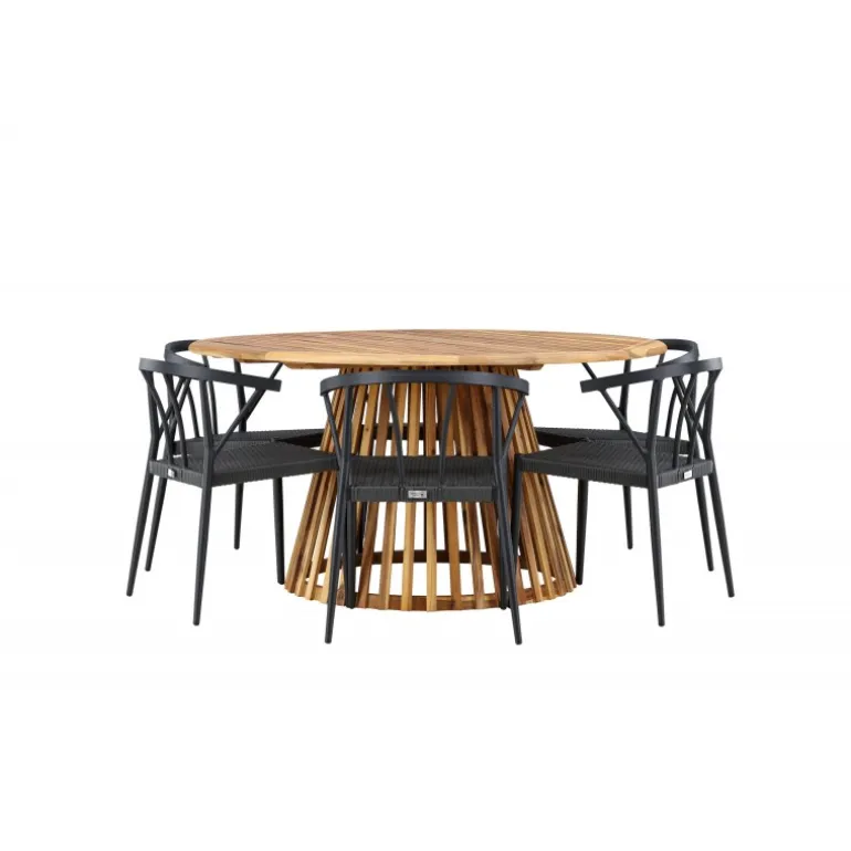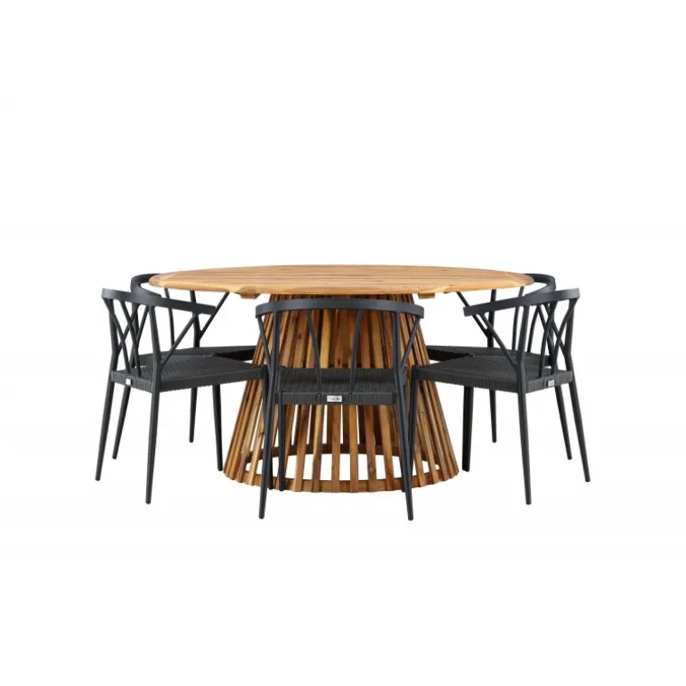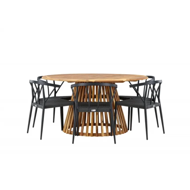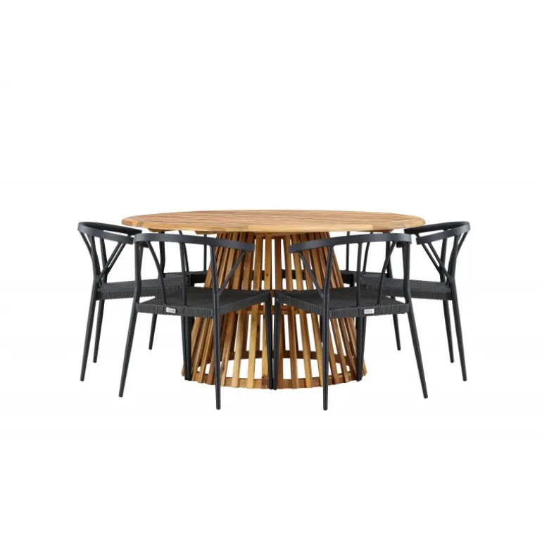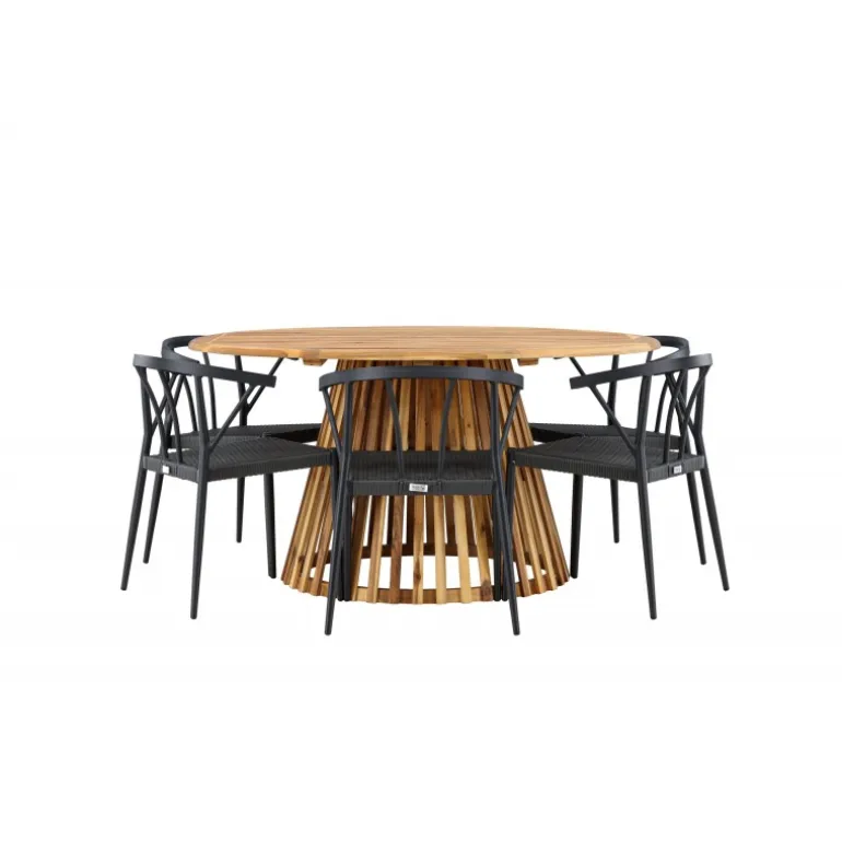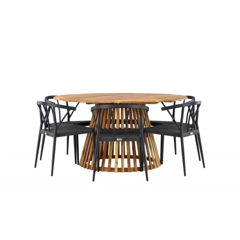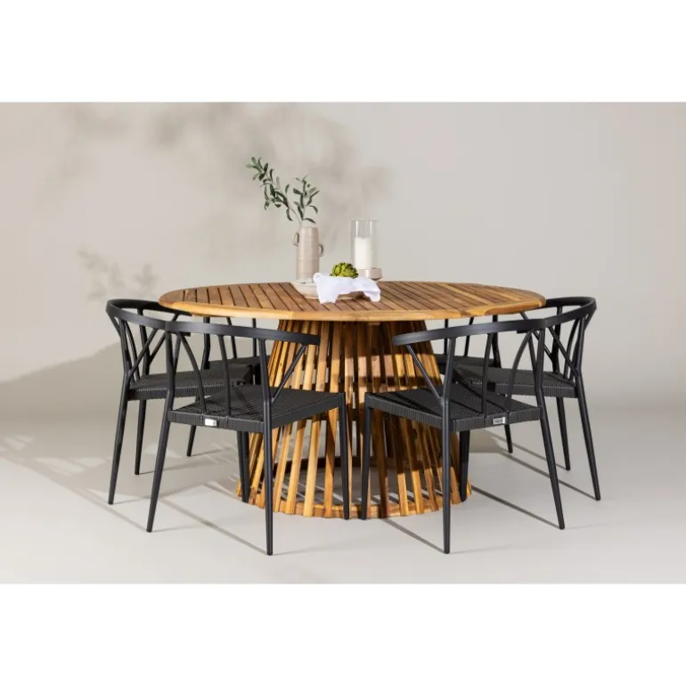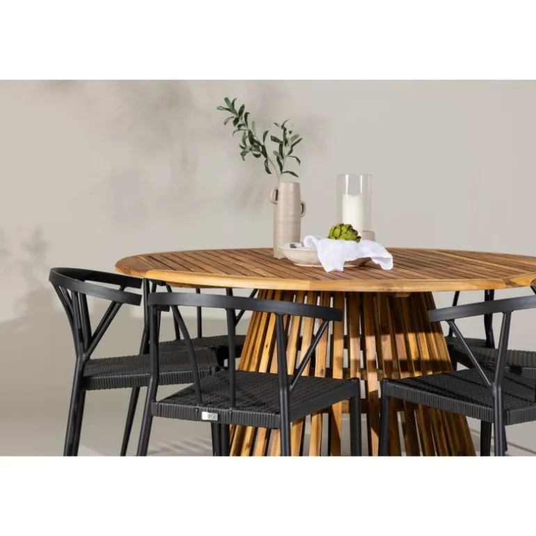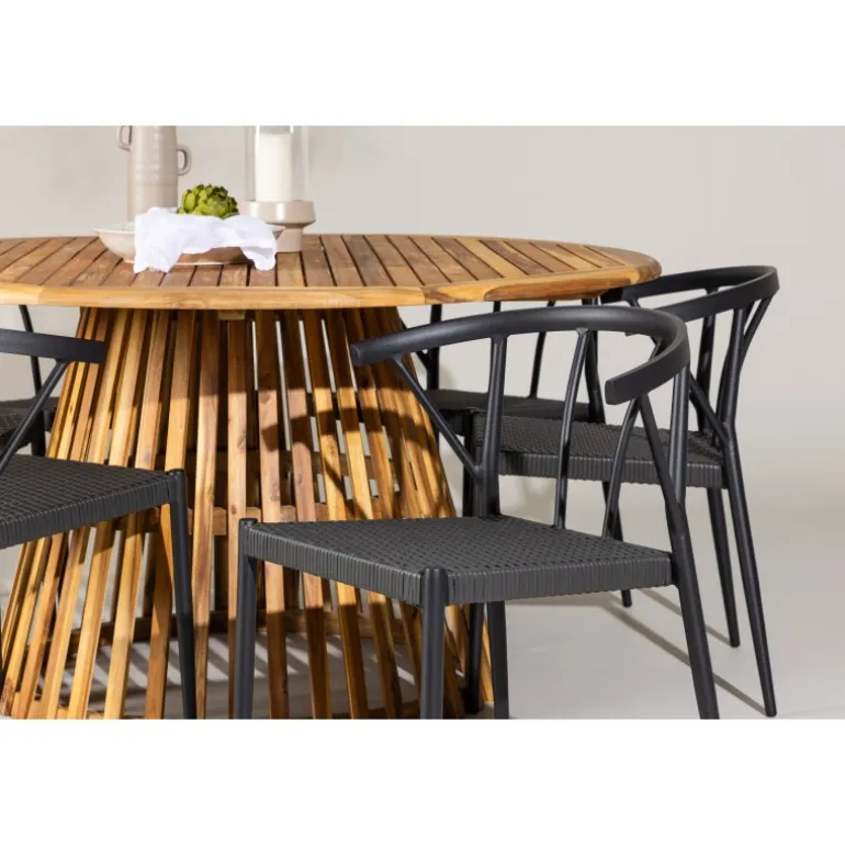 Opdag det perfekte Loungesæt – Havemøbelsæt til din udendørs omgivelser med vores elegante Tucuman bord og de stilfulde Stina stole. Med en imponerende diameter på 150 cm tilbyder Tucuman bordet masser af plads til familiemiddage og hyggelige sammenkomster i det fri. Fremstillet af akacietræ, tilføjer Tucuman bordet en naturlig og indbydende atmosfære til dit udendørsområde med sin harmoniske naturfarve. Dets design integreres sømløst i omgivelserne og skaber en fredelig atmosfære, hvor du og dine gæster kan slappe af og nyde lækre måltider. Stina stolene er lavet af fletmateriale, hvilket giver dem en robust konstruktion til udendørs brug. Den elegante sorte farve på stolene tilføjer et sofistikeret touch til din udendørs spisestue og komplimenterer bordets naturlige træfarve på en stilfuld måde. Dette Loungesæt – Havemøbelsæt leveres komplet med seks komfortable stole, perfekt til afslappede måltider og sociale sammenkomster udendørs. Med Tucuman og Stina Loungesæt – Havemøbelsættet kan du skabe et indbydende og stilfuldt udendørsmiljø, hvor din familie og gæster kan nyde fuldt ud.