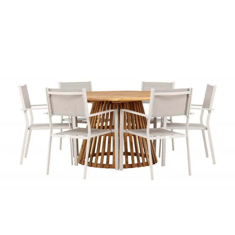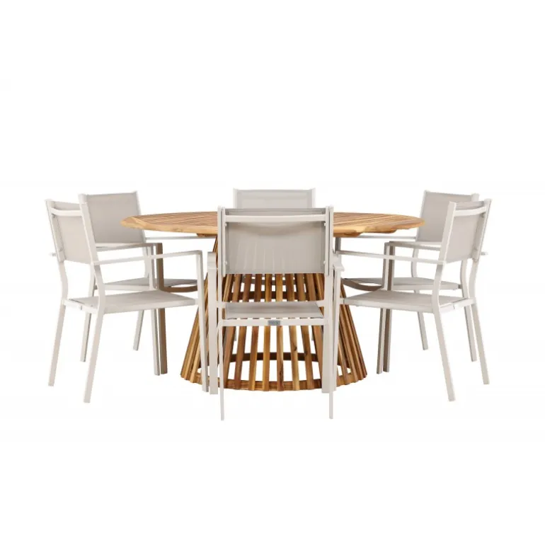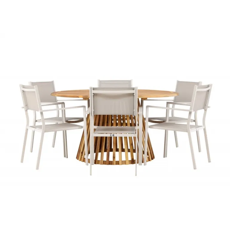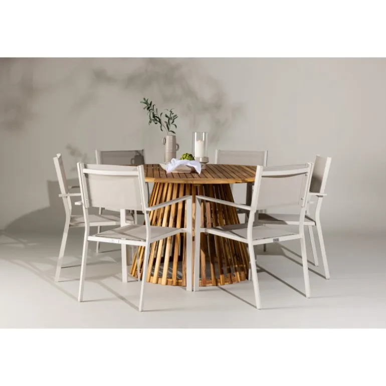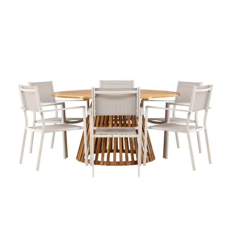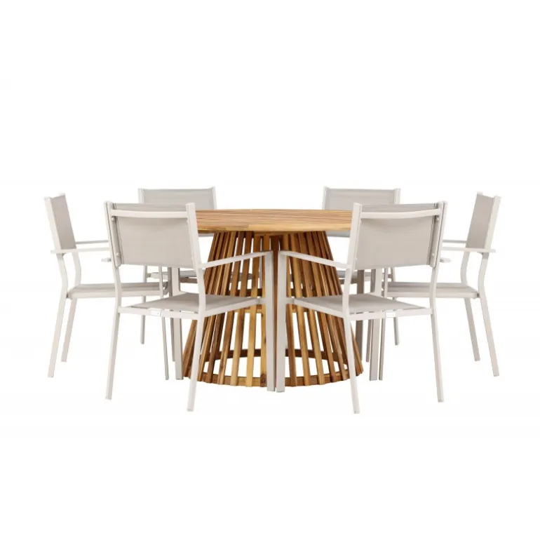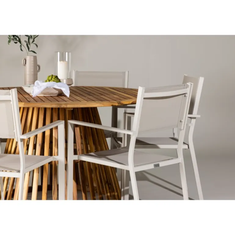 - Moderne design: Copacabana-stolene er lavet af aluminium og har en blød beige farve, der komplementerer bordets naturlige tone.
