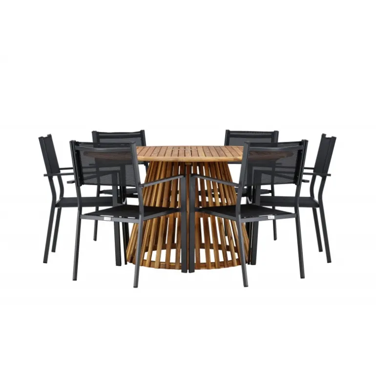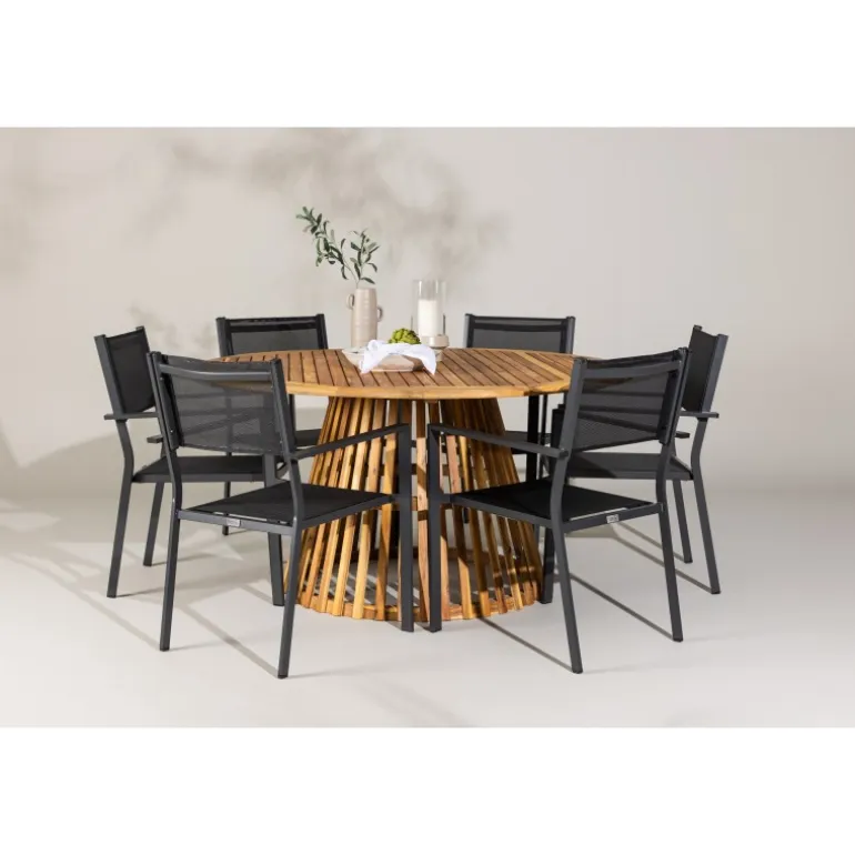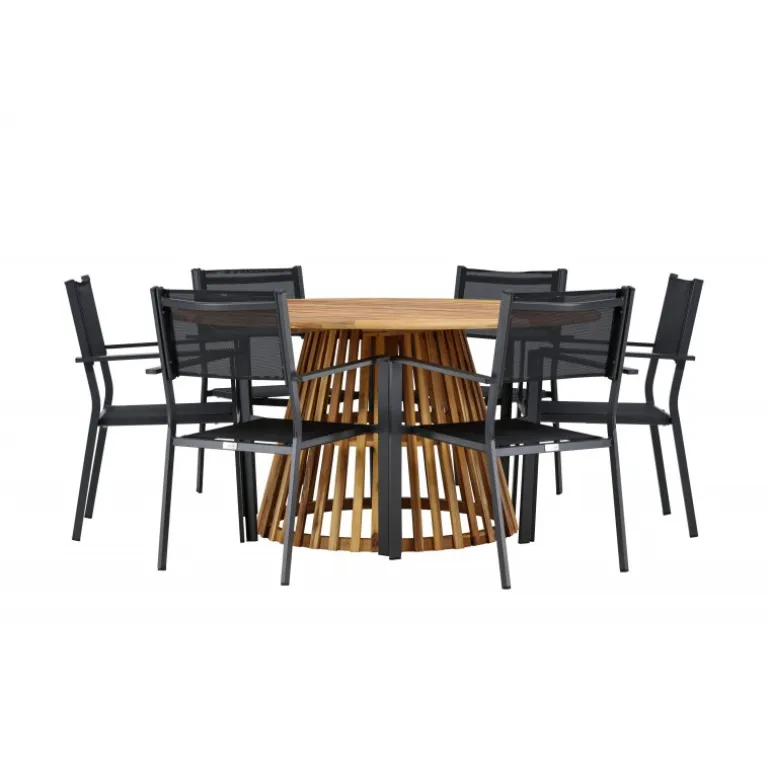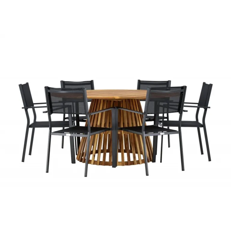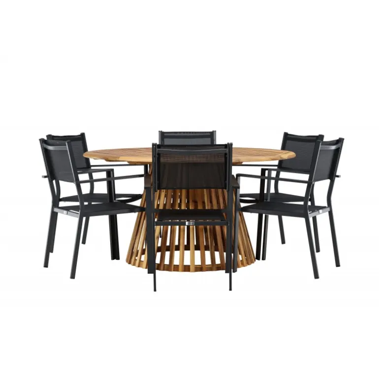 - Plads til alle: Bordet har en diameter på 120 cm og leveres med seks stole, hvilket gør det ideelt til familiemiddage og sociale sammenkomster.