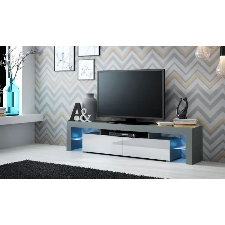 Oplev den elegante og funktionelle TV bord SOLO grå mat/hvid højglans. Dette stilfulde TV bord kombinerer et moderne design med praktiske funktioner, der gør det til en perfekt tilføjelse til dit hjem. Med dimensionerne Højde: 45 cm, Bredde: 200 cm, Dybde: 35 cm passer det perfekt under dit TV og giver rigelig opbevaringsplads. Korpus er lavet af lamineret spånplade, mens frontdørene er af lamineret MDF i højglans. Systemet PUSH-CLICK giver nem adgang til opbevaringsrummet, og de nedfældelige døre og glashylder med lys (belysning ikke inkluderet, 2LED belysning tilgængelig) tilføjer et moderne touch.