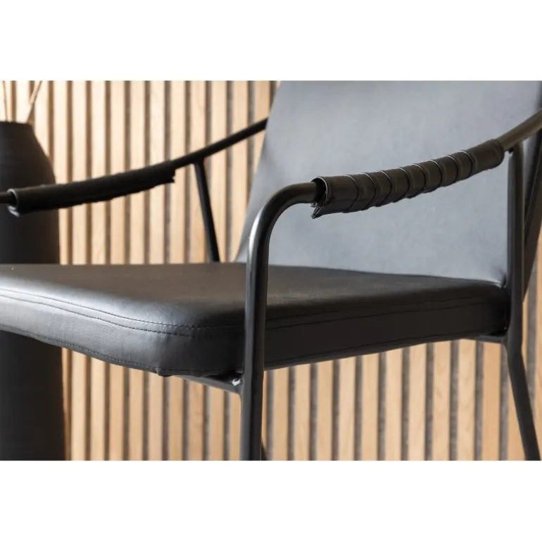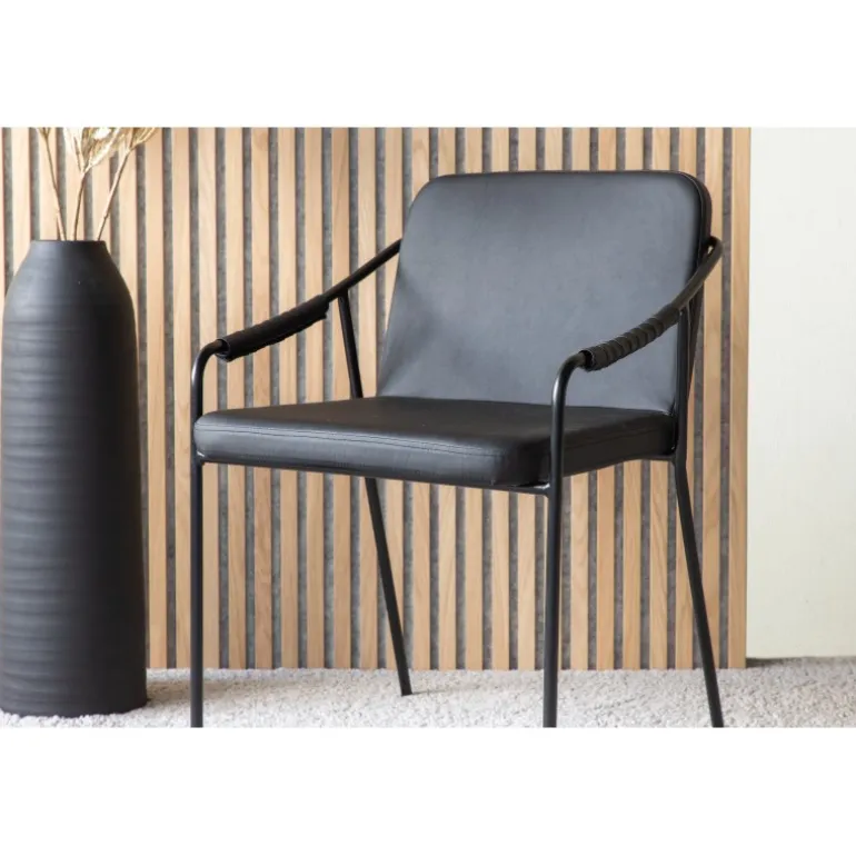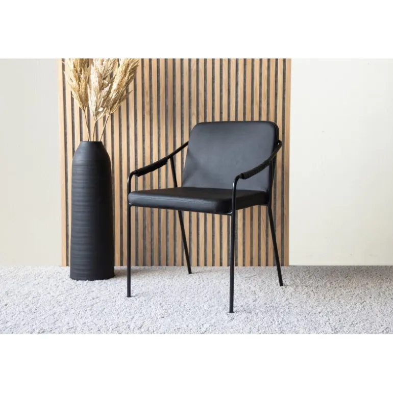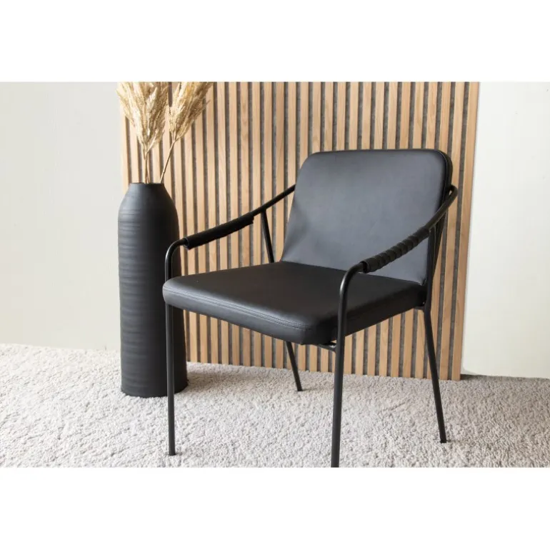 Tvist Spisestuestol er dit perfekte valg til både stuen og køkkenet. Stolen er gennemgående i sort farve og tilbyder et sæde og ryg i sort polyurethanmembran og polyester, samt ben i jern. Det modige design og den trendy stil giver dig en spisestuestol, der forbedrer stemningen ved alle måltider og løfter din indretning til det næste niveau! For daglig pleje anbefaler vi støvsugning. Hvis du ønsker at tørre møblet af, bør du bruge en mikrofiberklud i varmt vand. Tilføj gerne nogle pumper med midler beregnet til materialet og vrid kluden grundigt.
