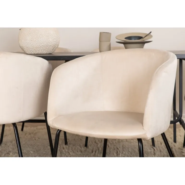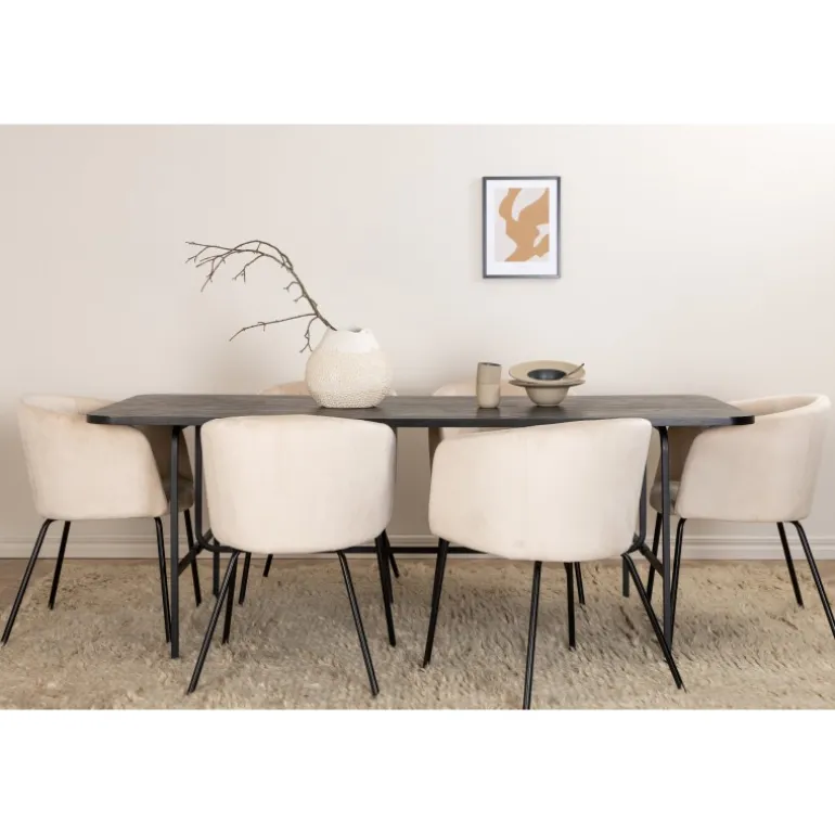 Vores populære spisebord Uno er lige så stilfuldt som tidløst! Bordet er rektangulært designet med let afrundede hjørner, en topplade i sort MDF med finér og elegante underben i sort metal. Her i perfekt kombination med 6 Berit spisebordsstole i beige fløjlsstof og stilfulde smalle stoleben i sort jern. Et Spisebordssæt med fokus på komfort og elegance!