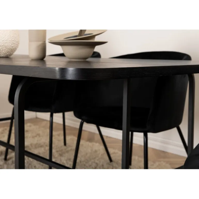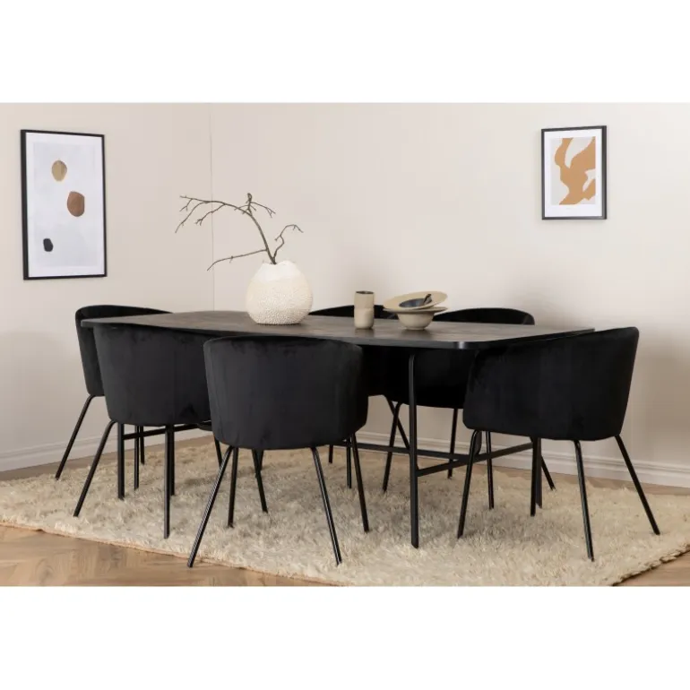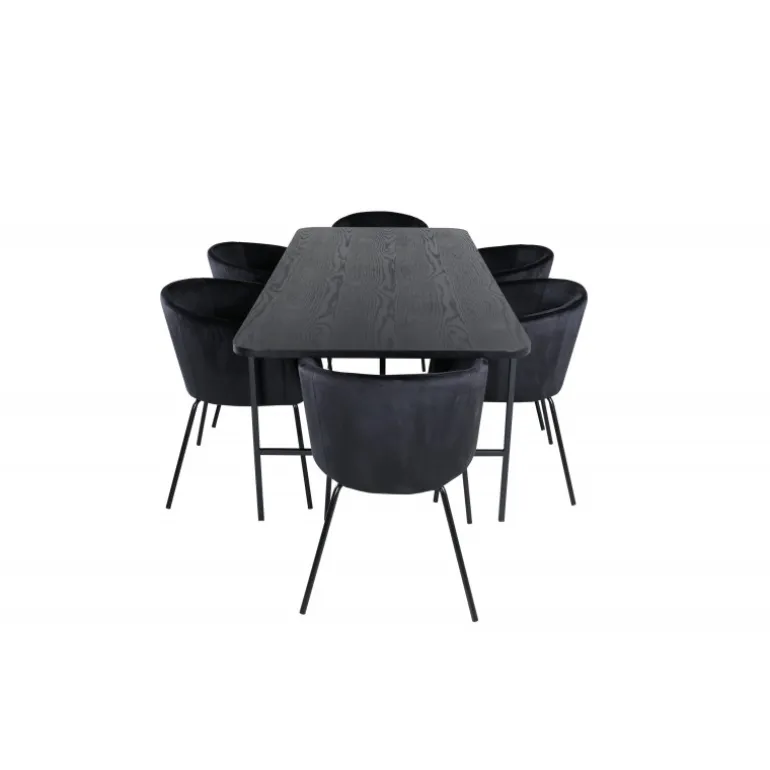 Et madgruppesæt, der fokuserer på komfort og elegance! Vores populære spisebord Uno er lige så stilfuldt som tidløst. Bordet er rektangulært designet med let afrundede hjørner, en topplade i sort MDF med finer og stilfulde underben i sort metal. Bordmål: Længde: 200 cm, Bredde: 90 cm, Højde: 74 cm. Her i perfekt kombination med 6 Berit spisebordsstole i sort velourstof og stilfulde smalle stoleben i sort jern. Stolemål: Højde: 78 cm, sædehøjde: 49 cm, bredde: 55 cm, dybde: 55 cm.