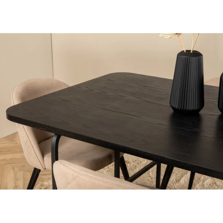 Med det klassiske og moderne Uno rektangulære Spisebordssæt kan hele familien samles til middag og socialt samvær. Bordet er rektangulært designet med let afrundede hjørner, en bordplade i sort MDF med finer og stilfulde underben i sort metal. Bordets dimensioner: Længde: 200 cm, Bredde: 90 cm, Højde: 74 cm. Matchet her med 6 Velvet Stitches spisebordsstole med sorte, flared ben i metal og sæder i beige polyester linned med dekorative syninger. Stolens dimensioner: Højde: 76,5 cm, sædehøjde: 46,5 cm, bredde: 50 cm, dybde: 57 cm. Lad dig inspirere af et opsigtsvækkende Spisebordssæt!