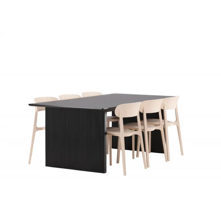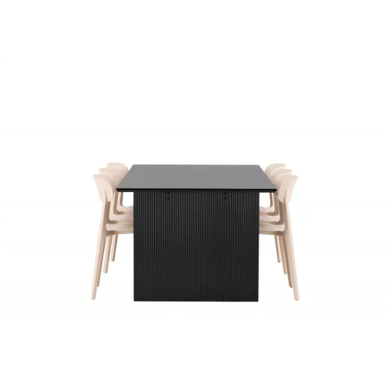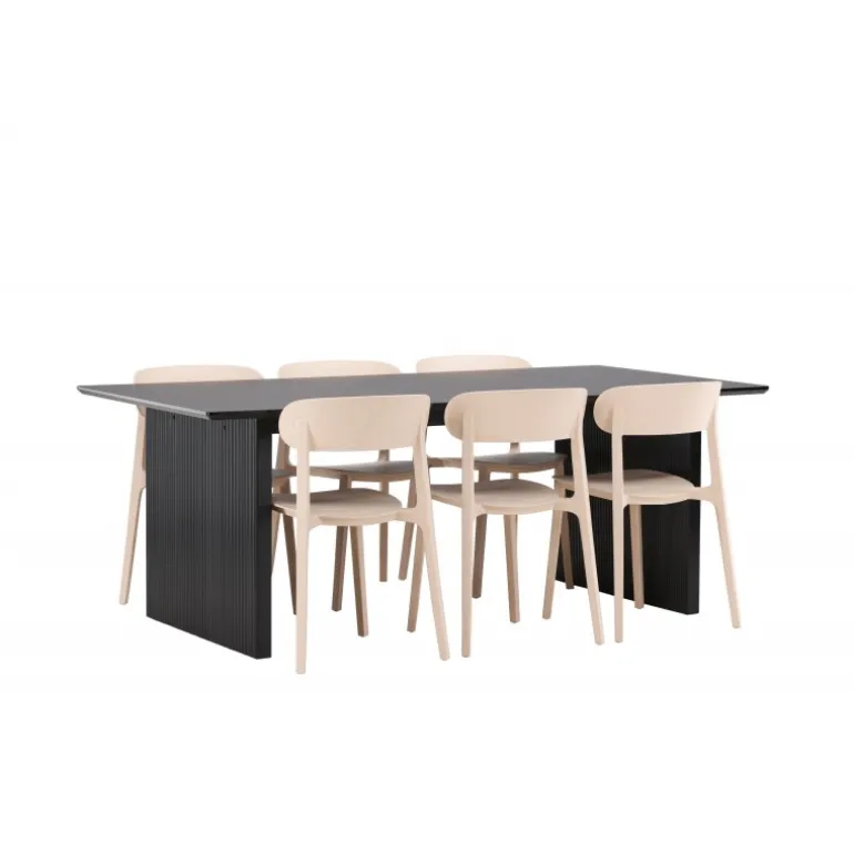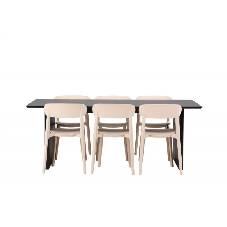 Stilfuldt, smart og elegant Spisebordssæt med alle de rigtige funktioner! Vail spisebordene har lige nordiske former og er lavet af holdbart sort MDF – både stilfuldt og praktisk. Bordpladen er tynd i et rektangulært design og balancerer på to robuste træplader, der udgør understellet. Her i fremragende kombination med vores klassiske spisebordsstole fra Åstol-serien. Stolen er samlet i en smagfuld lys-polished farve i trækomposit med et luftigt design og nordiske lige former. Nyd sociale tider foran – her får alle en plads!