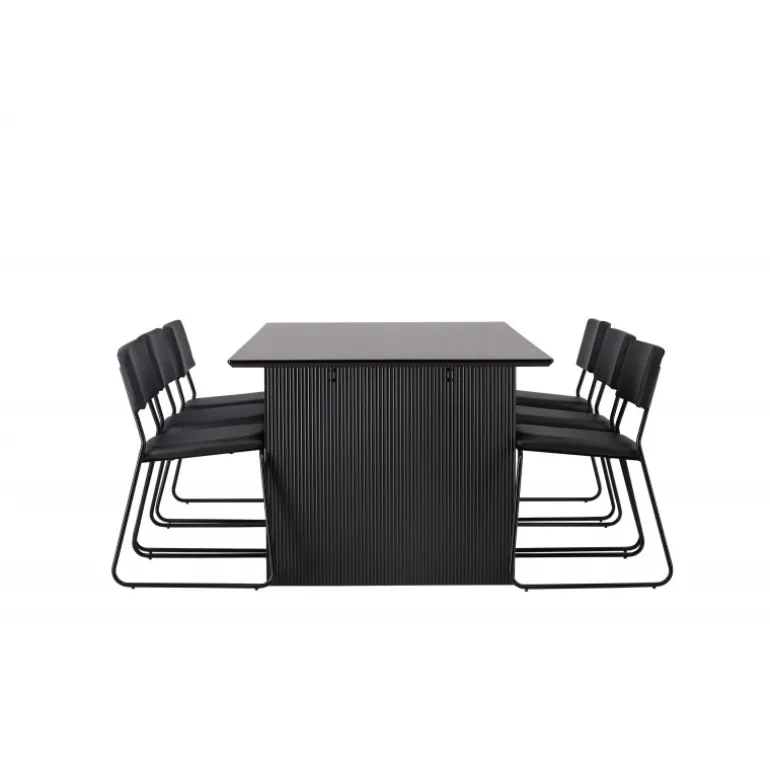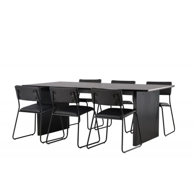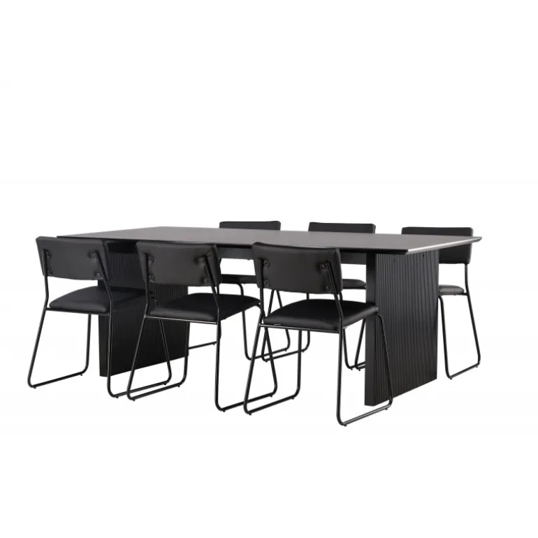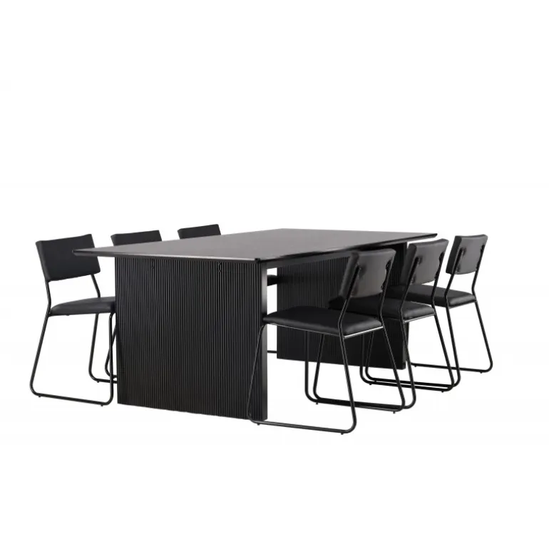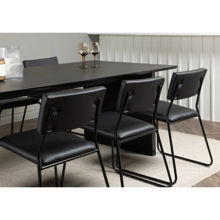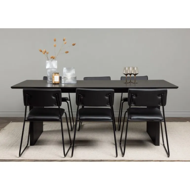 Skab en festlig atmosfære med vores Vail, Kenth Spisebordssæt! Dette sorte Spisebordssæt kommer med minimalistiske elementer og en nordisk stil. Det rektangulære spisebord Vail er lavet af holdbart MDF i en sodet sort farve. Bordpladen er tynd og rektangulær og balancerer på to robuste træplader, der udgør basen. Sættet inkluderer også vores sorte spisebordsstole fra serien Kenth. Stolene har ryg og sæde i sort polyurethanlæder og polyester samt dekorative, smalle ben i jern. Det minimalistiske design skaber en luftig følelse. Bordmål: 200×100 cm.