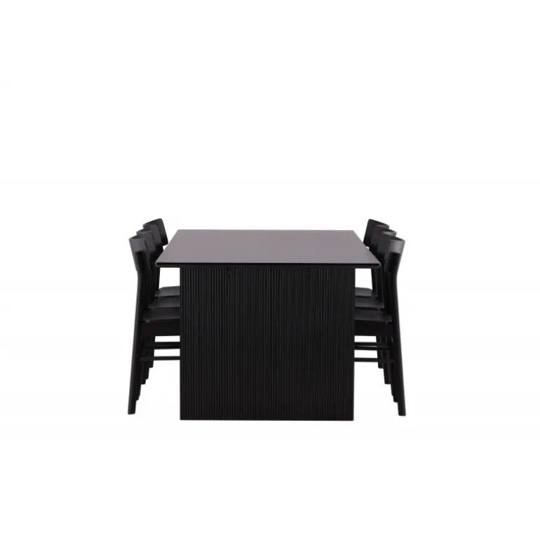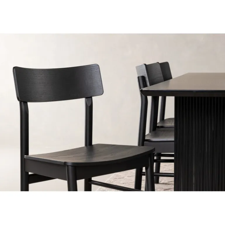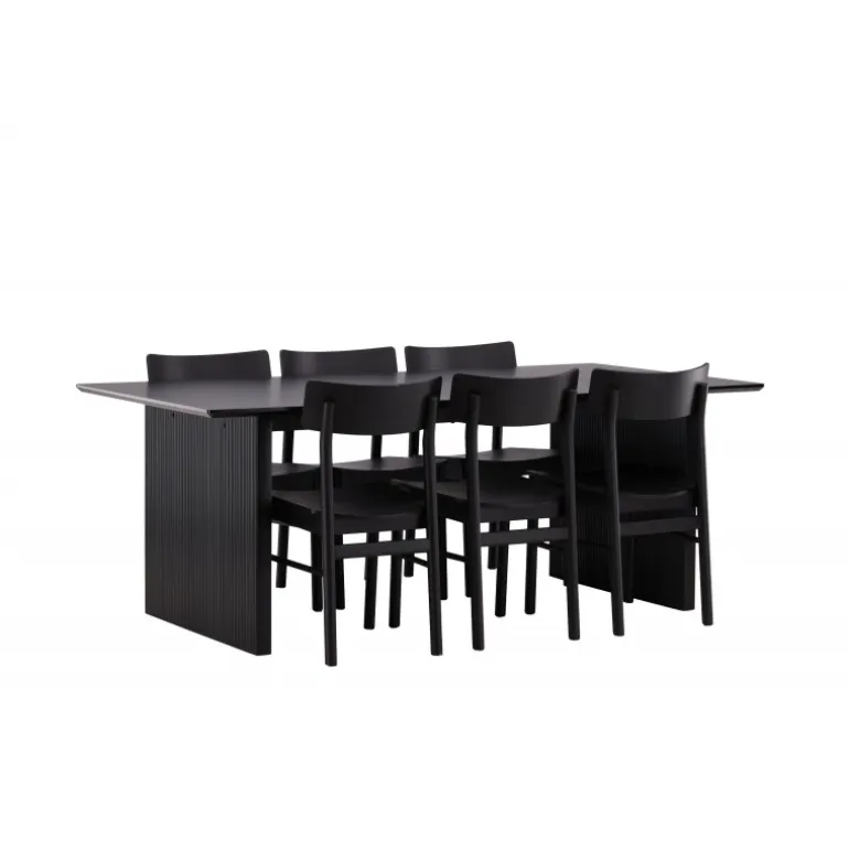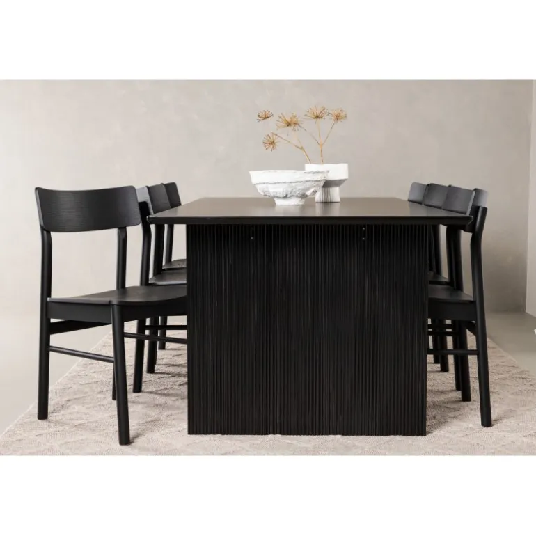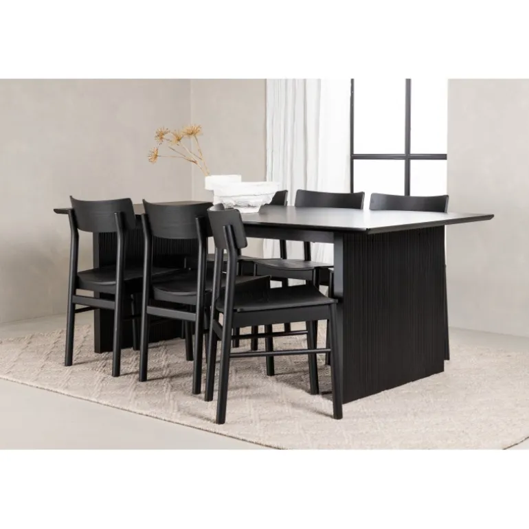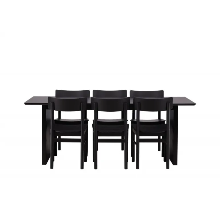 Intet kan gå galt med en stilfuld spisestuegruppe i en helt sort farve! Vores rektangulære spisebord fra Vail-serien har lige nordiske former og er lavet af holdbart MDF i en sodsort farve. Bordpladen er tynd og balancerer på to robuste træplader, der udgør understellet – lige så pænt som det er holdbart. Her i perfekt match med vores populære spisebordsstole Montros. Stolen har et klassisk og nostalgisk design med lige nordiske former, alt sammen lavet af sort gummitræ. Indret din stue klassisk og indbydende!