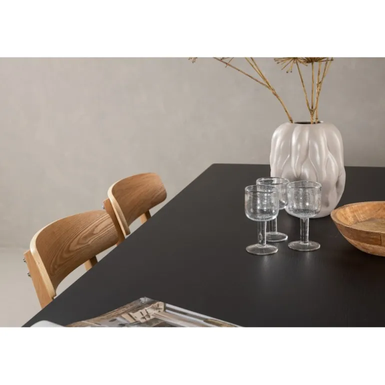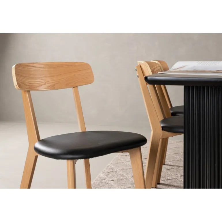 Det er et match! Vores rektangulære spisebord fra Vail-serien har lige nordiske former og er lavet af holdbart MDF i en sodsort farve. Bordpladen er tynd og balancerer på to robuste træplader, der udgør understellet – lige så pænt som det er holdbart. Her i perfekt kombination med vores smagfulde spisestole fra Sanjos-serien. Stolen tilhører Venture Home-kollektionen og har et fantastisk design i farverne sort og naturtræ. Det bløde sæde er skumfyldt for ekstra komfort og har et trendy PU-stof i sort. Ryggen og benene er lavet af lyst træ og giver indtryk af et klassisk design. Møbler stilfuldt og klassisk!