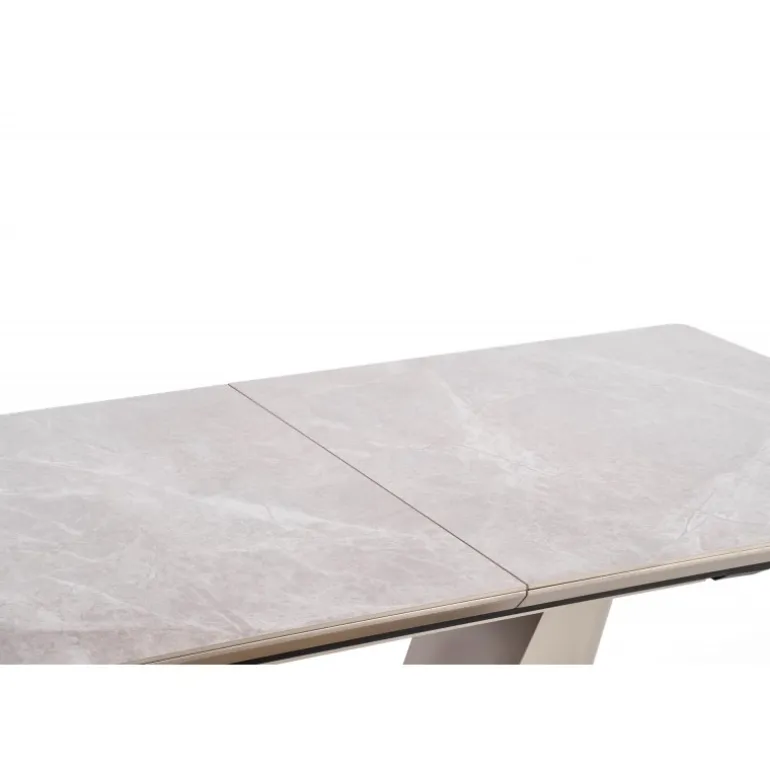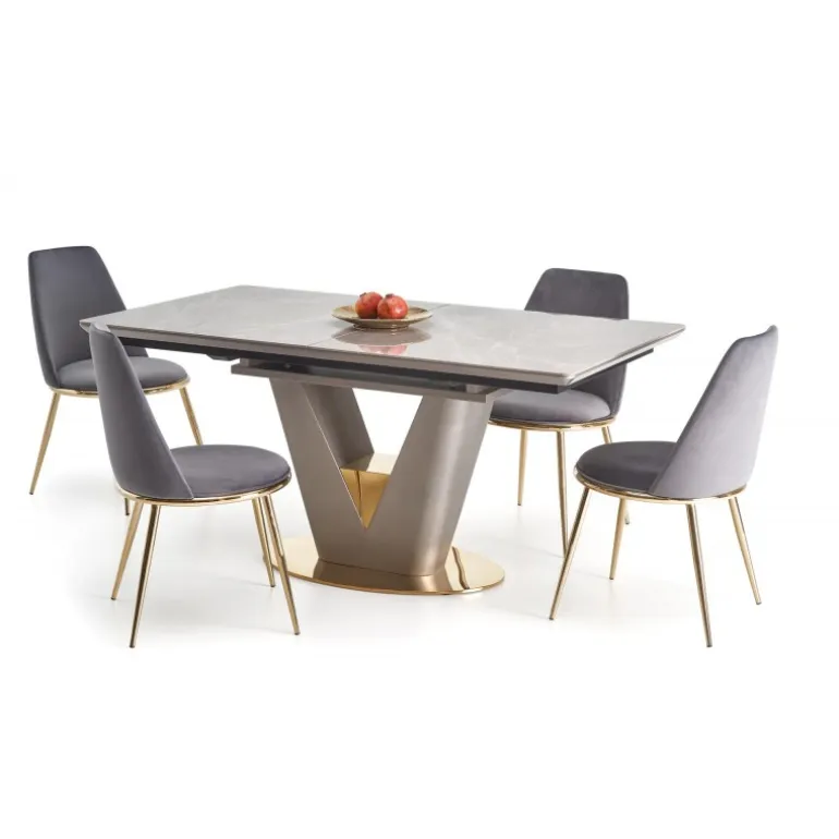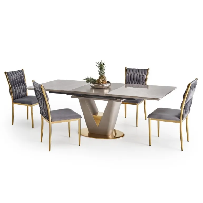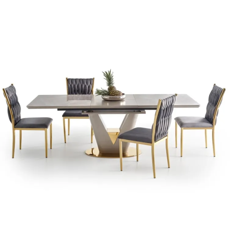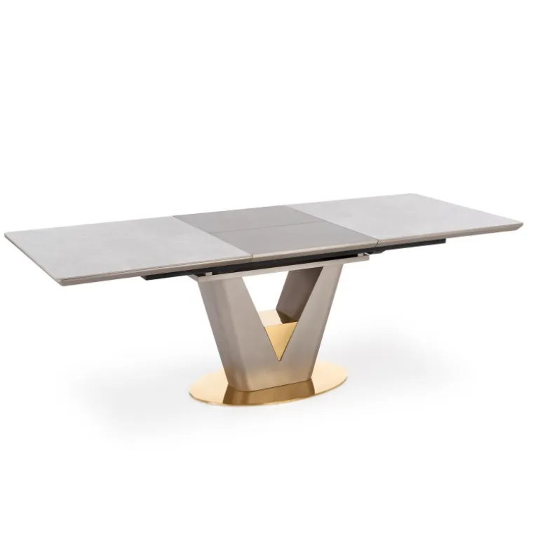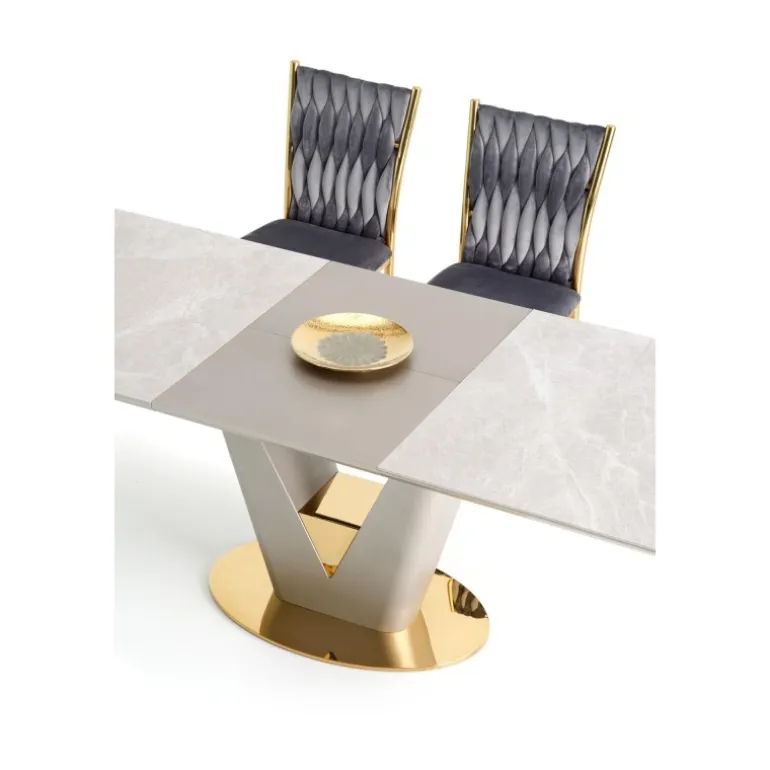 Oplev den tidløse elegance med VALENTINO bord i lys grå og guld. Dette forlængelsesbord kombinerer keramik og lakeret MDF for en holdbar og stilfuld overflade, mens benene i kromstål giver ekstra stabilitet. Bordets grå marmorerede top og lys grå/guld ben tilføjer et luksuriøst touch til dit hjem. Perfekt til både hverdagsbrug og specielle anledninger, med dimensioner på 160-220/90/76 cm som giver fleksibilitet og plads til flere gæster.