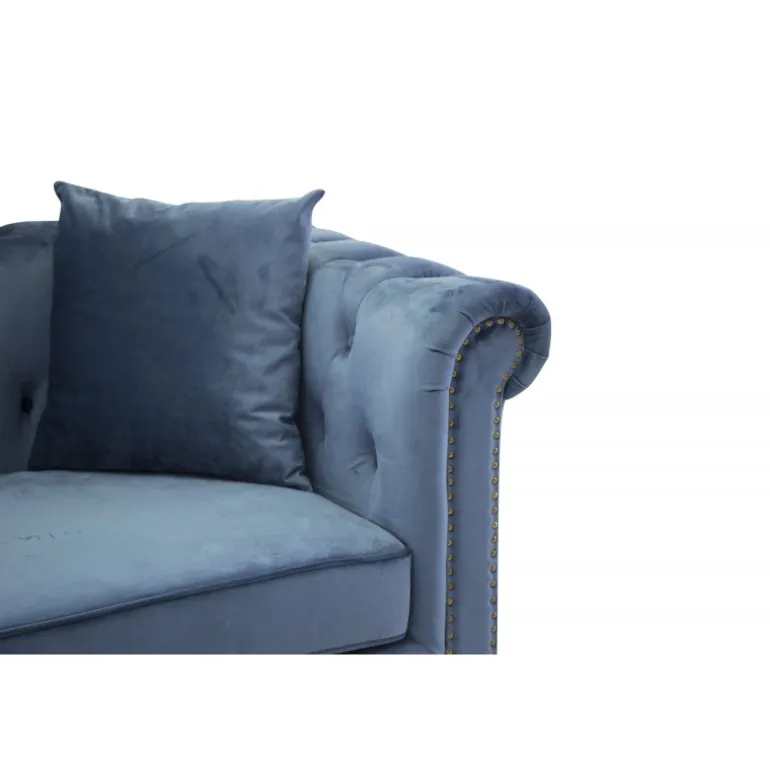 Kombinér moderne design med traditionelt håndværk og dekorer dit hjem med et dristigt farveklik! Velvet er en stilfuld sofaserie i Chesterfield-design med lækkert fløjlstof og dekorative dybdeknapper. Denne rummelige og komfortable 3 personers sofa med lige design og blåt fløjl skaber en kunstnerisk og smuk følelse i dit hjem. De rustikke træsofabben bidrager til sofaens elegante design og moderne udseende. Pop hverdagen med denne lækre sofa i stuen! Plejeråd: Fløjl har tendens til at få trykmærker, når bunken lægger sig. Aftrykkene kan få stoffet til at se slidt ud, hvilket er helt normalt for denne type materiale. Afhængig af hvordan lyset falder, kan stoffet skifte i forskellige nuancer.